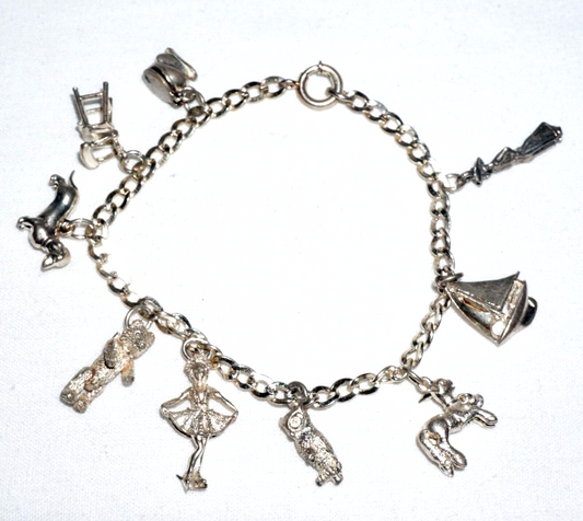 Vintage Sterling Silver Charm Bracelet w. 9x Charms Ballerina Wiener Dog (BrM)#6