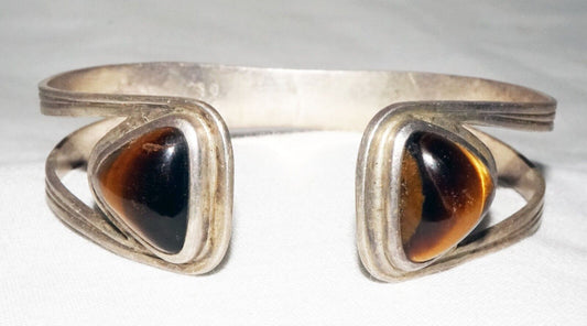 Vintage Swedish Modernist Sterling Silver Cuff Bracelet w. 2x Tigereye (ShI)