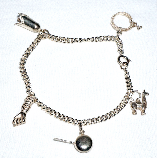 Vintage Unmarked Silver Charm Bracelet w. 5x Charms Lama Bell Oil Can (BrM)#6