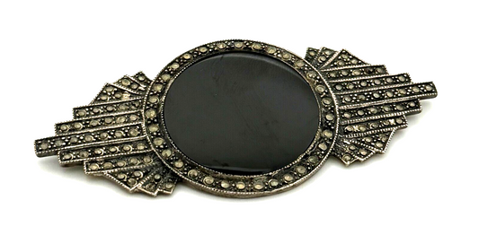 Vintage Sterling Art Deco Silver Brooch w Black Onyx & Marcasite Accents (TuC)