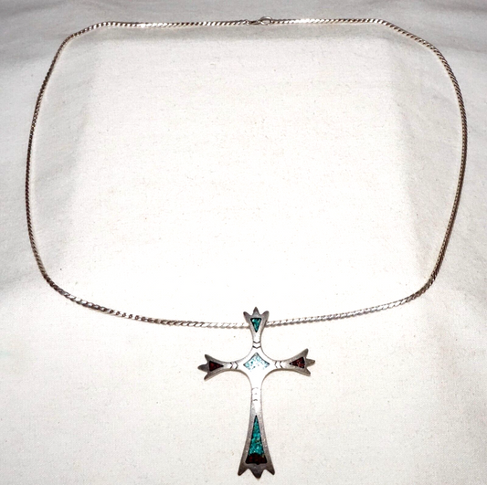 Vtg S.W. US Sterling Silver Necklace & Cross Pendant w. Turquoise & Coral (BeM)