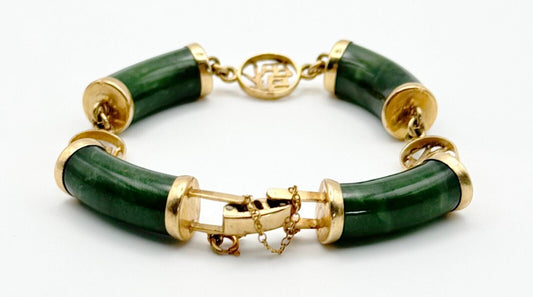 14k Gold & Spinach Green Jade Link Bracelet w Chinese Character Accents (1450)