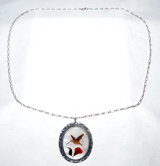 Vintage S.W. US Sterling Silver Necklace MoP & Humming Bird Inlay Pendant (BeM)