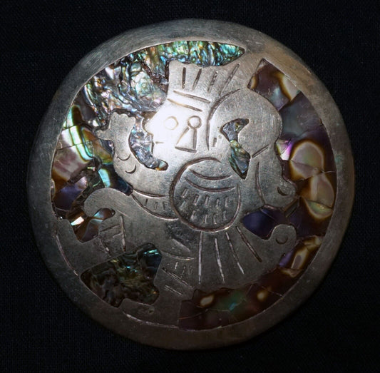Vintage Mexican Indigenous Motif Sterling Silver & MoP Brooch Pendant (FeH)
