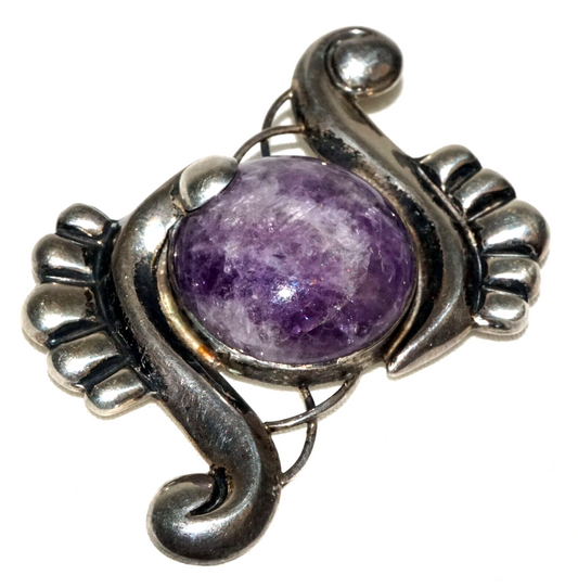 Vtg Mexican Modernist Sterling Silver Scroll Motif & Amethyst Brooch (KoS) L10