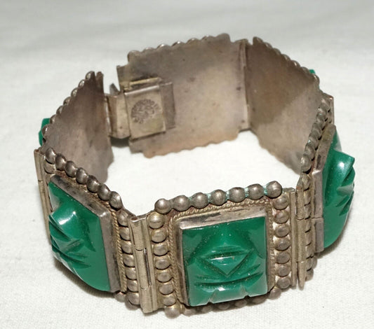 Vtg Mexican Modernist Sterling Silver & Green Synthetic Accents Bracelet (TuD)