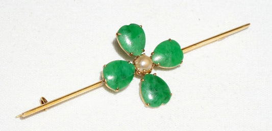 Vtg Chinese 18k Yellow Gold Four Leafed Clover Jadeite Jade & Pearl Brooch (InS)