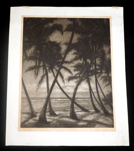 1930s Hawaii Aquatint Print Moonlit Waikiki Palms by Huc M. Luquiens (LLA)