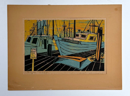 Mid-Century Hawaii 4-Color Woodcut "Sampan Wharf" by John I. Kjargaard (KoR)