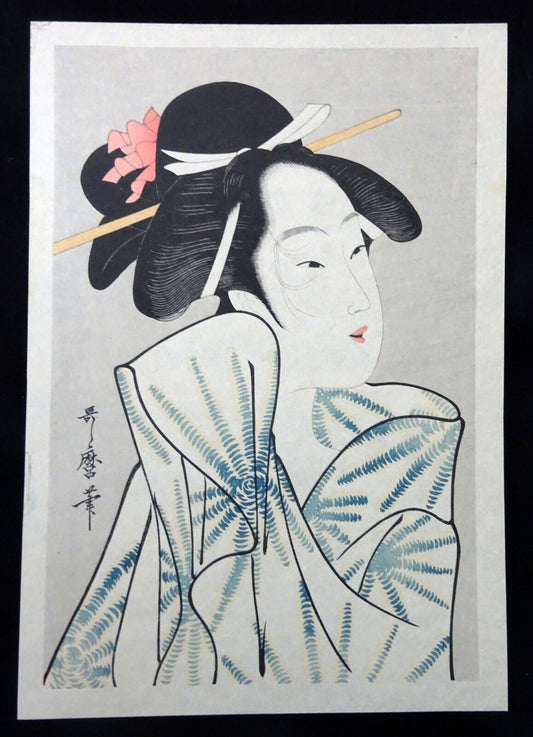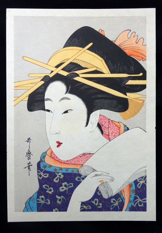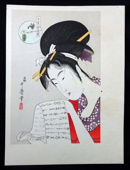 Vintage Japanese Woodblock Print Repro Geisha Holding Paper by Utagawa (Fuj)