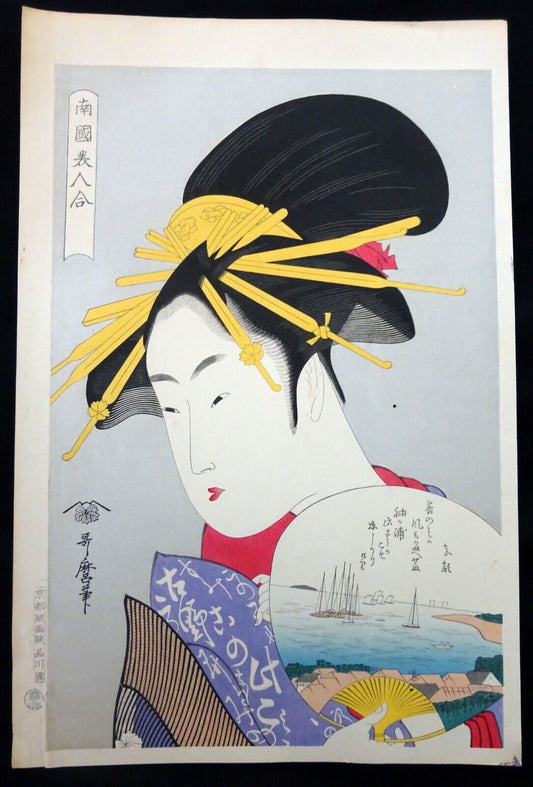 Vintage Japanese Woodblock Print Repro Courtesan Holding Fan by Utagawa (Fuj