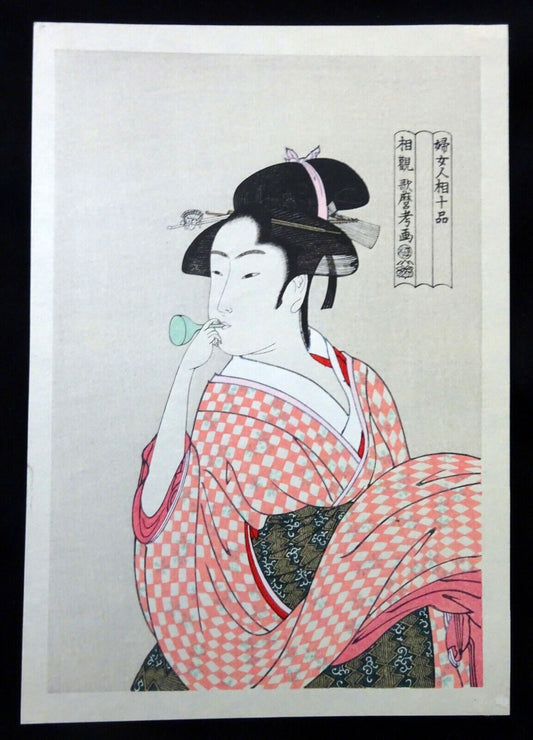 Vintage Japanese Woodblock Print Repro Women Blowing Glass Pipe by Utagawa (Fuj)