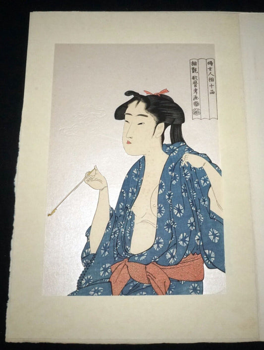 Vintage Japanese Woodblock Repro Print Beauty Smoking by Kitagawa Utamaro (OdC)