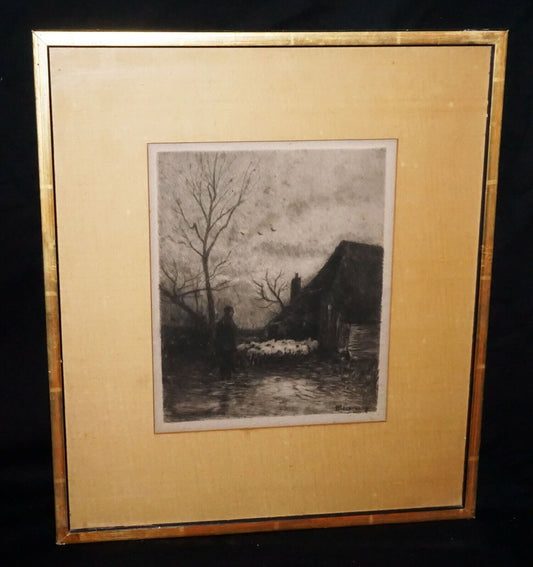 1890s German Etching Print Shepherd before Dawn Helmut Liesegang (1858-1945)(***