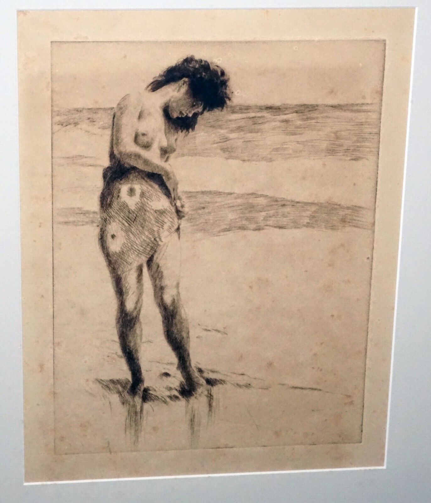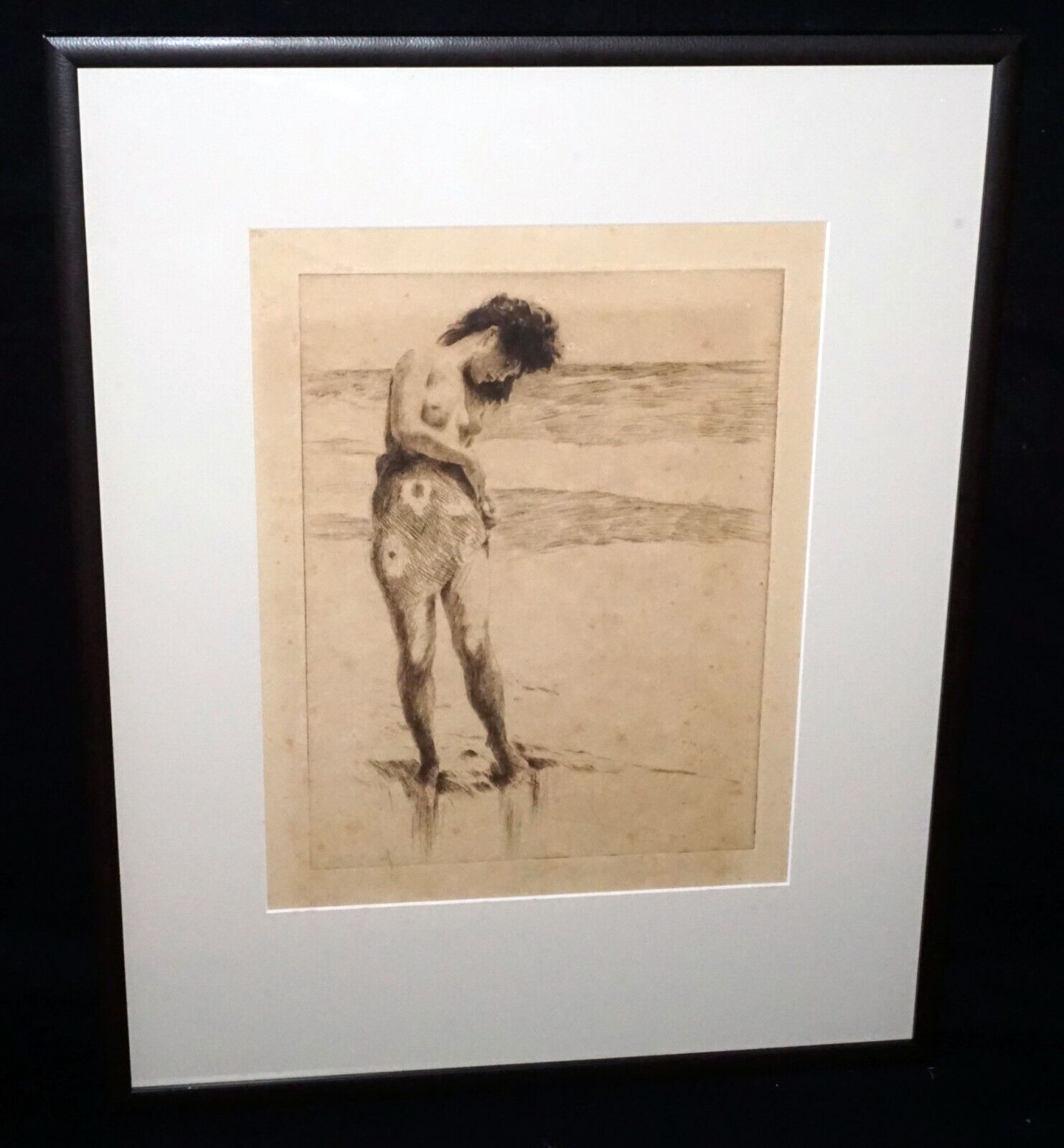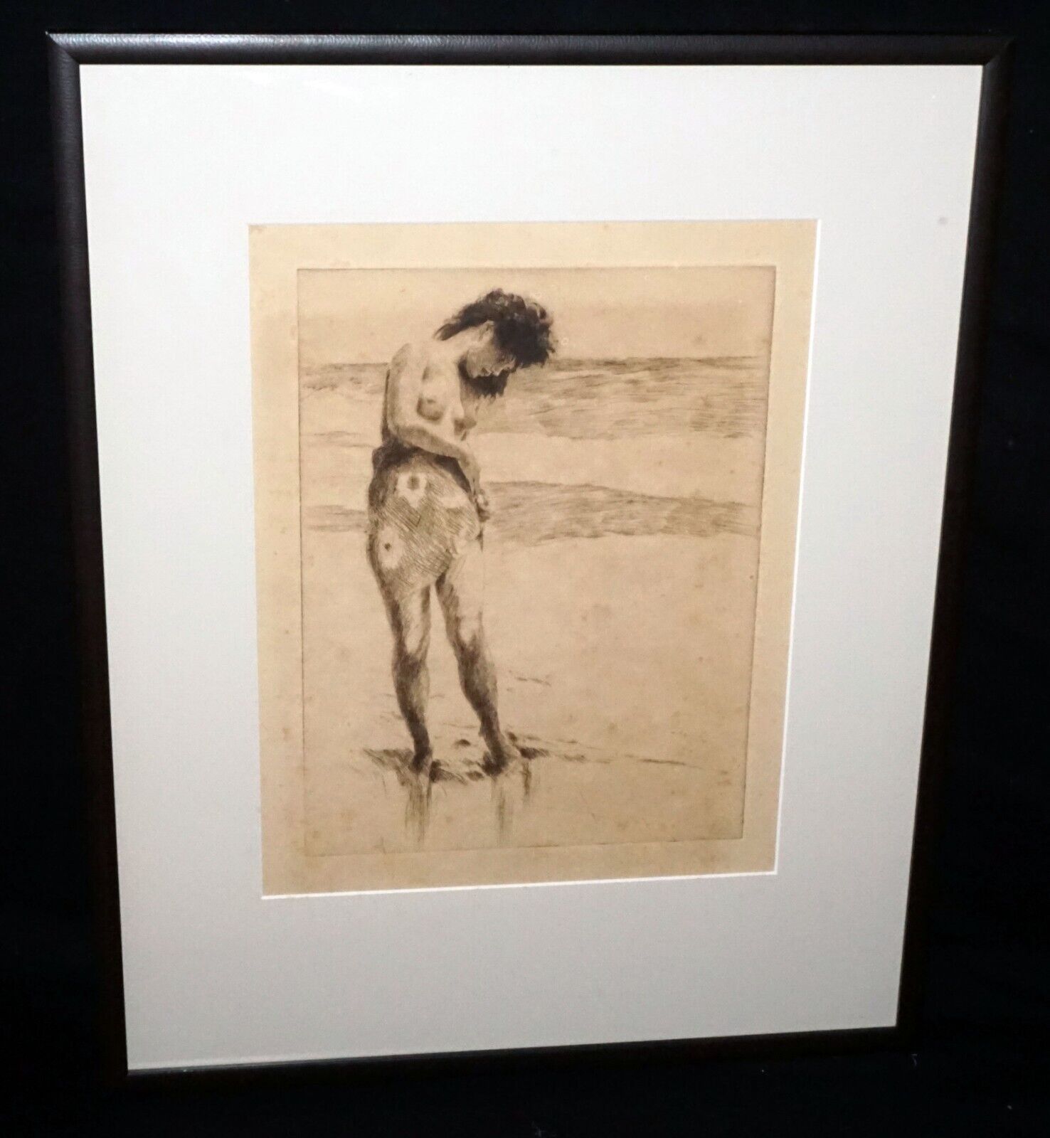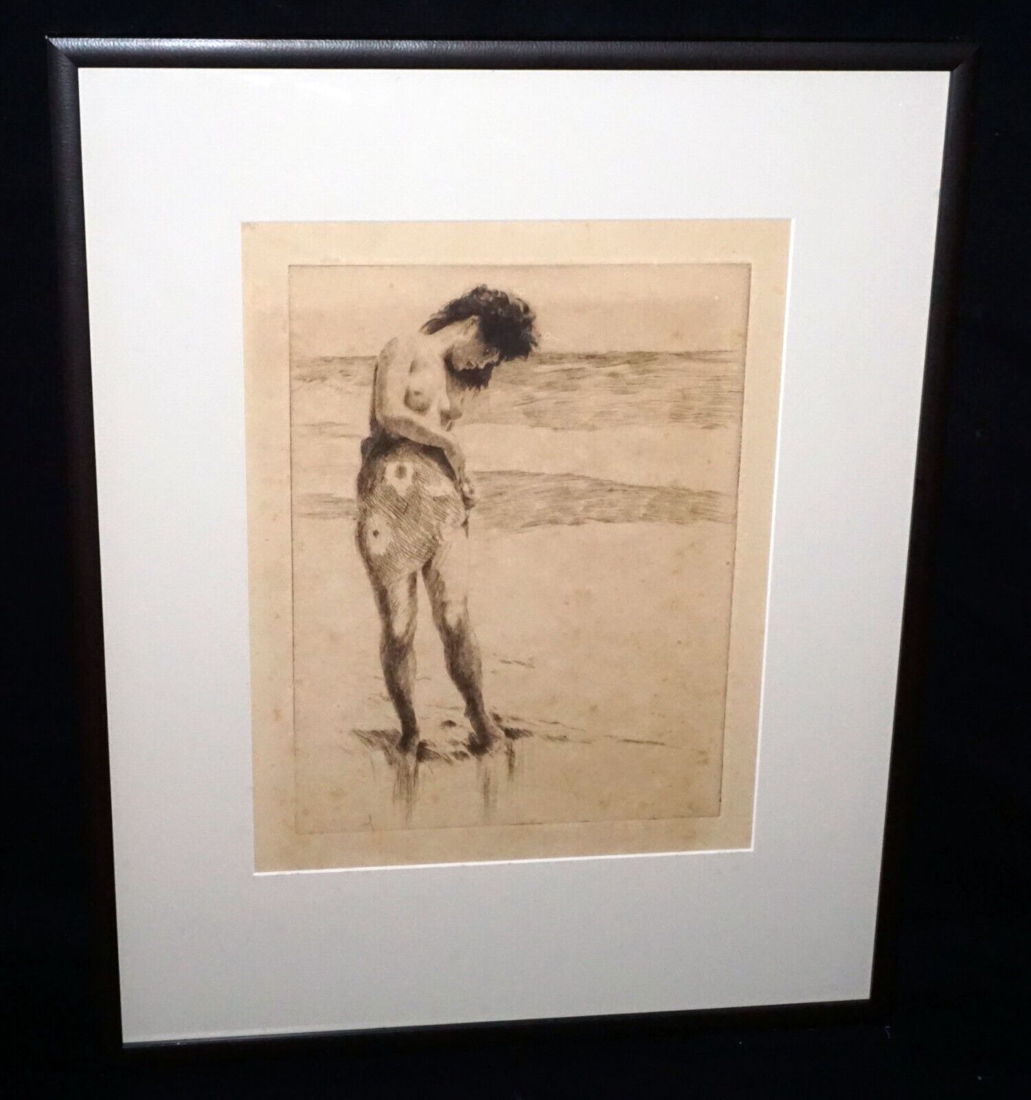 Up for sale from a recent client in Honolulu Hawaii this 1937 Hawaii black and white etching on paper print that is titled "Nanea on the Beach" and was created by the well known local artist John Melville Kelly (1879-1962). The condition is described above - for more information please check the photos. In case you would like the print to be cleaned I am working with a great paper conserver it will take between 4-6 weeks and I am getting a discount due to the volume I do with them that I am happy to extend to you.