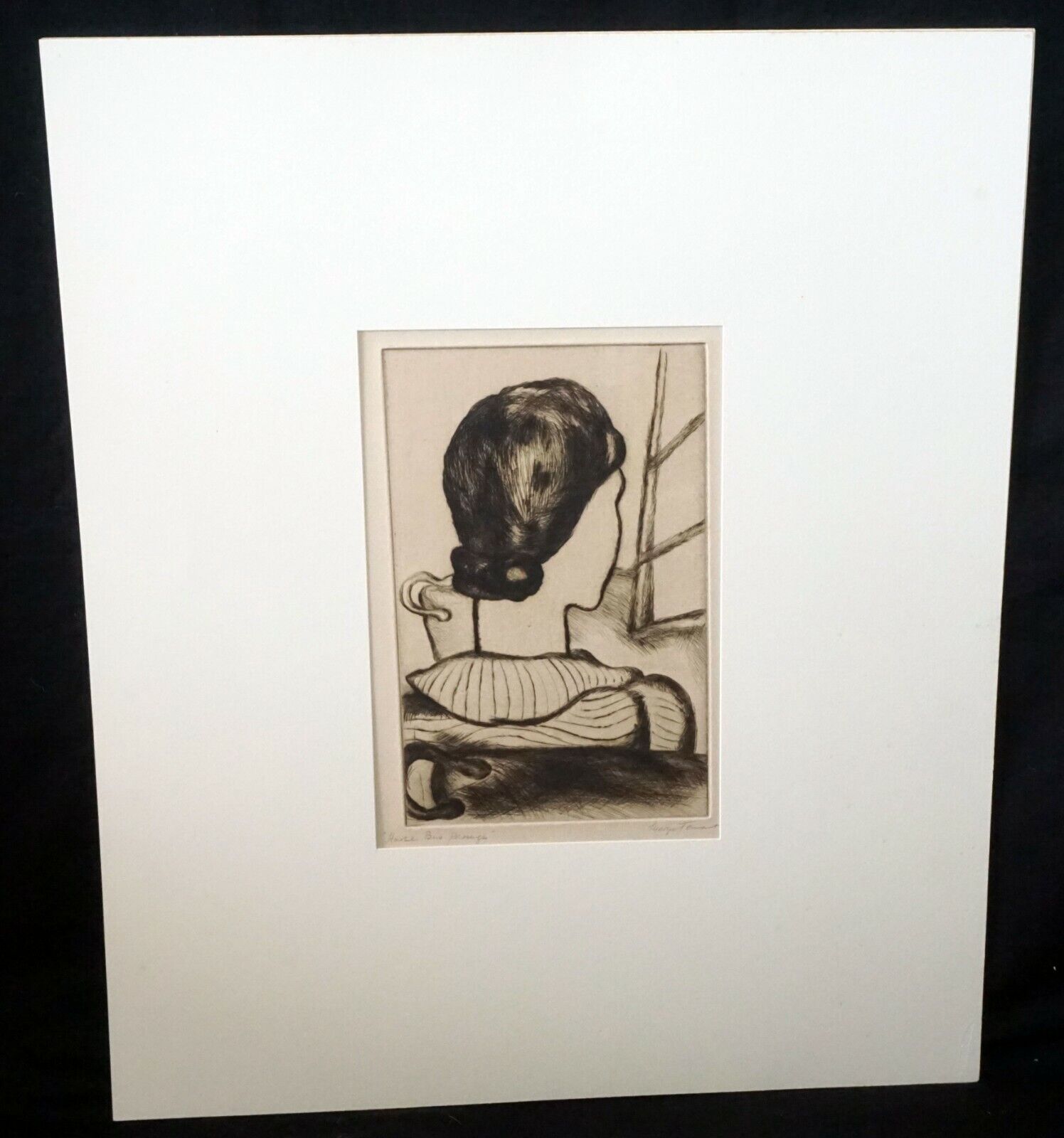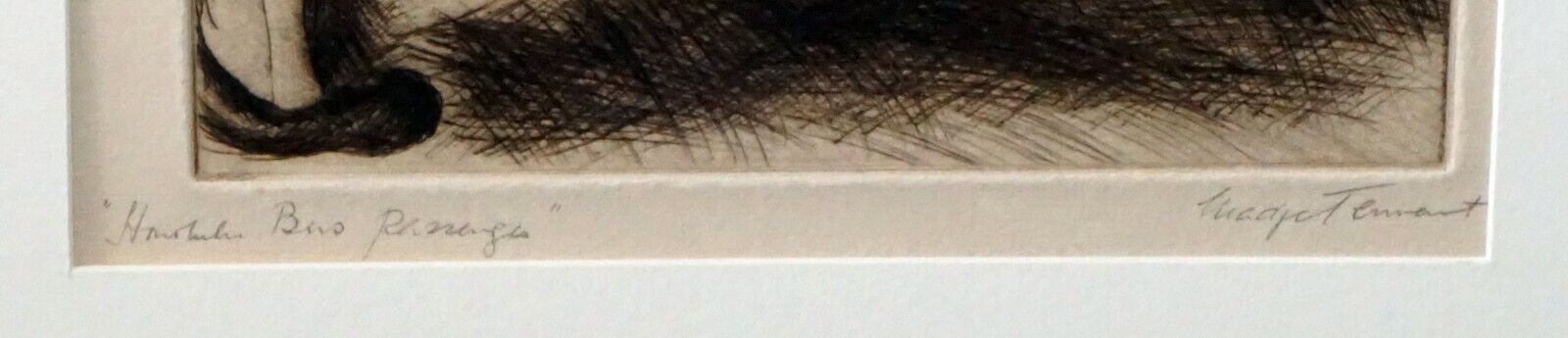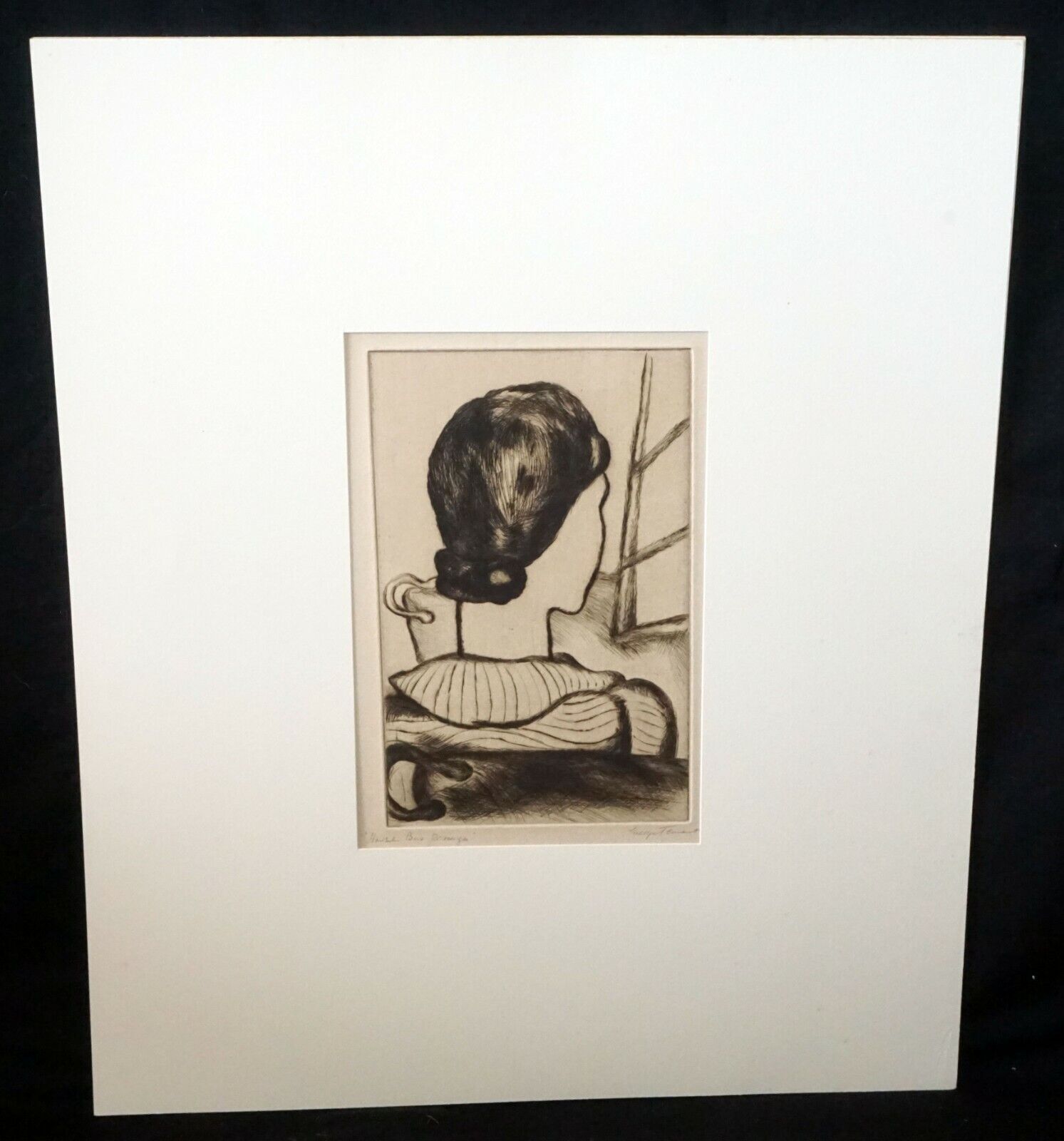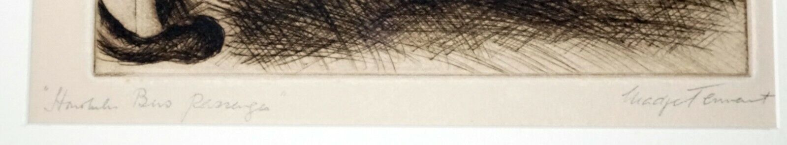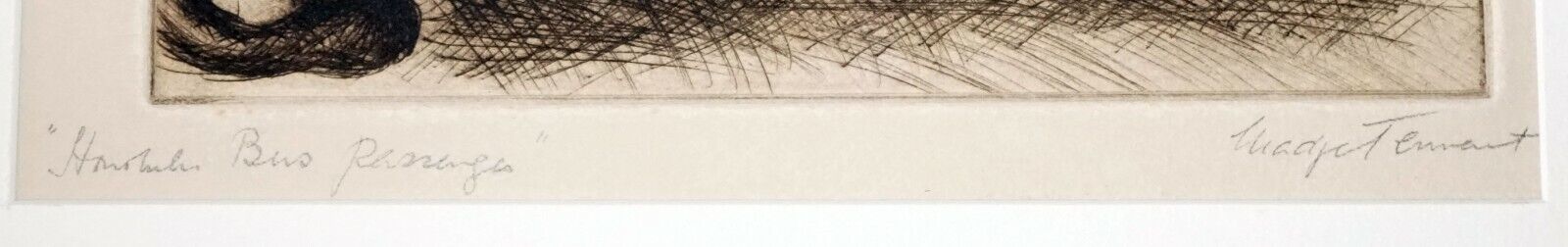 Up for sale from a recent estate in Honolulu Hawaii, this 1938 Hawaii matted etching print that is titled "Honolulu Bus Passenger" depicting a female figure seated in the bus and was created by the locally well known artist Madge Tennent (1889-1972). The condition is described above for more information please check the photos. This an the other Tennent pieces that will be listed in our store come from the estate of a well known collector of the artists work. The name will be furnished after the purchase.