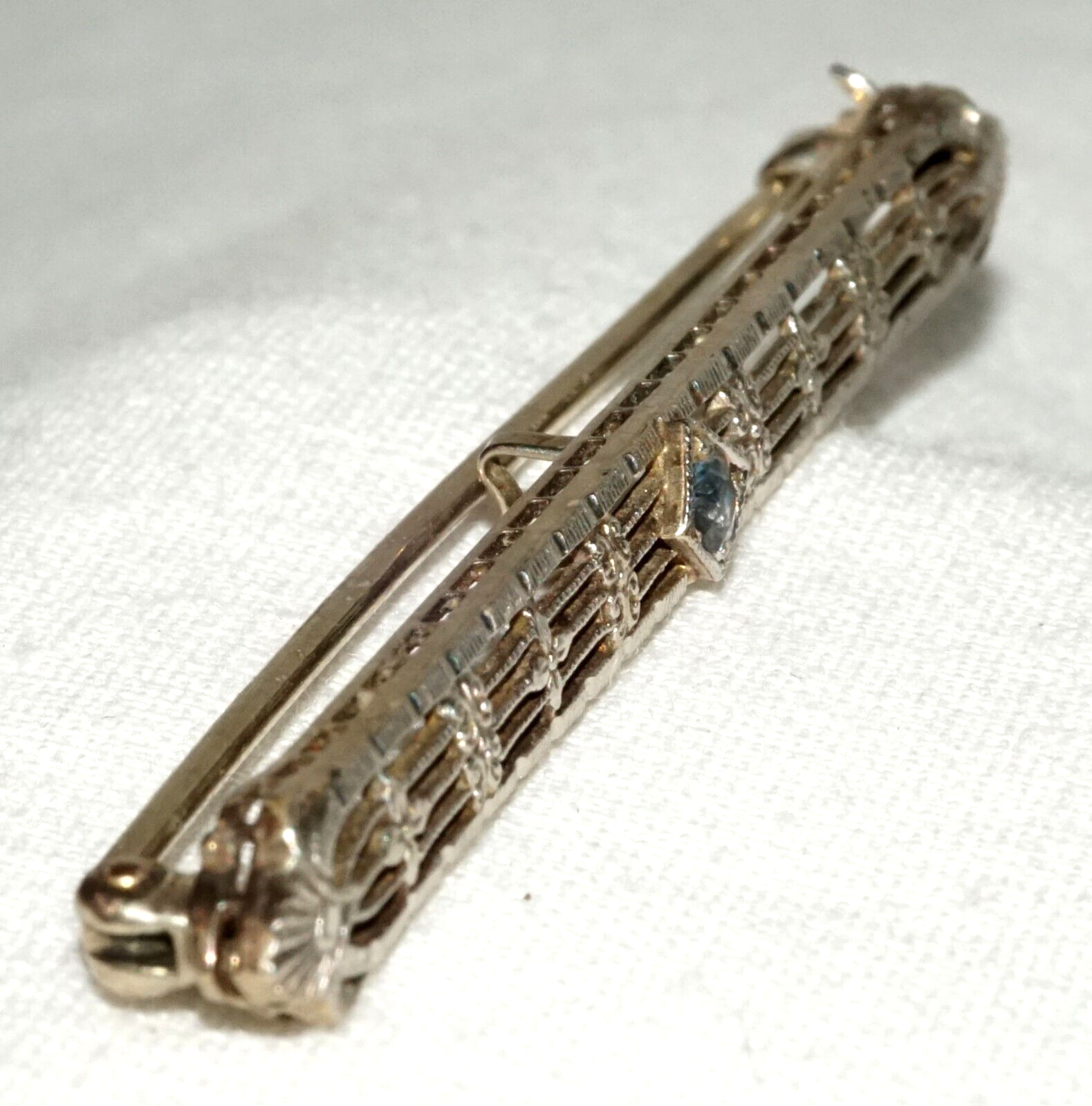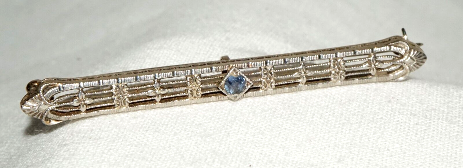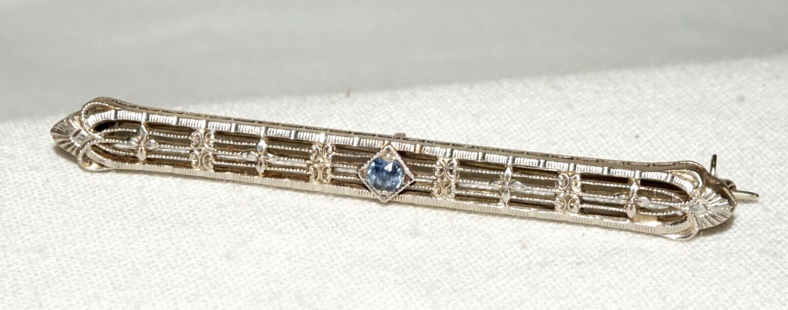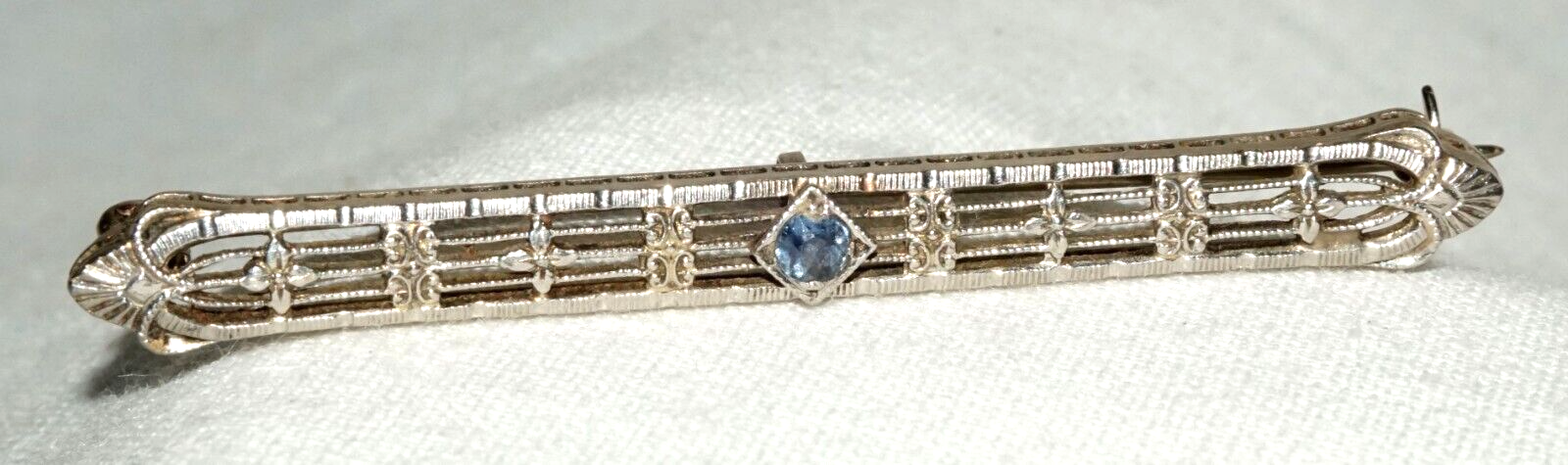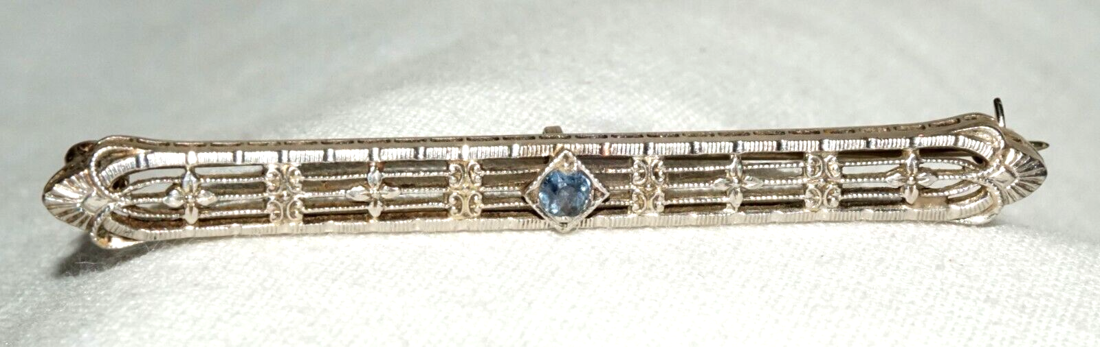 Art Deco 14k W. Gold Filigree Bar Pin w. 1x Pale Blue Topaz Accent (KoS) L20