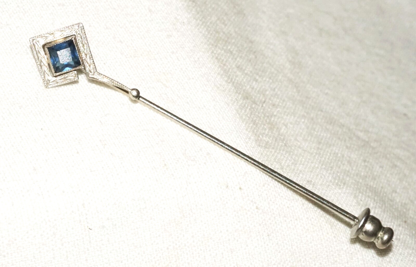 Up for sale from a recent estate in Honolulu Hawaii, this Art Deco unmarked white gold pin (tested 14k) that is bezel set with 1x melee sized square facetted blue glass accent. The condition is described above for more information please check the photos. Free local pick up possible!!!