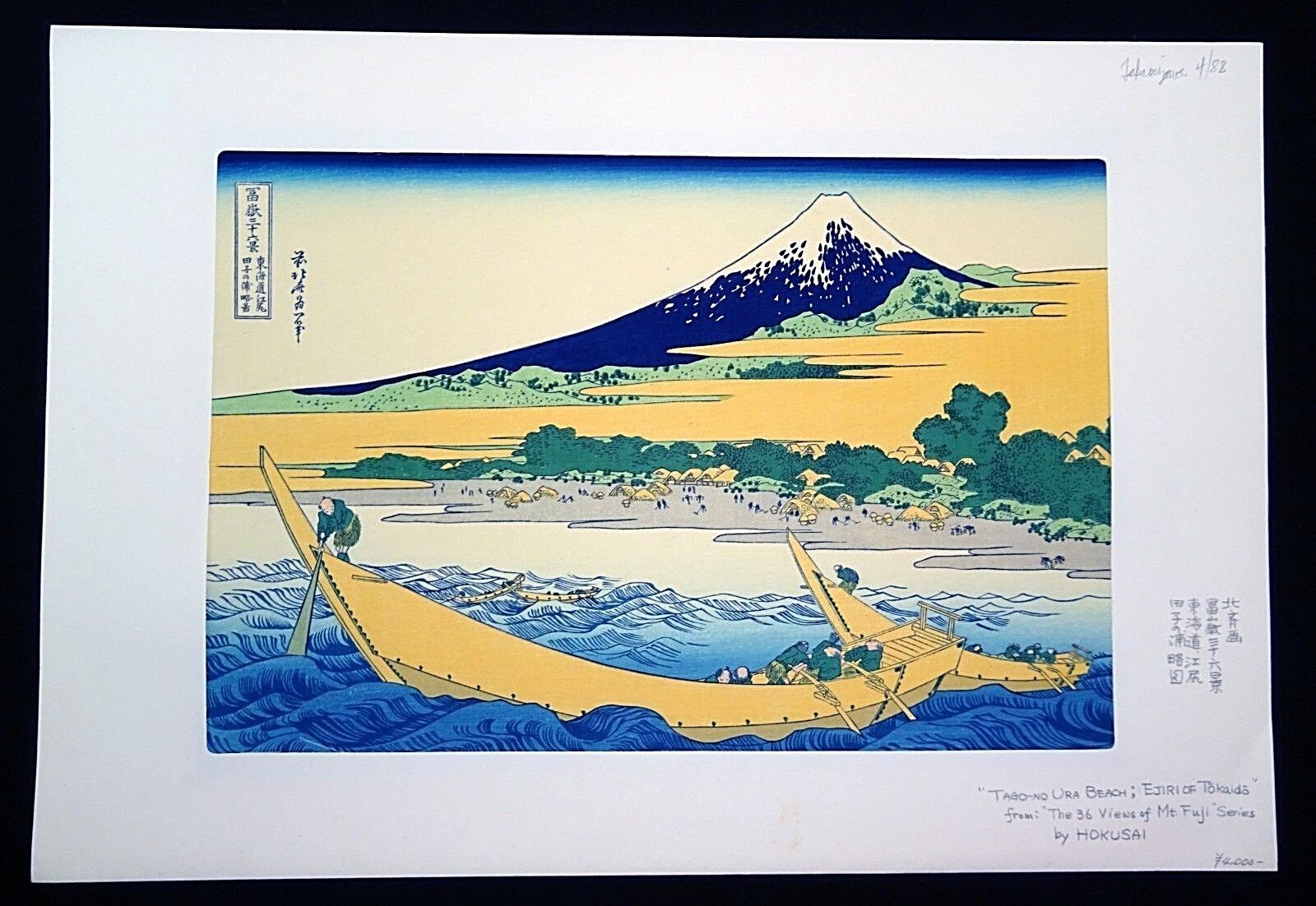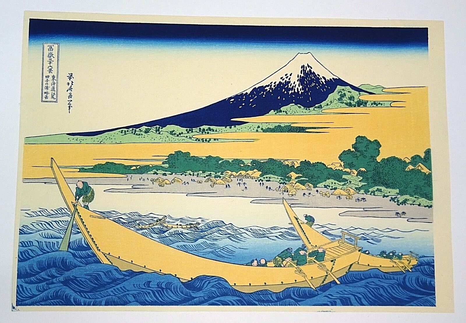 Up for sale from a recent consignor in Honolulu Hawaii, this Vintage Japanese woodblock print reproduction that is titled "Tago-No Ura Beach; Ejiri of Tokaido" depicting figures on boats in a lake and is from the series The 36 views of Mt. Fuji and was created by the well known artist Katsushika Hokusai (1760-1849). The condition is described above for more information please check the photos.
