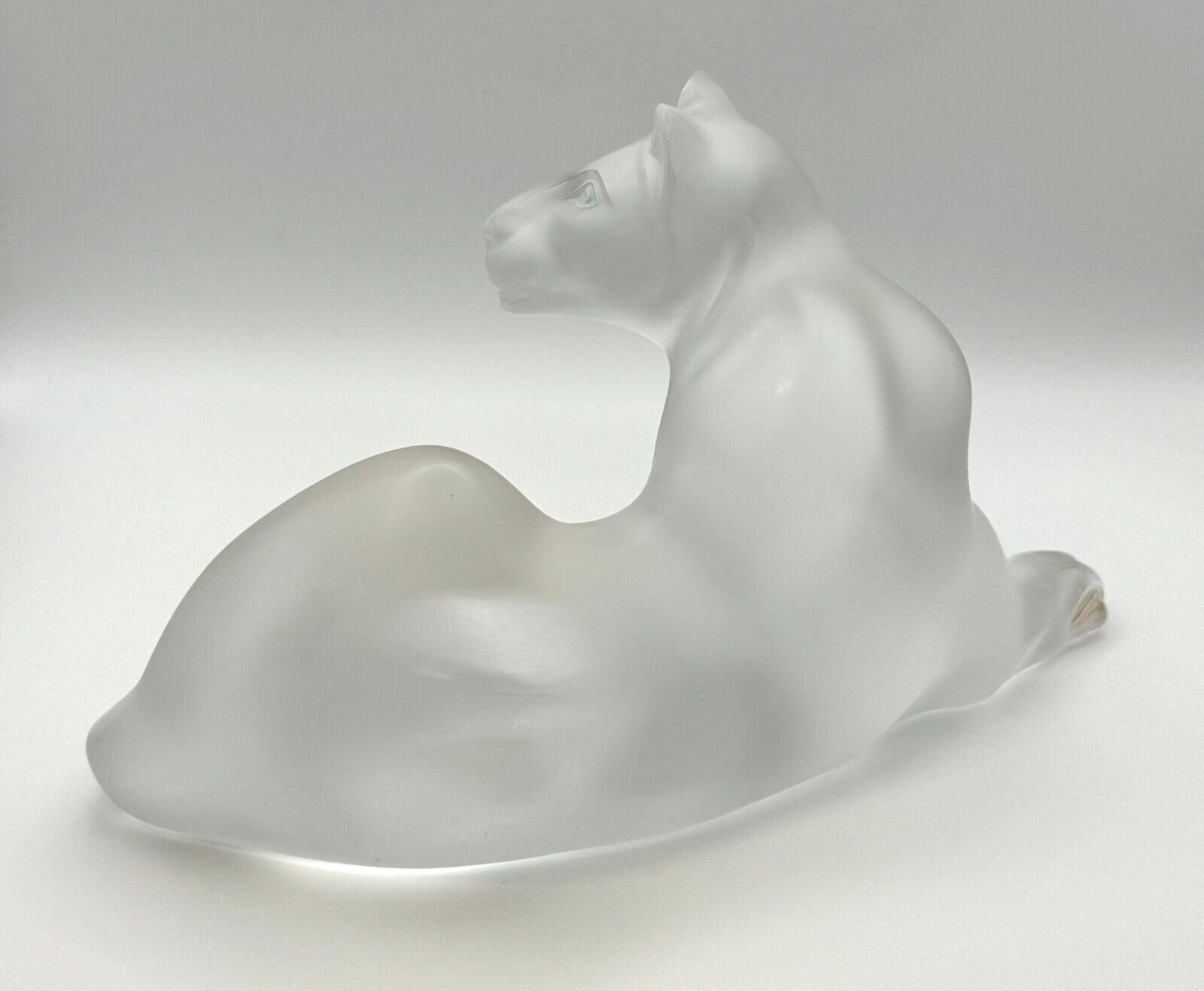 This Lalique Art Glass Crystal Simba Lioness Sculpture is a beautifully crafted piece designed by Marie-Claude Lalique. Created in 1989, this sculpture is part of Lalique's extensive collection of animal-themed artworks. The sculpture depicts a lioness named Simba in a graceful, reclining pose, looking over her shoulder. This piece is crafted using the lost wax casting technique, a traditional method that allows for intricate details and high-quality finishes.