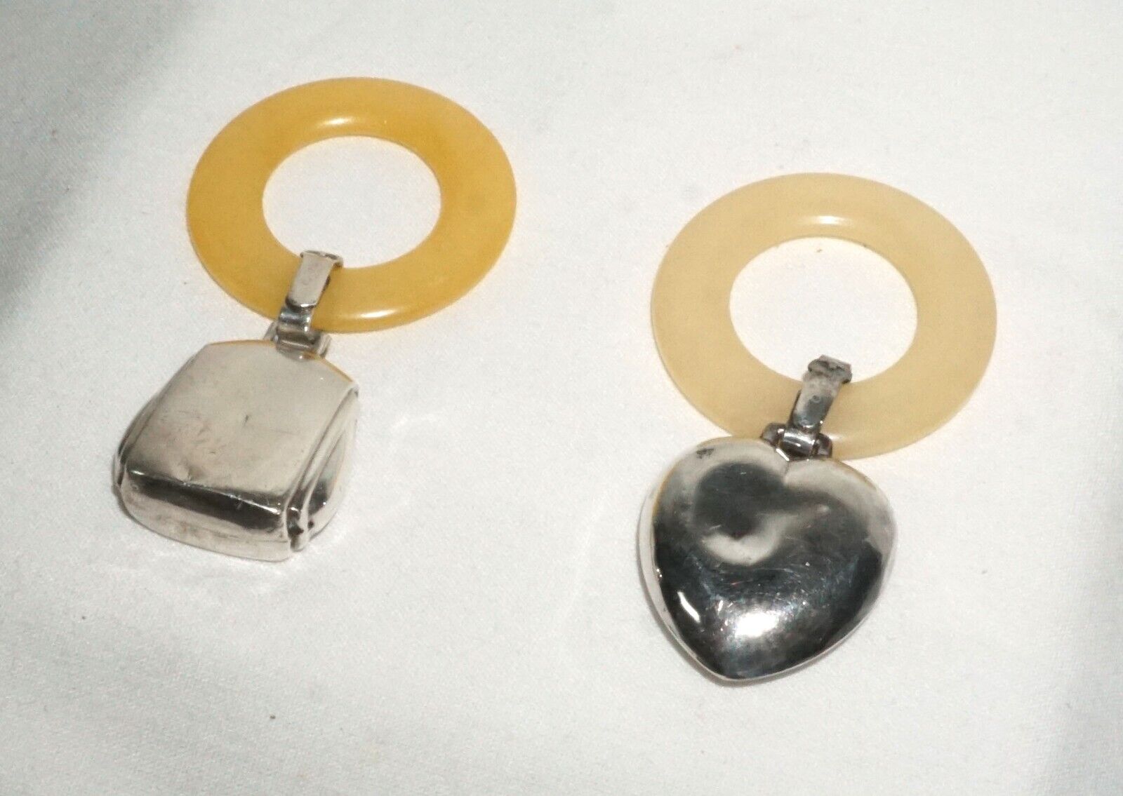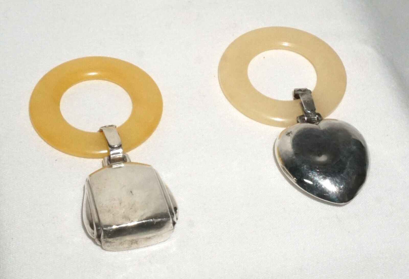 This vintage baby teething lot is a timeless treasure. The rings are made from Webster Silver Co. crafted from sterling silver (.925) with Bakelite teething rings (an early for of plastic) paired with sterling diaper pins that are both functional and beautiful. This lot would make for a lovely addition to any collection, or as a thoughtful gift for parents-to-be. Don't miss out on the chance to own a piece of history with this new baby set.