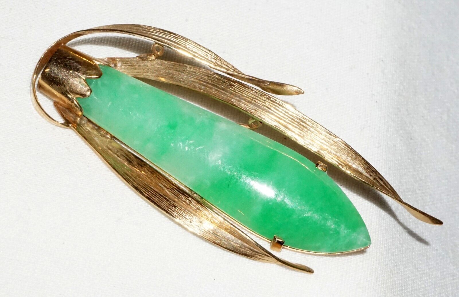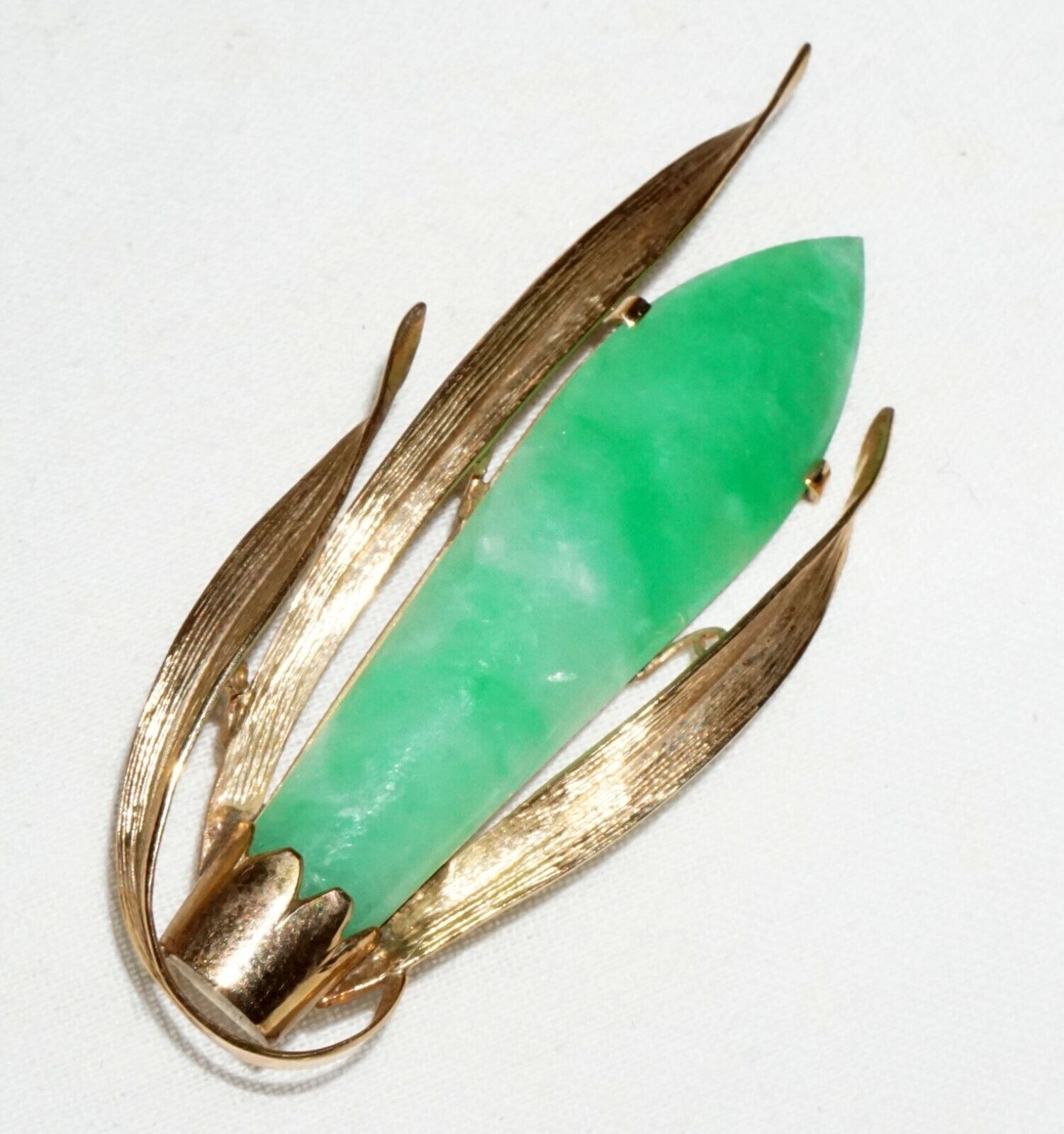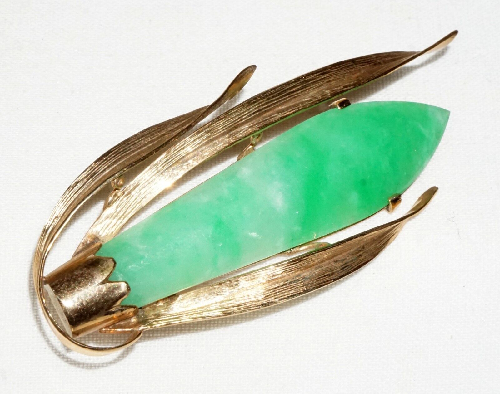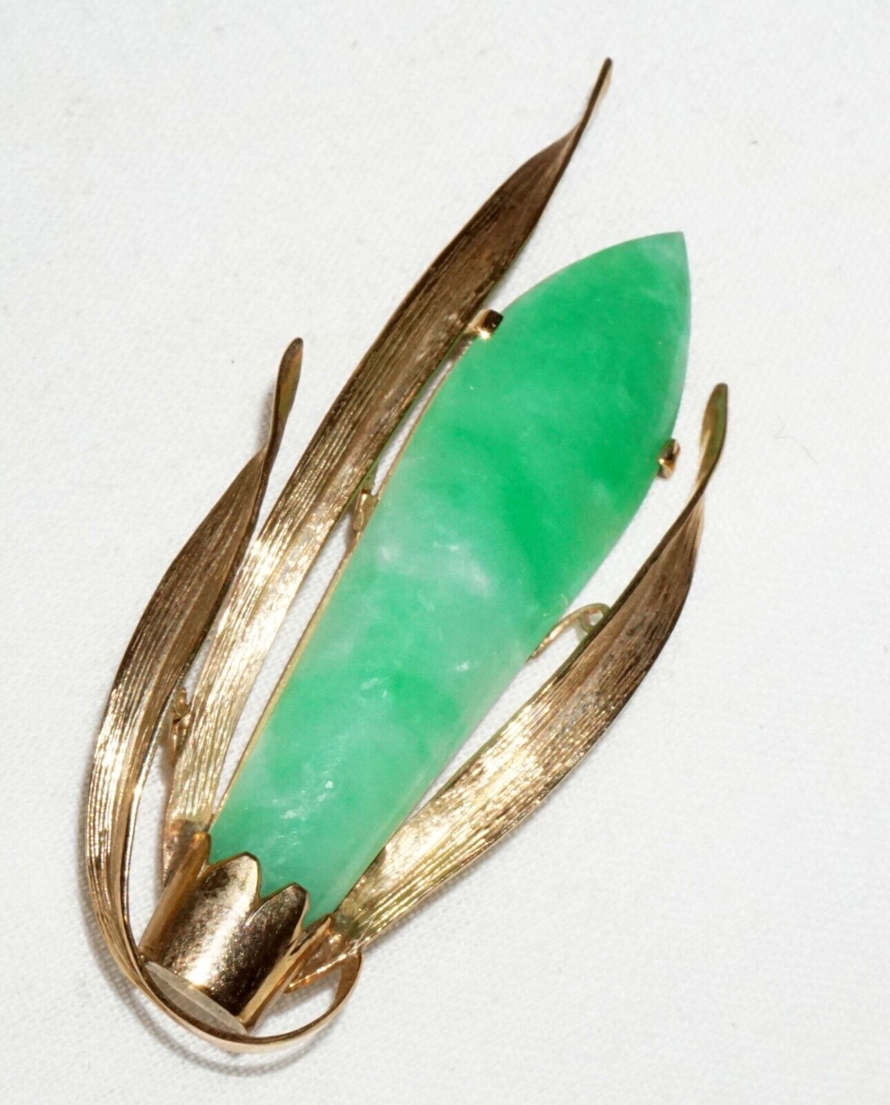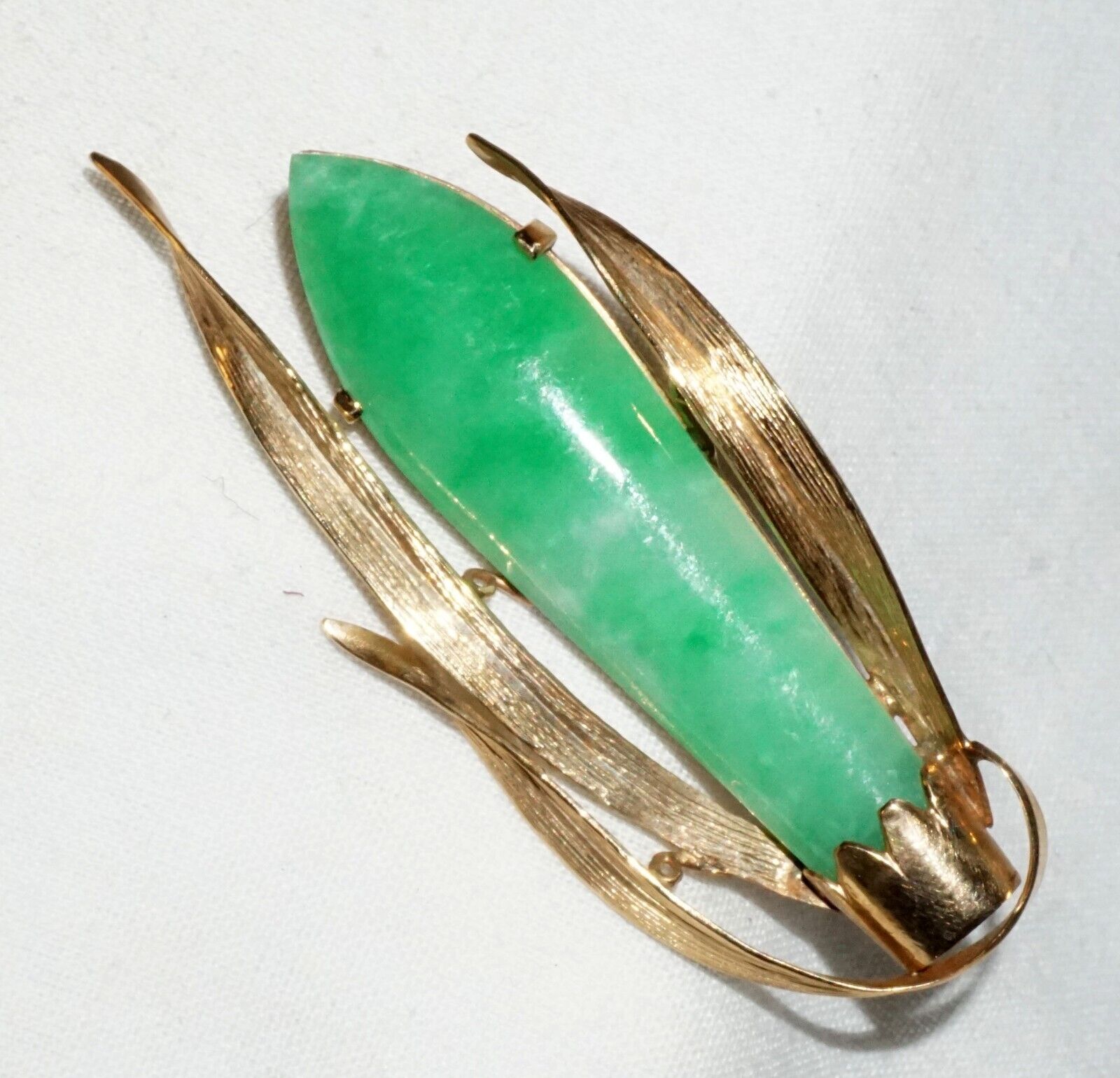 Vintage Chinese 14k Yellow Gold Brooch w. Apple Green Jadeite Jade Ming's (InS)