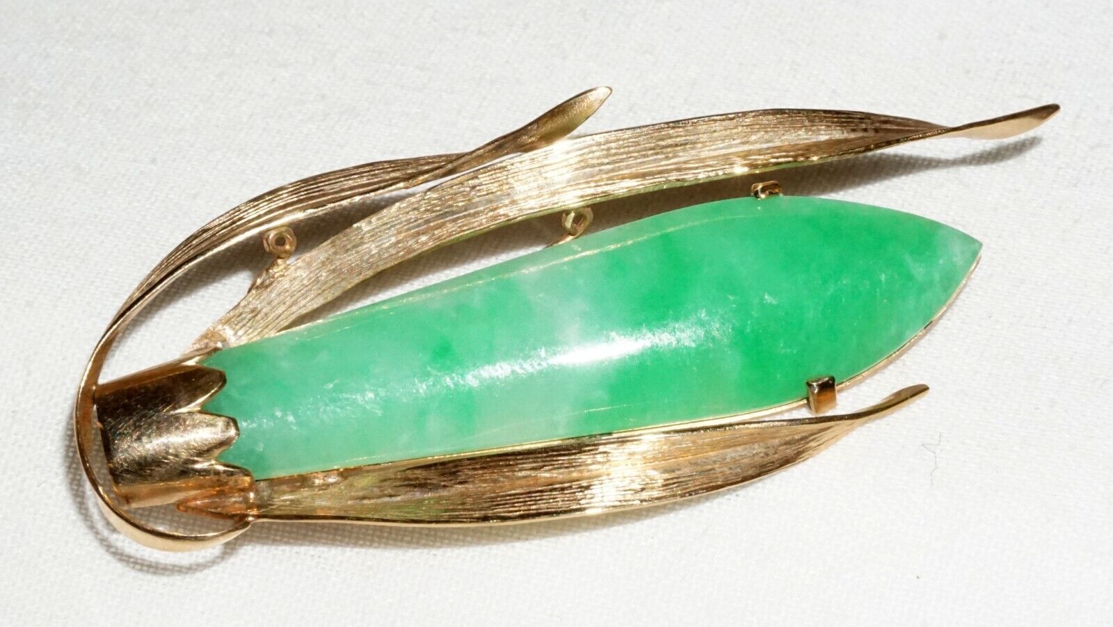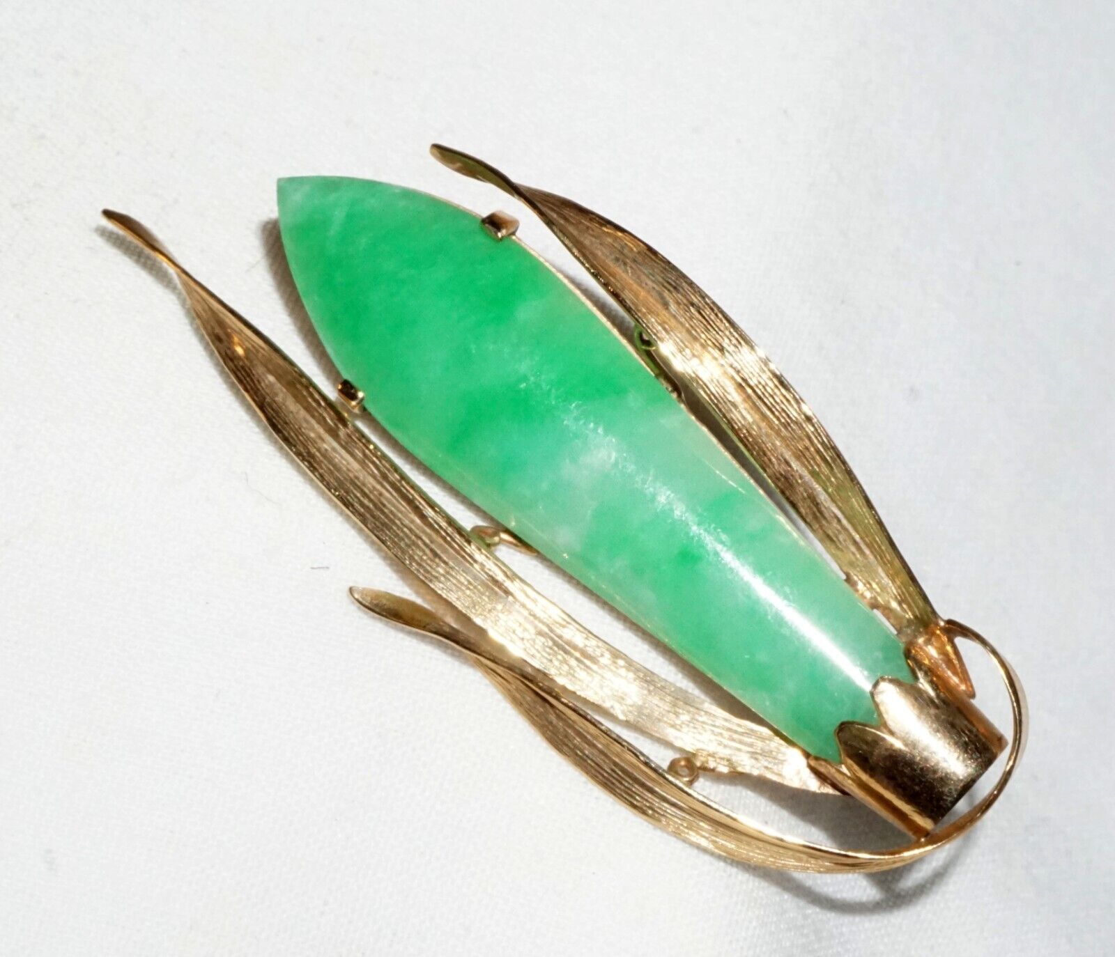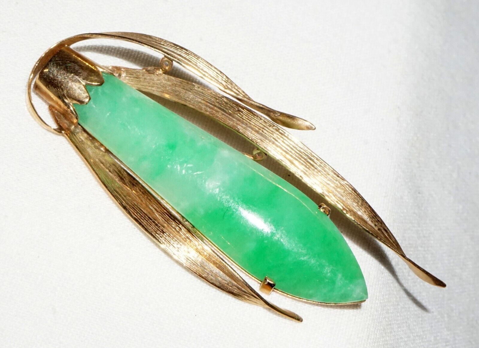 Up for sale from a recent client in Honolulu Hawaii, this Vintage Chinese 14k yellow gold brooch that is prong set with 1x attractive mottled apple green jadeite jade (approx. 47mm x 12.5mm) that was created by well known maker Ming's. The condition is described above for more information please check the photos. Free local pick up possible!!!