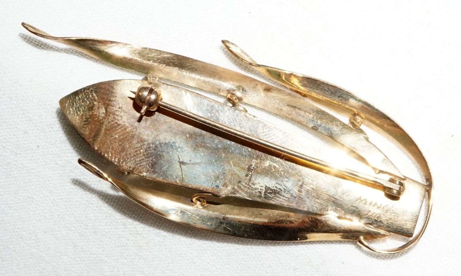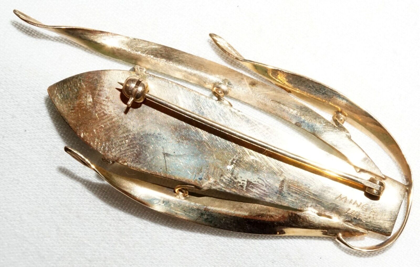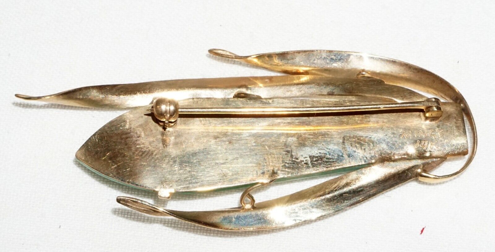 Up for sale from a recent client in Honolulu Hawaii, this Vintage Chinese 14k yellow gold brooch that is prong set with 1x attractive mottled apple green jadeite jade (approx. 47mm x 12.5mm) that was created by well known maker Ming's. The condition is described above for more information please check the photos. Free local pick up possible!!!