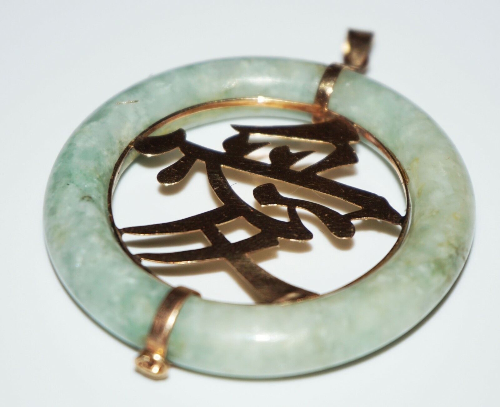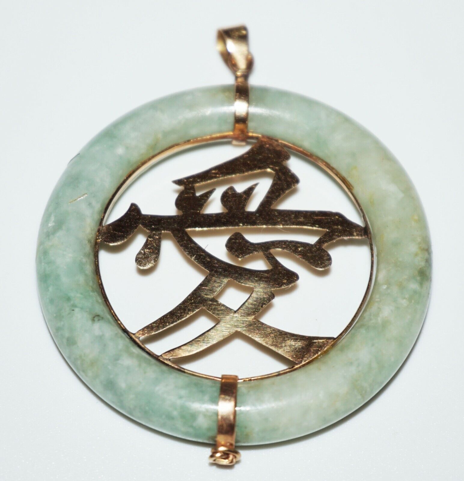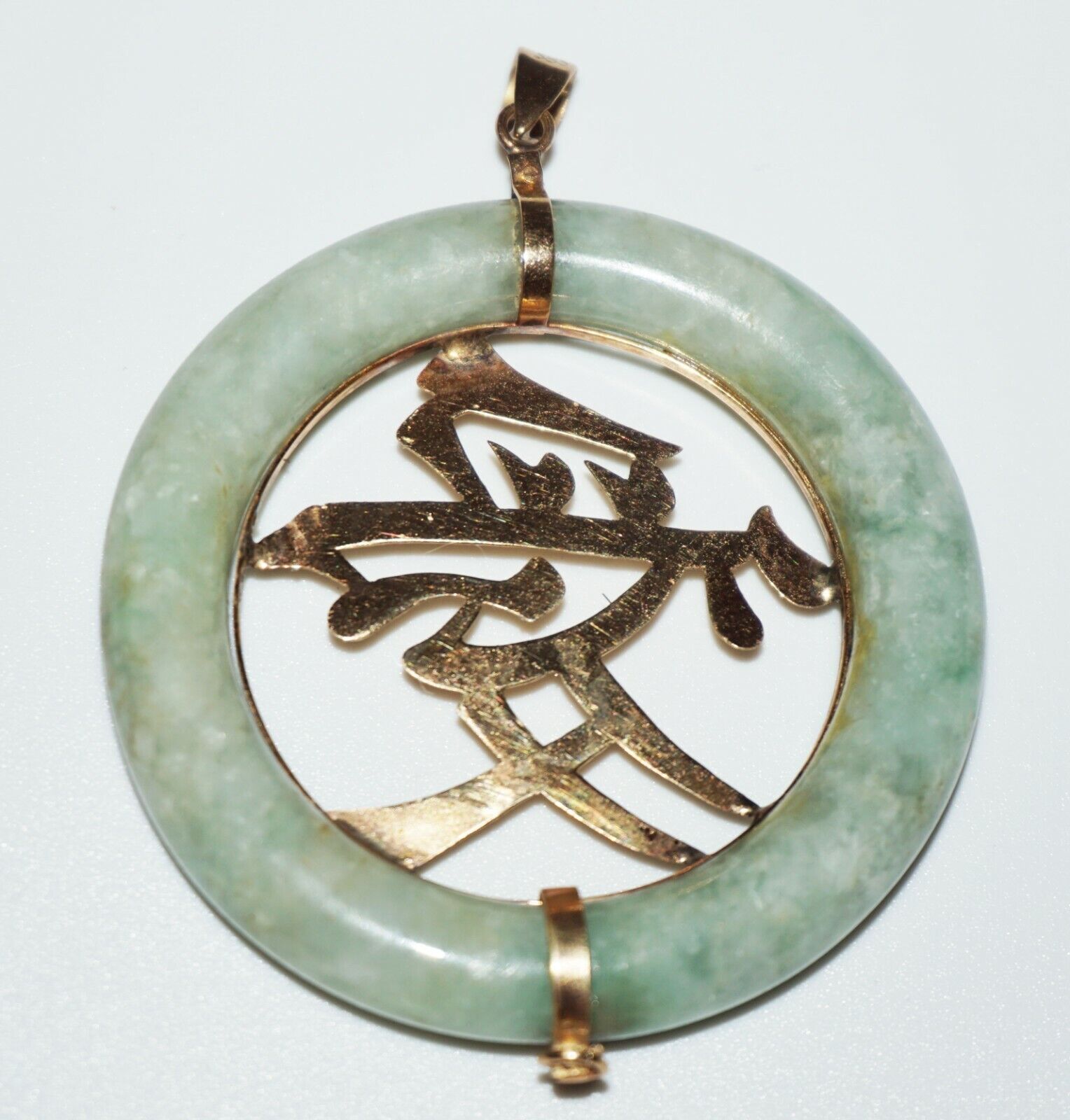 Vintage Chinese 14k Yellow Gold Character Motif Jadeite Jade Disk Pendant (WoL)