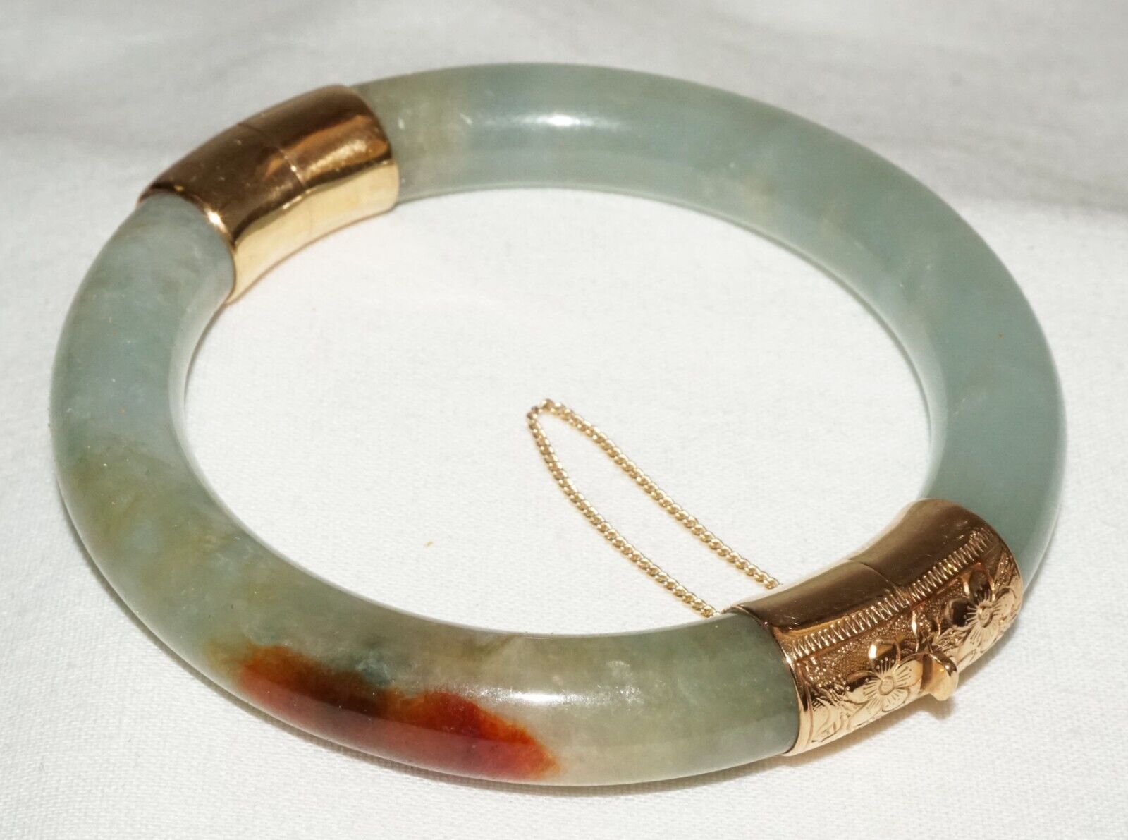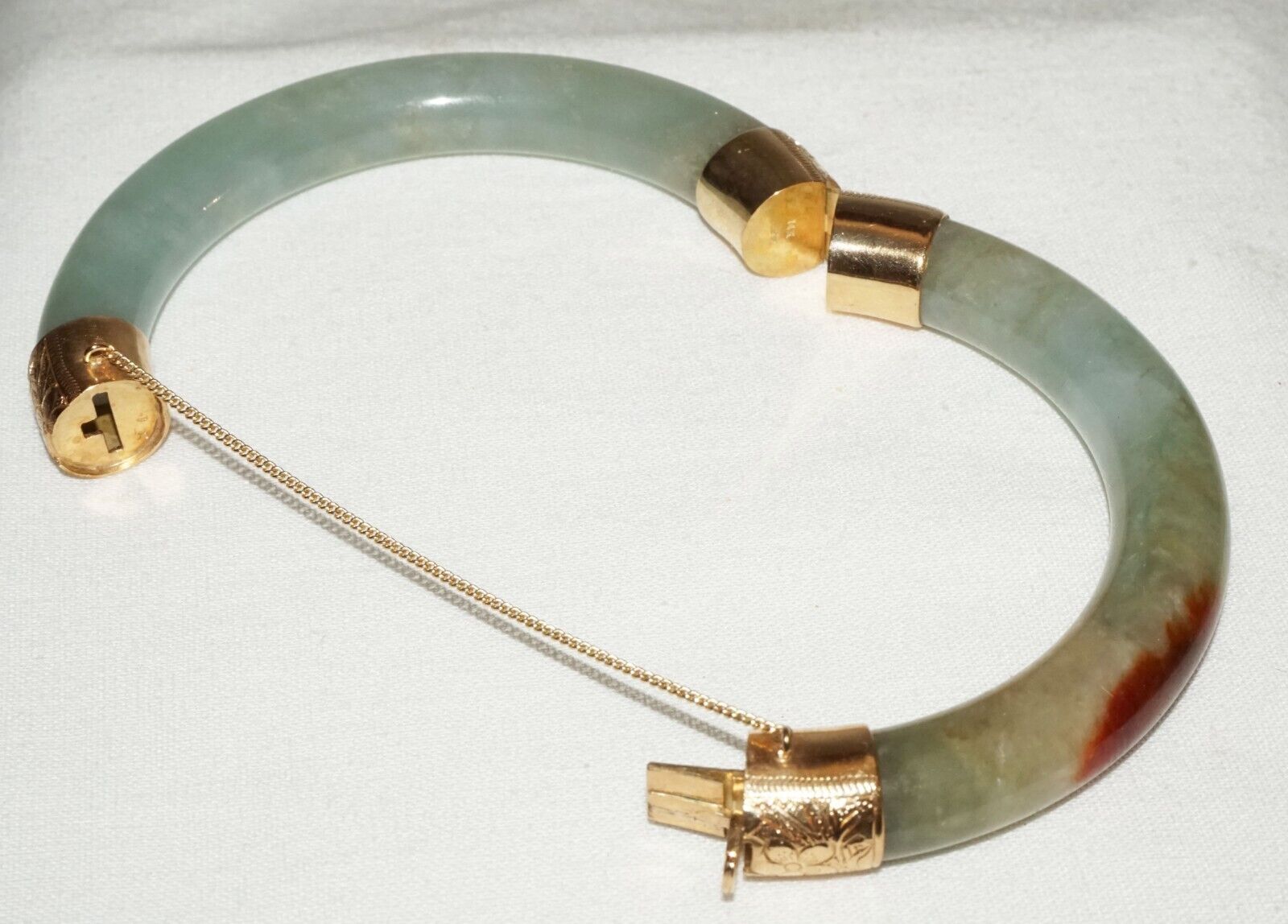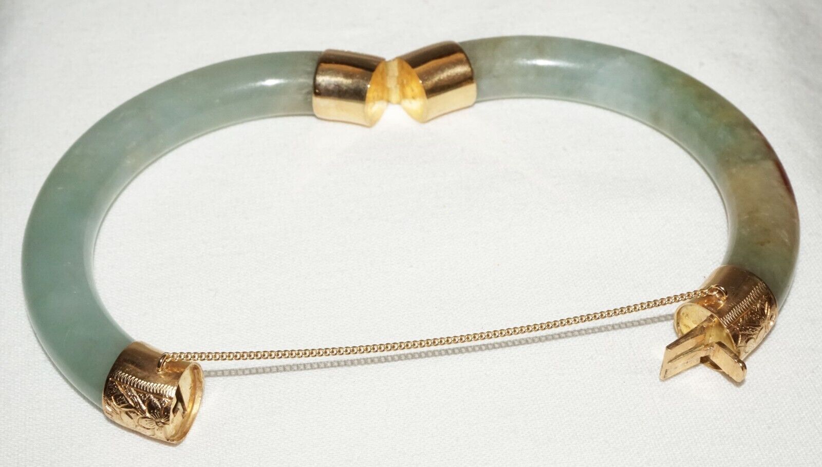 Up for sale from a recent estate in Honolulu Hawaii, this Vintage Chinese attractive green jadeite jade hinged bangle bracelet with attractive brown accent by well known maker Ming's. The condition is described above for more information please check the photos. Free local pick up possible!!!