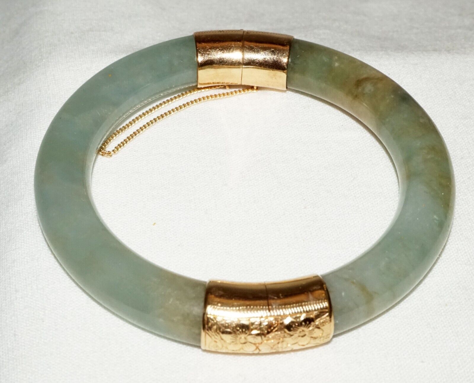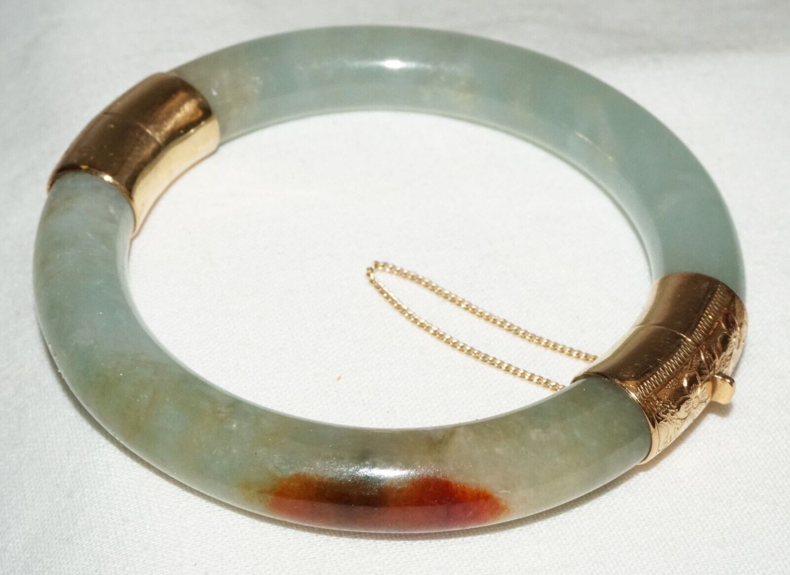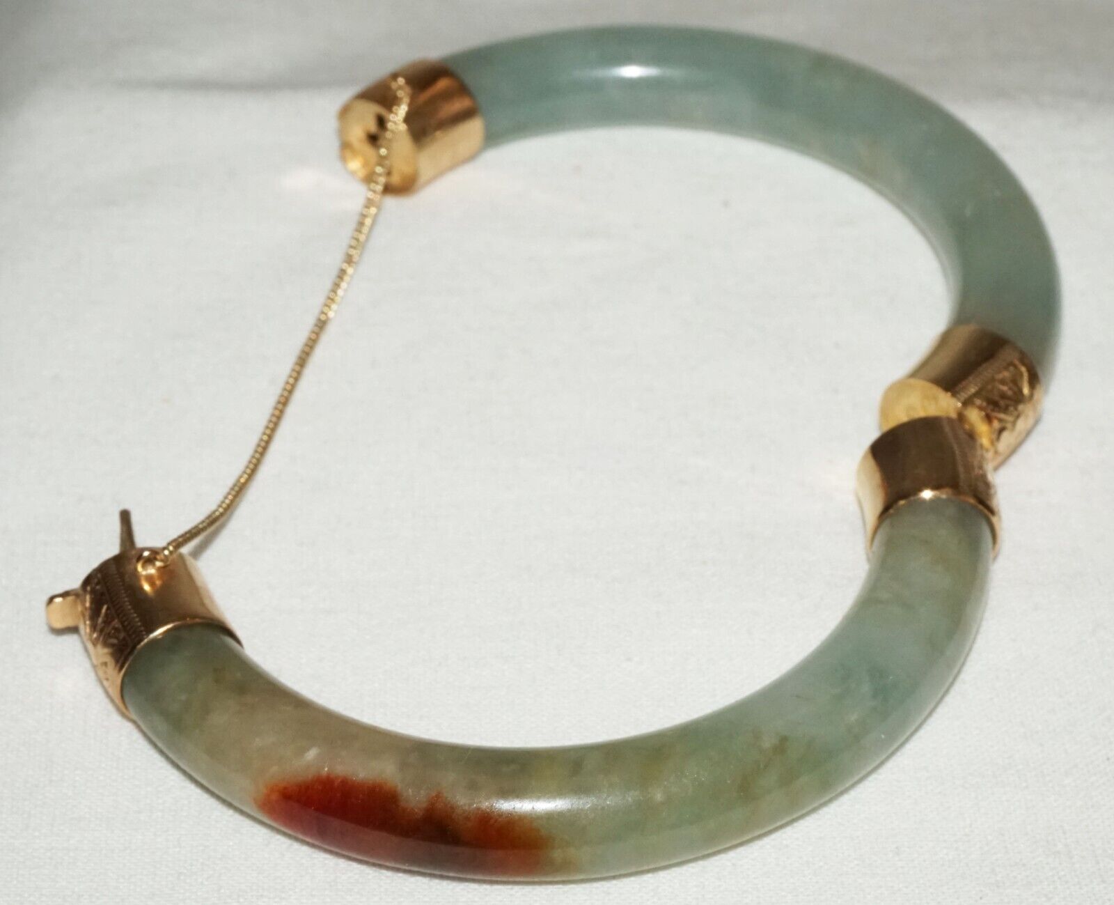 Up for sale from a recent estate in Honolulu Hawaii, this Vintage Chinese attractive green jadeite jade hinged bangle bracelet with attractive brown accent by well known maker Ming's. The condition is described above for more information please check the photos. Free local pick up possible!!!