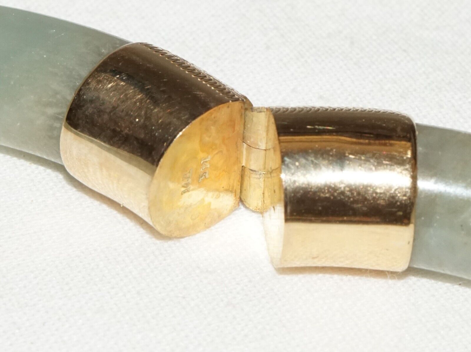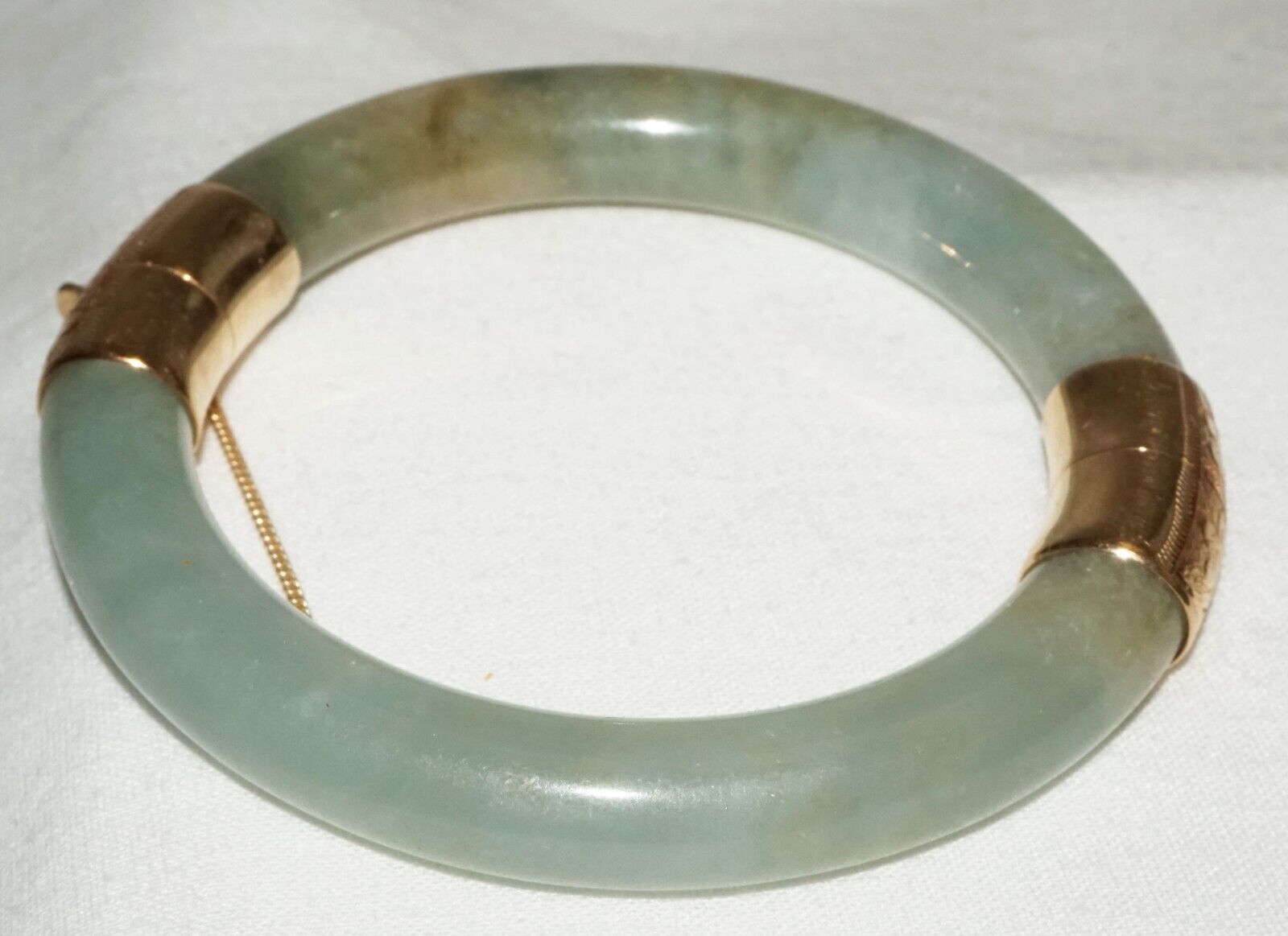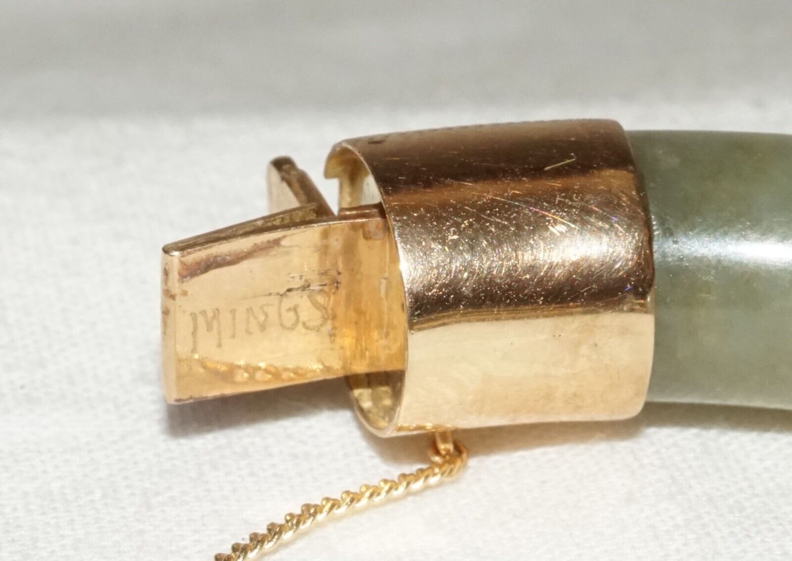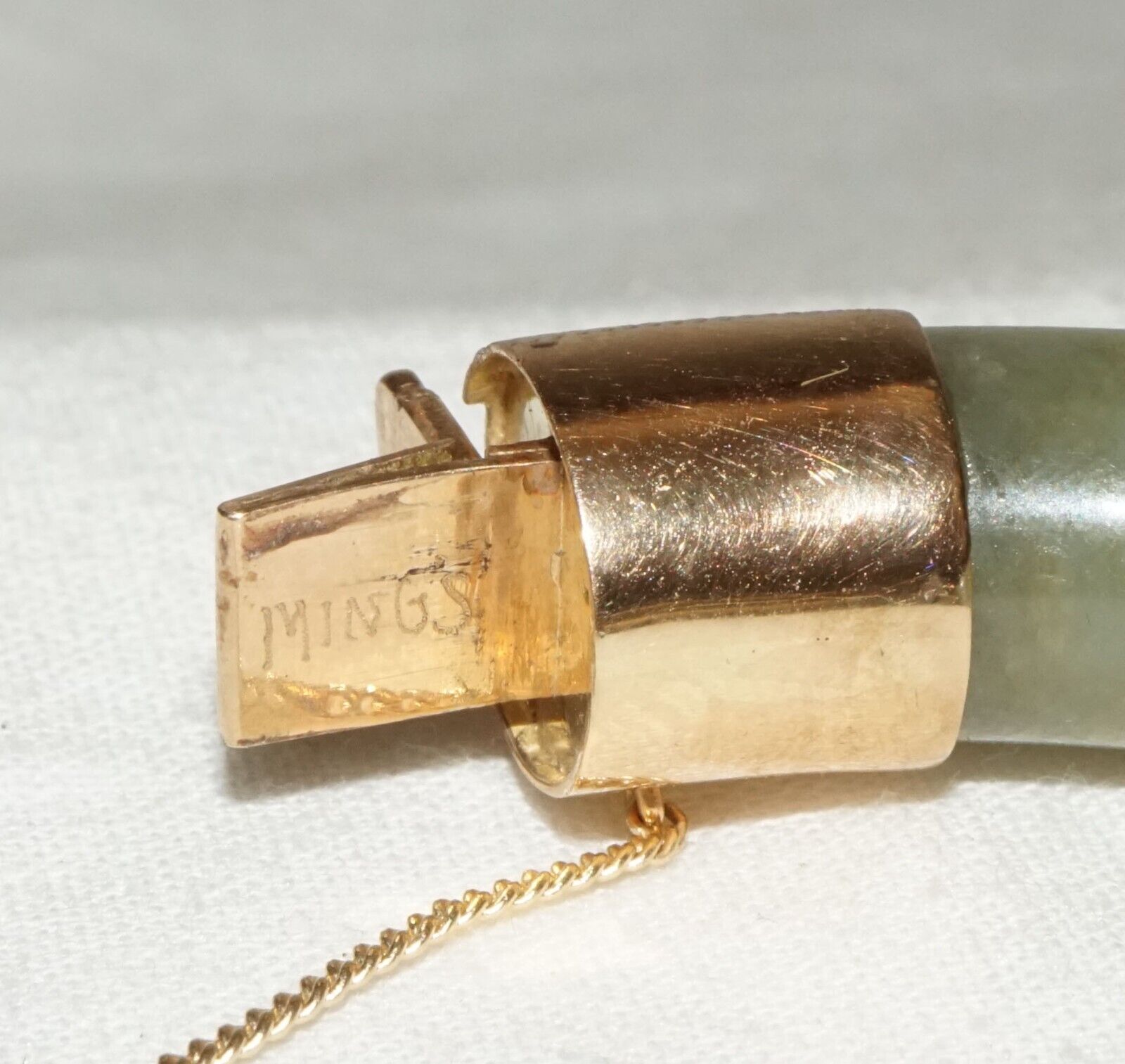 The item is overall in good pre-owned condition, no chips no cracks, attractively color, not enhanced it is by well known maker Ming's, the clasp is marked 14k and the Ming's, good hinge excellent clasp