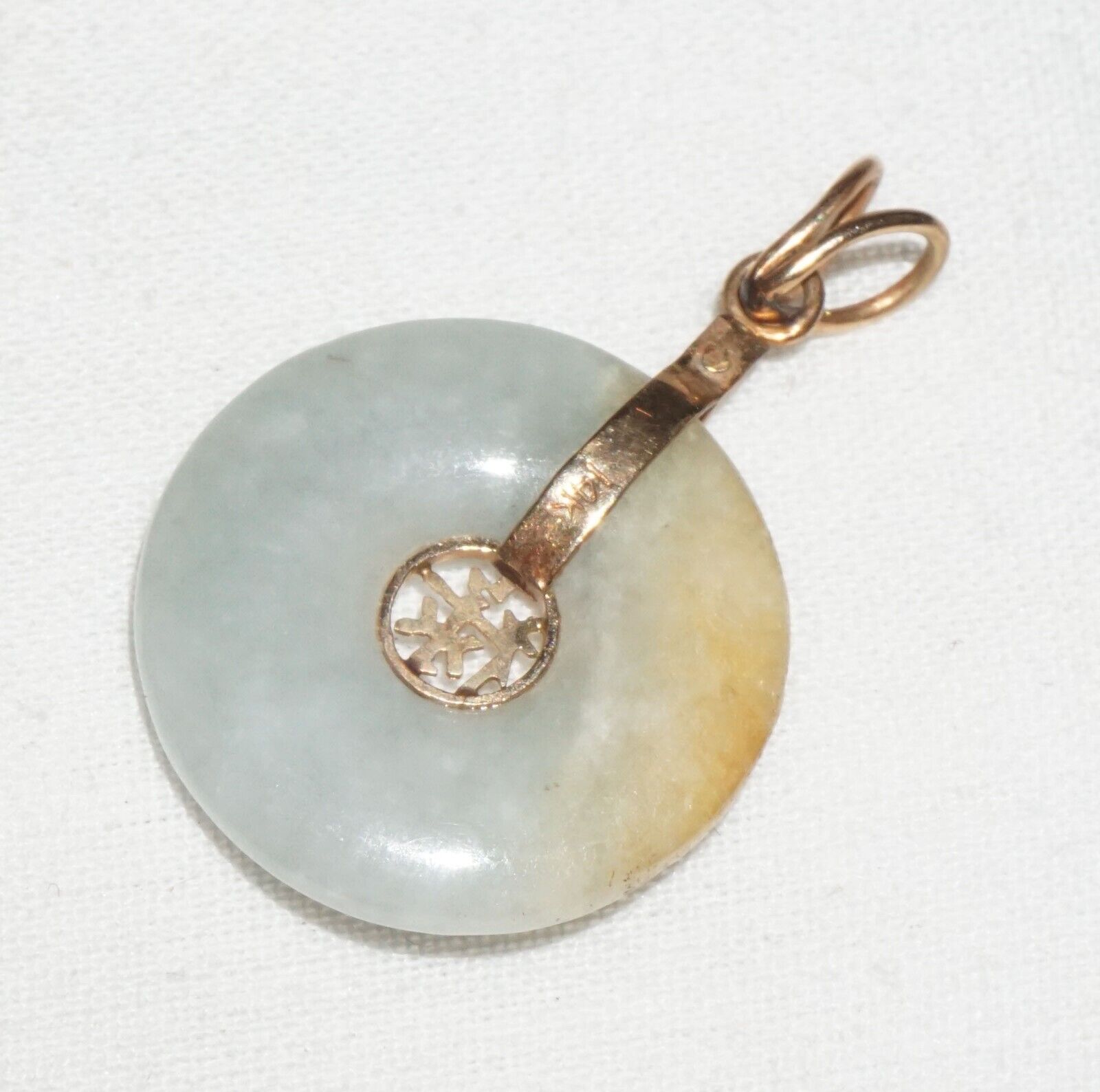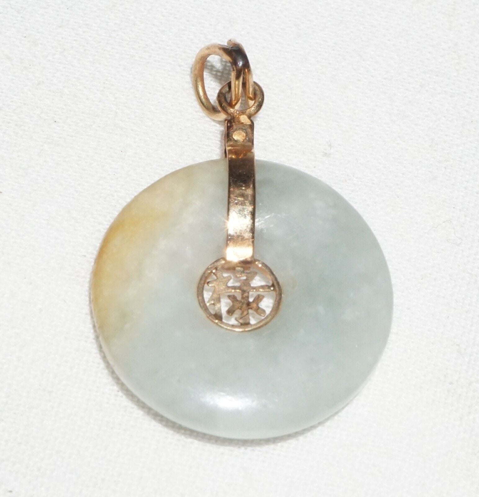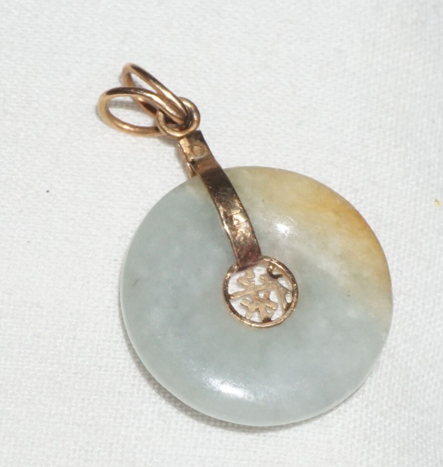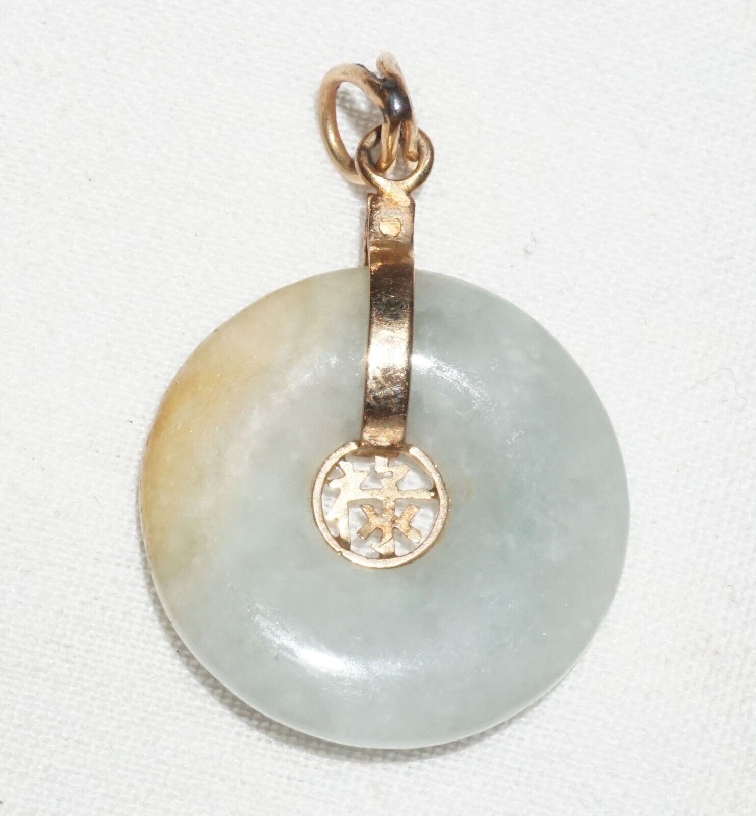 Vintage Chinese 14k Yellow Gold Jadeite Jade Disk Pendant w. Auspicious(BrM) L17