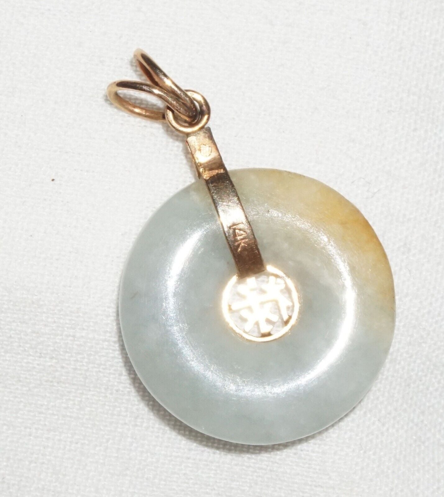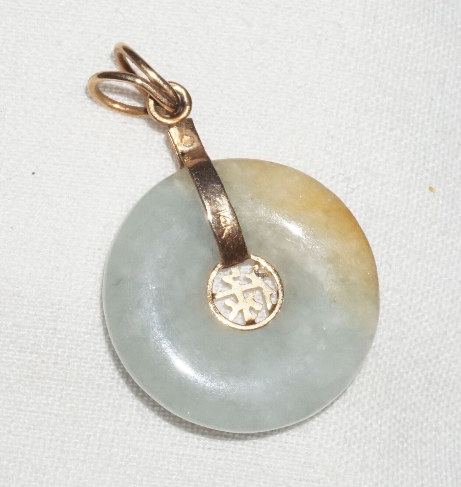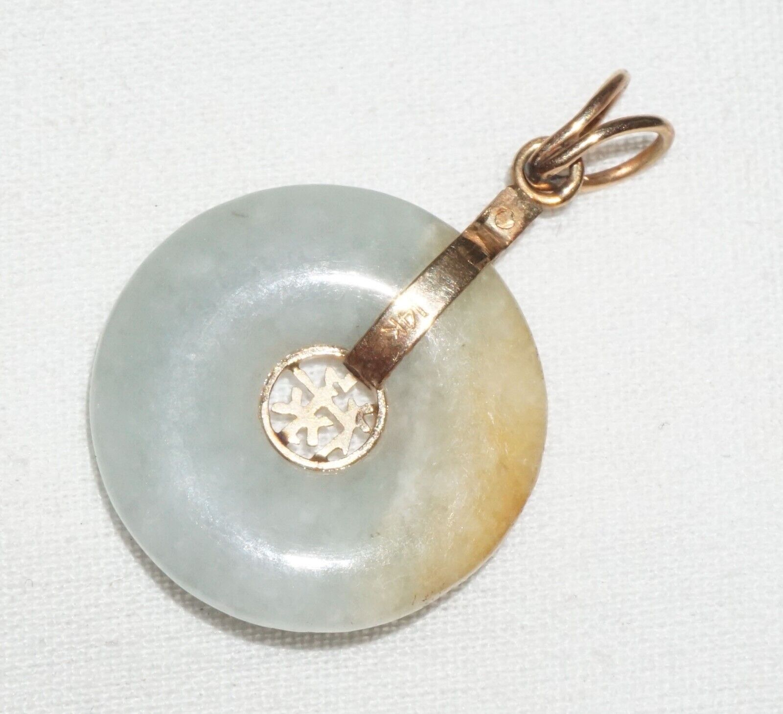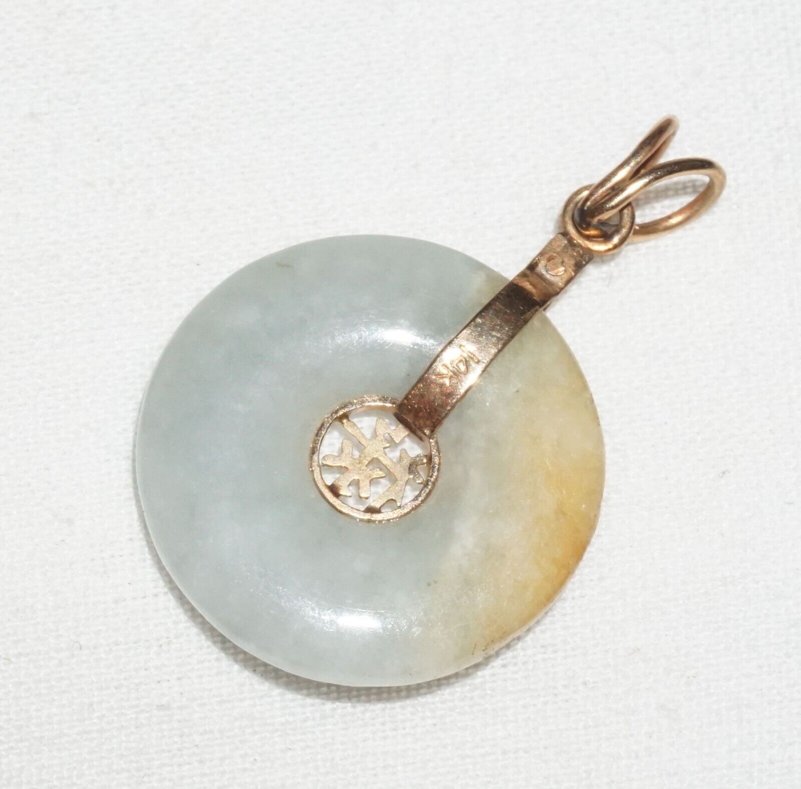 Vintage Chinese 14k Yellow Gold Jadeite Jade Disk Pendant w. Auspicious(BrM) L17