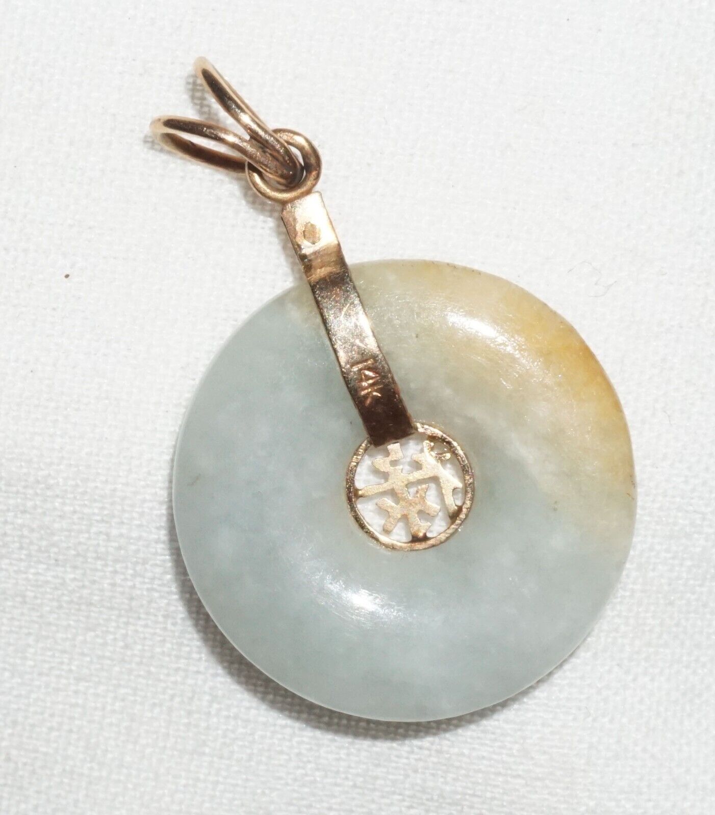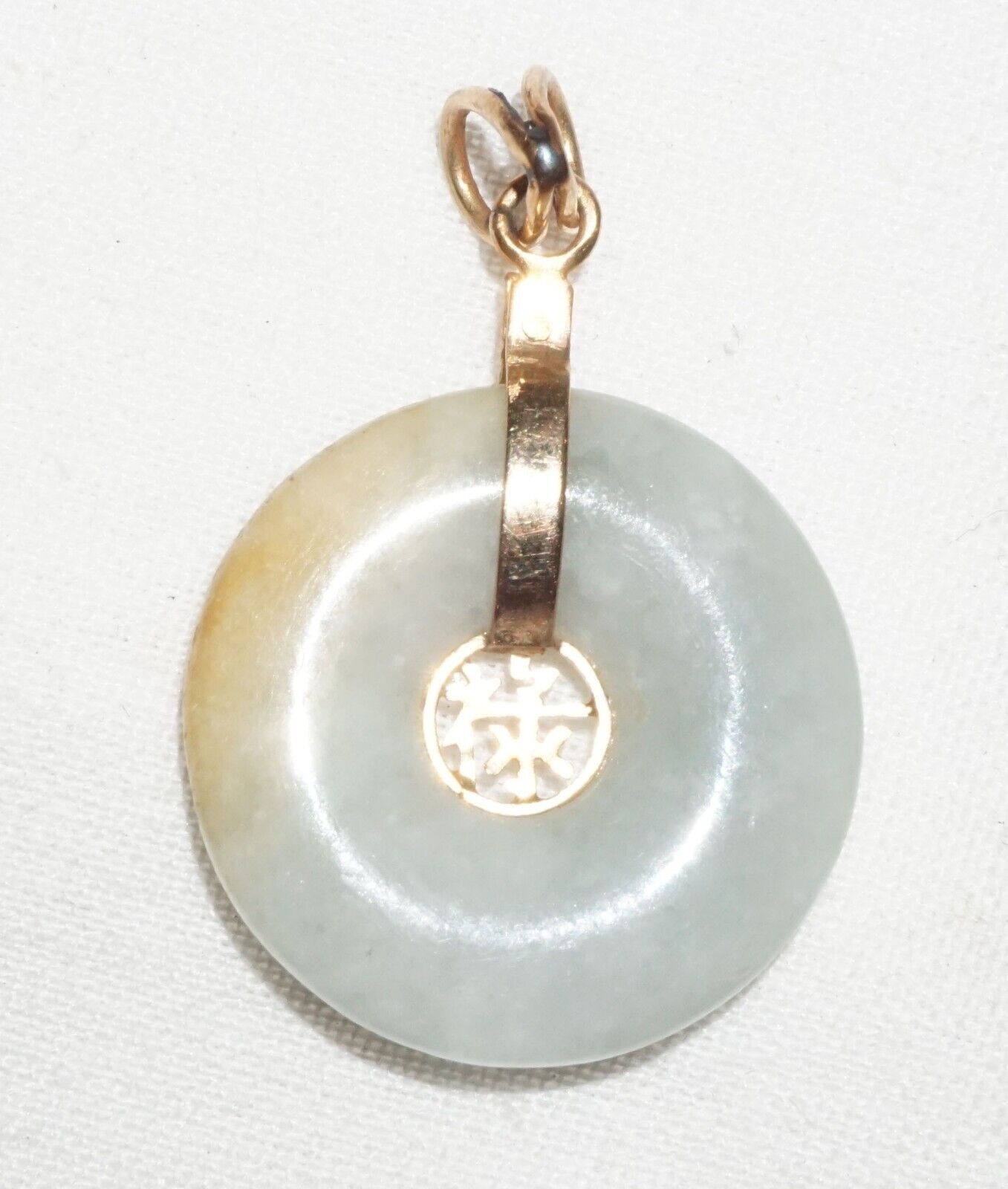 Up for sale from a recent estate in Honolulu Hawaii, this Vintage Chinese 14k yellow gold set pendant with auspicious character motif that is set with a jadeite jade disk accent (21mm diameter x 3.5mm thick). The condition is described above for more information please check the photos.