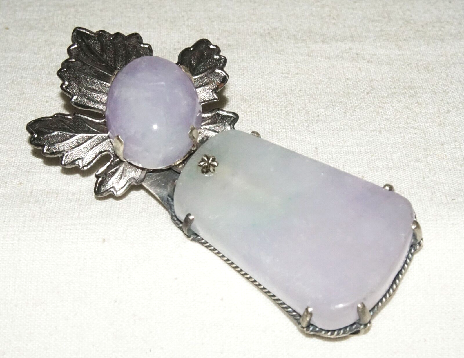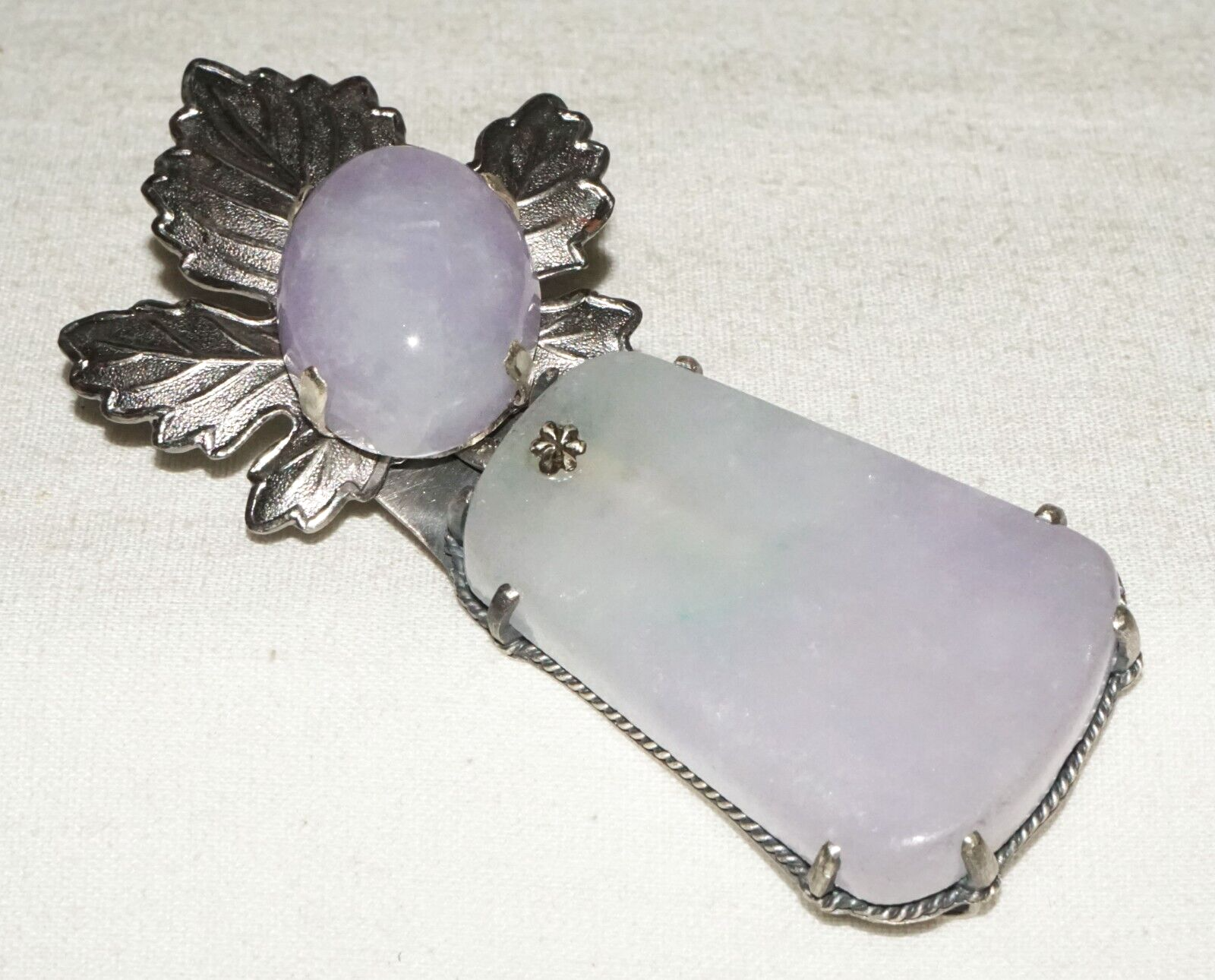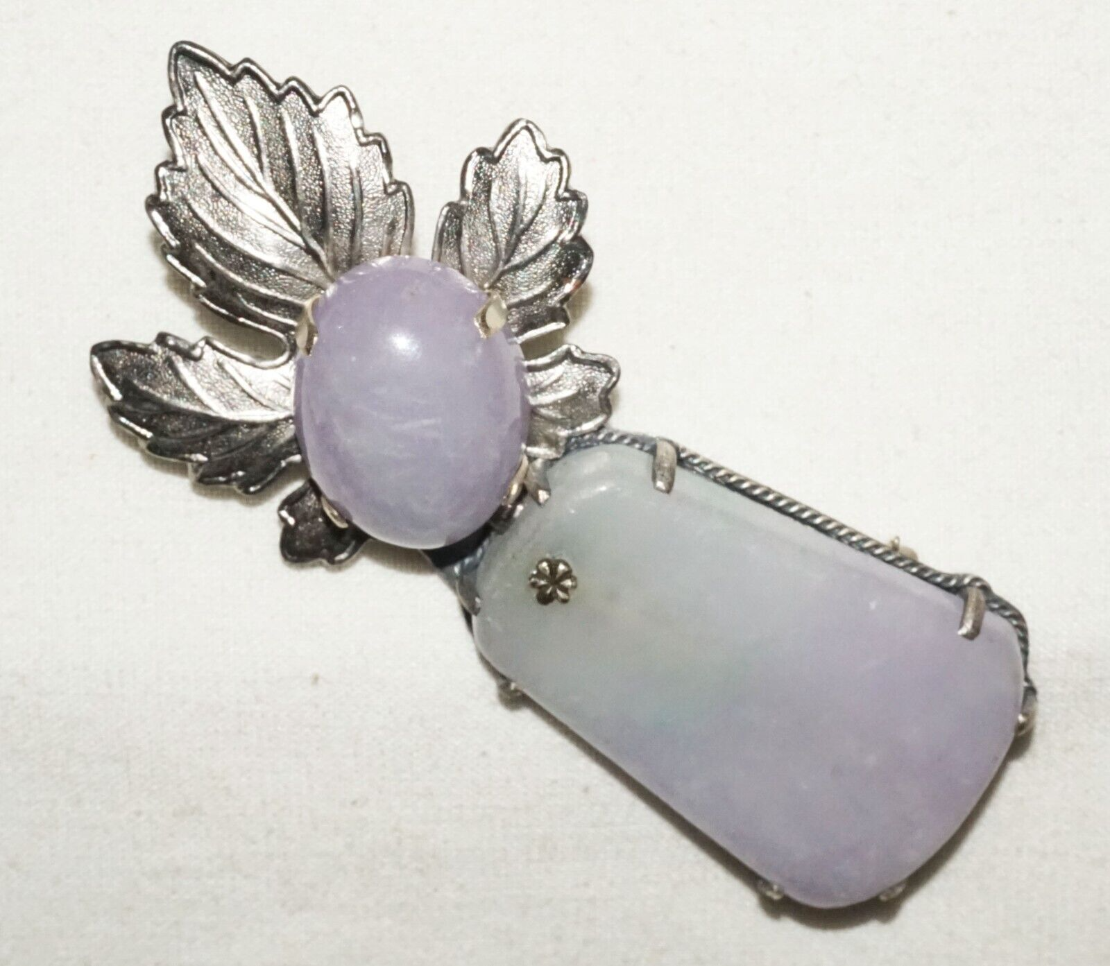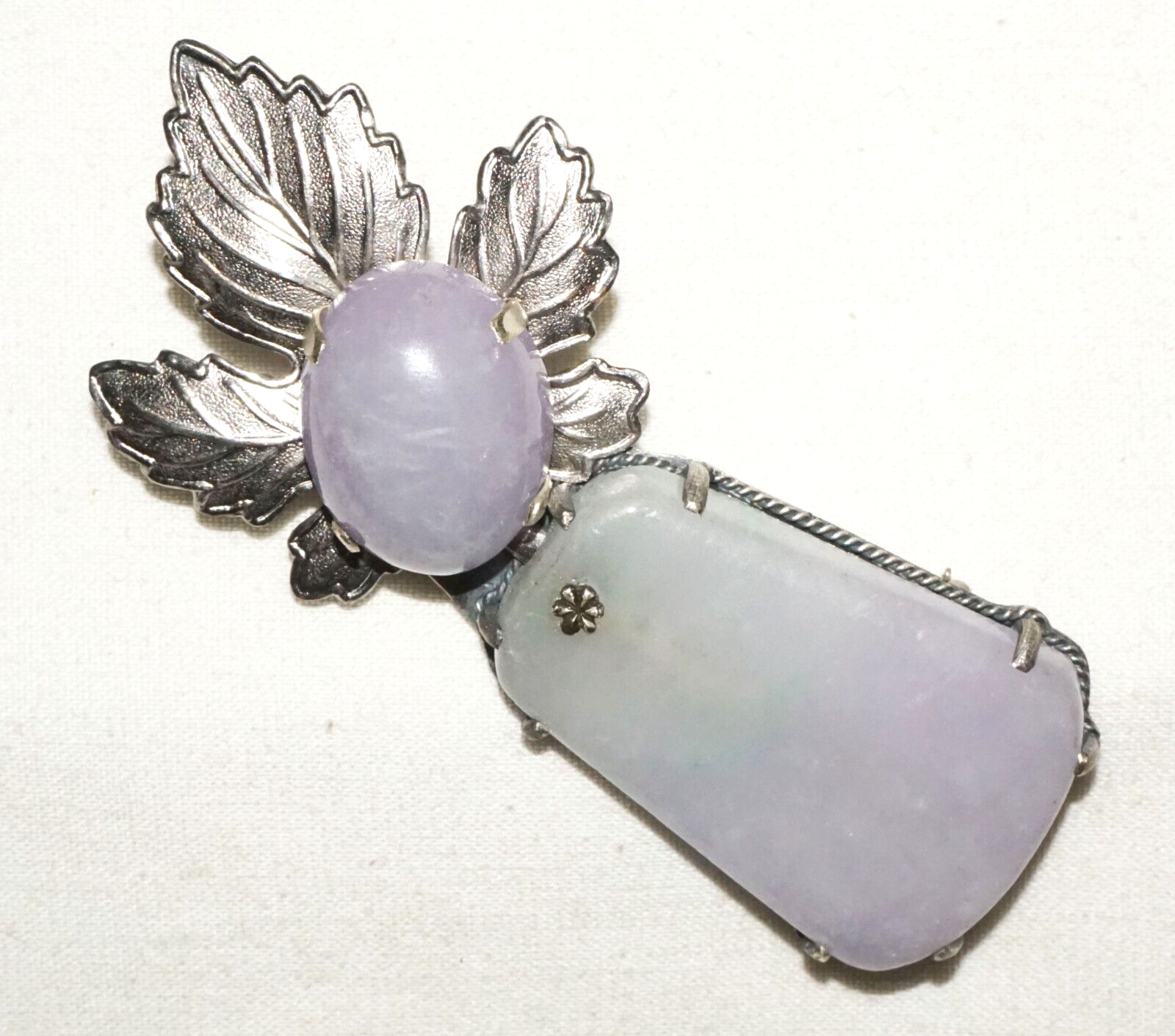 Up for sale from a recent estate in Honolulu Hawaii, this contemporary Chinese fashion brooch pendant with leaf motif that is set with 1x lavender jade oval high dome cabochon (approx. 22mm x 17.5mm x 9mm) and is further set with a lavender and green jade accent (approx. 41.5mm x 28mm x 5mm). The condition is described above for more information please check the photos. Free local pick up possible!!!