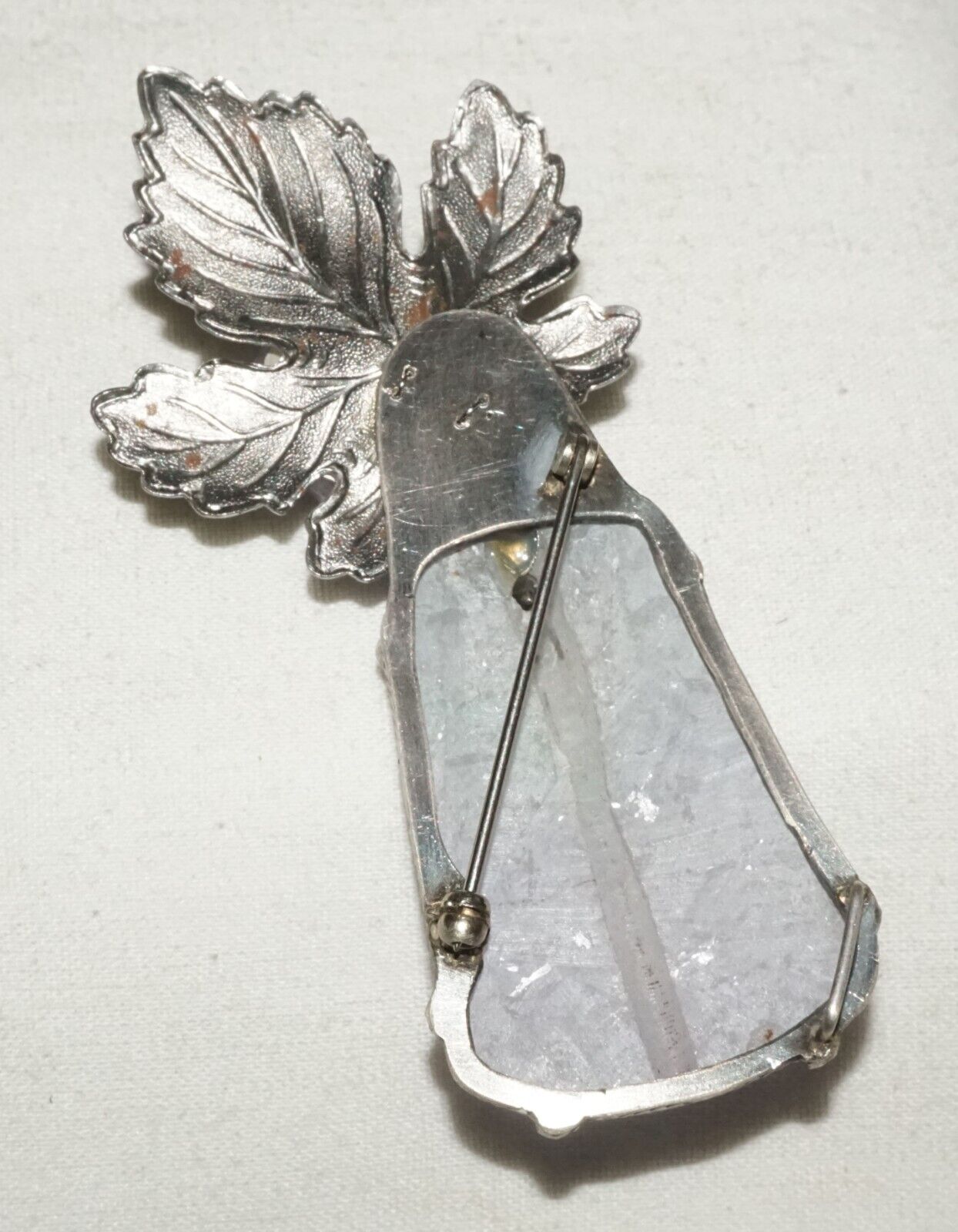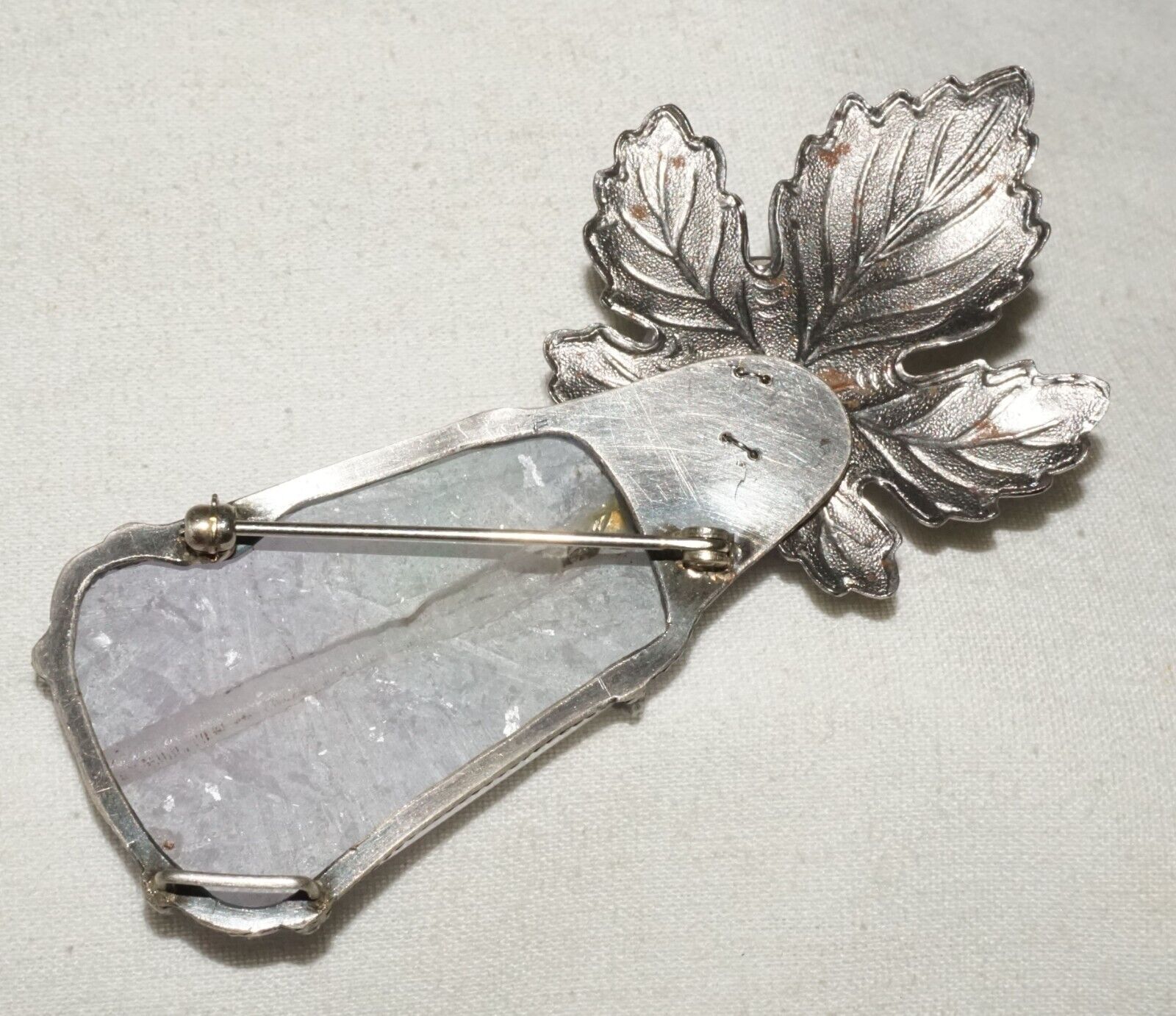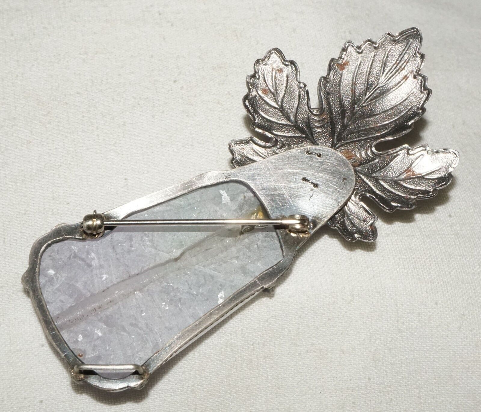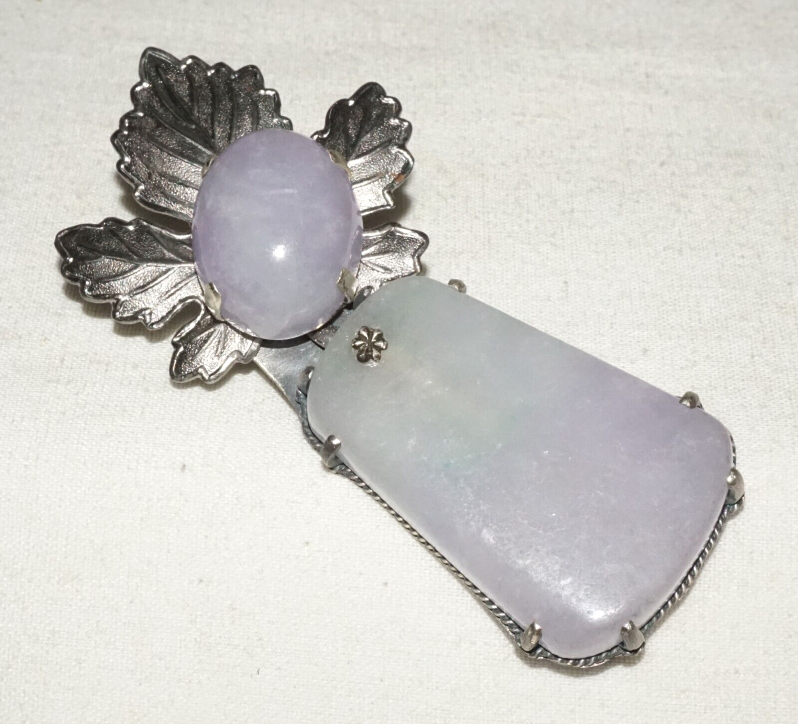 Up for sale from a recent estate in Honolulu Hawaii, this contemporary Chinese fashion brooch pendant with leaf motif that is set with 1x lavender jade oval high dome cabochon (approx. 22mm x 17.5mm x 9mm) and is further set with a lavender and green jade accent (approx. 41.5mm x 28mm x 5mm). The condition is described above for more information please check the photos. Free local pick up possible!!!