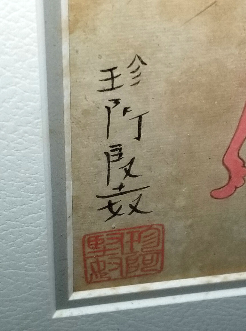 The item is overall in good pre-owned condition, the frame is good too, I am still waiting to hear back from my Asian Arts appraiser if he can help with the signature and will add any additional information later, in case that you would like to have the painting removed from its frame...the shipping rate will be lower