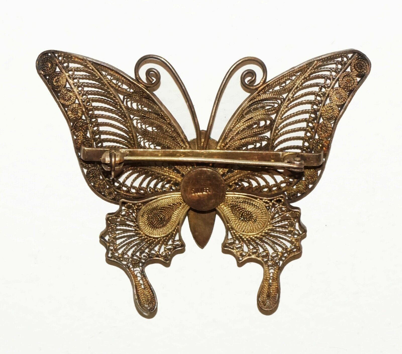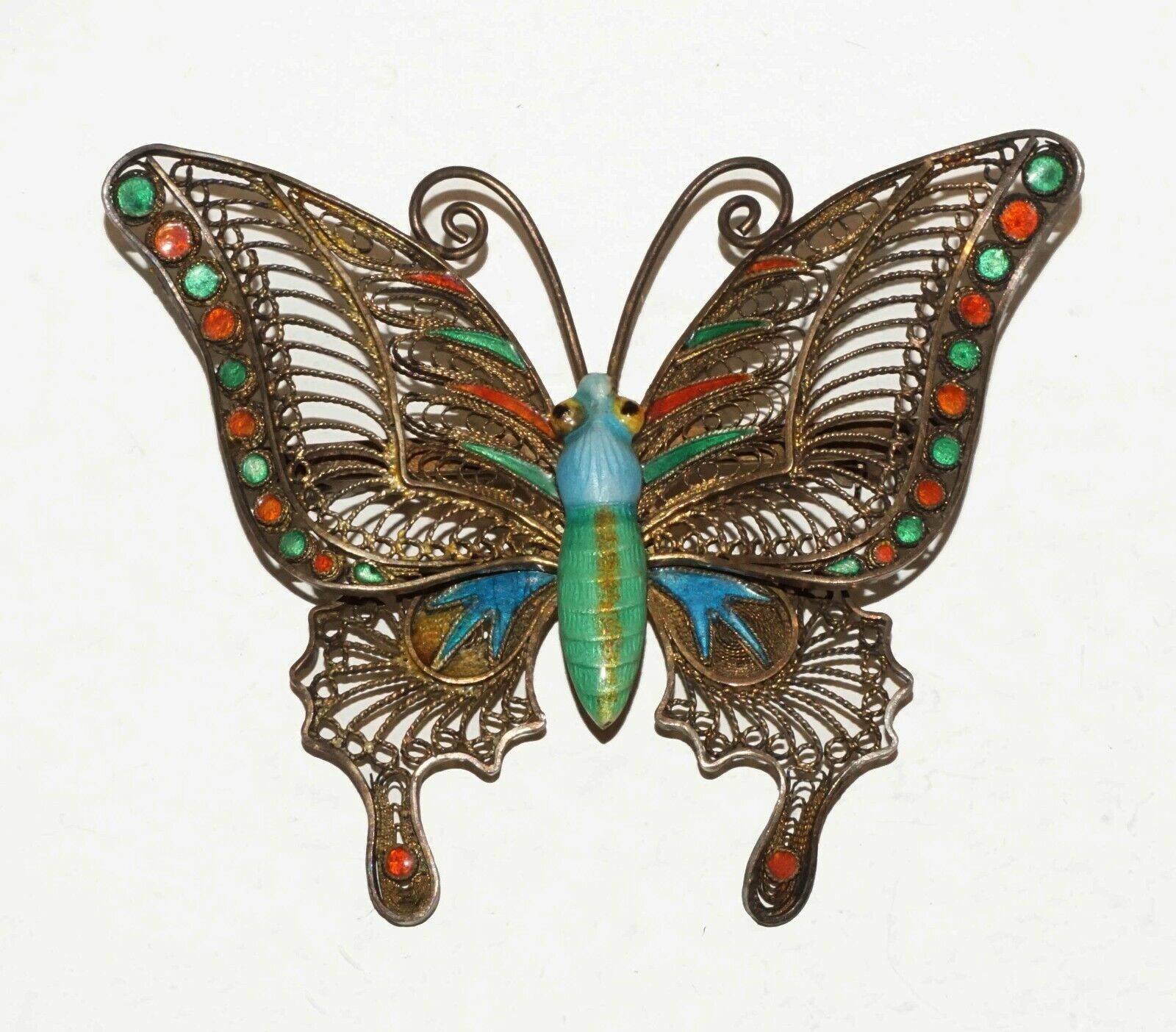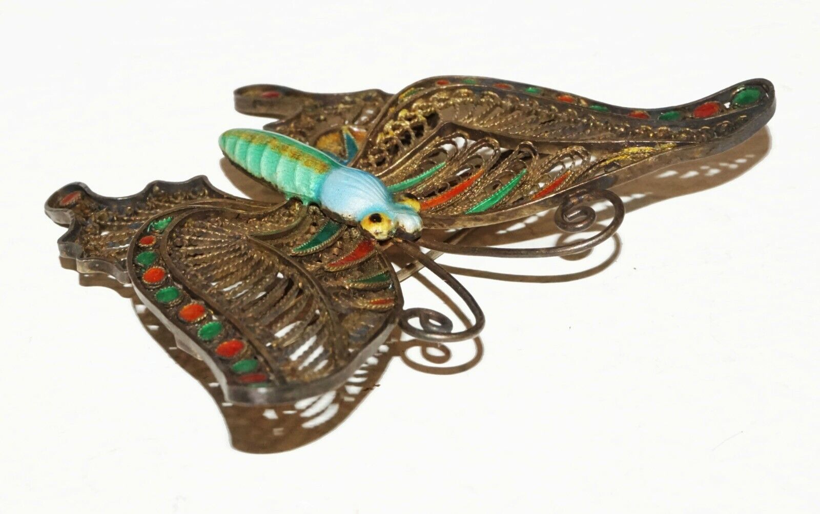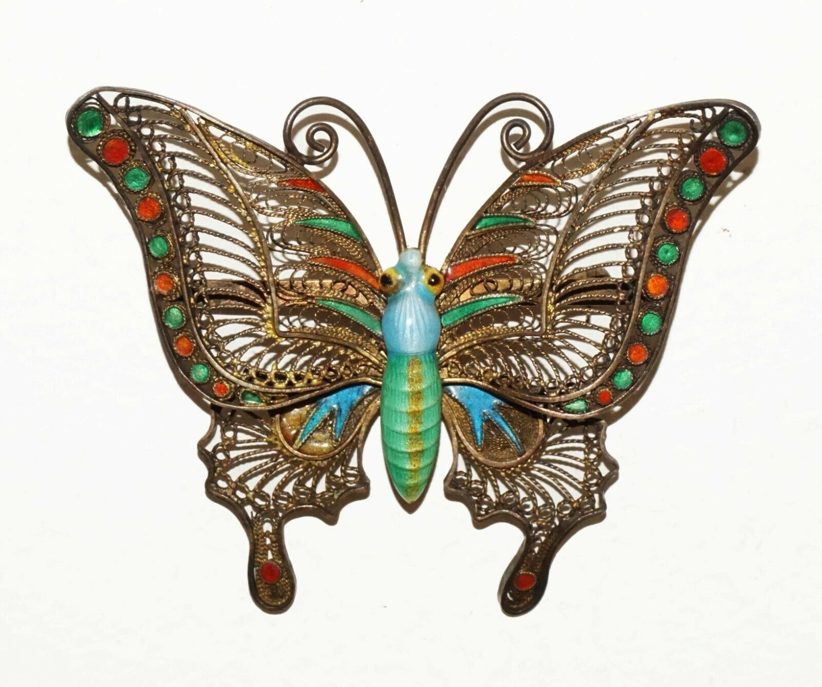 Vintage Chinese Gilt Silver Filigree & Enamel Large Butterfly Brooch (BrM)#15