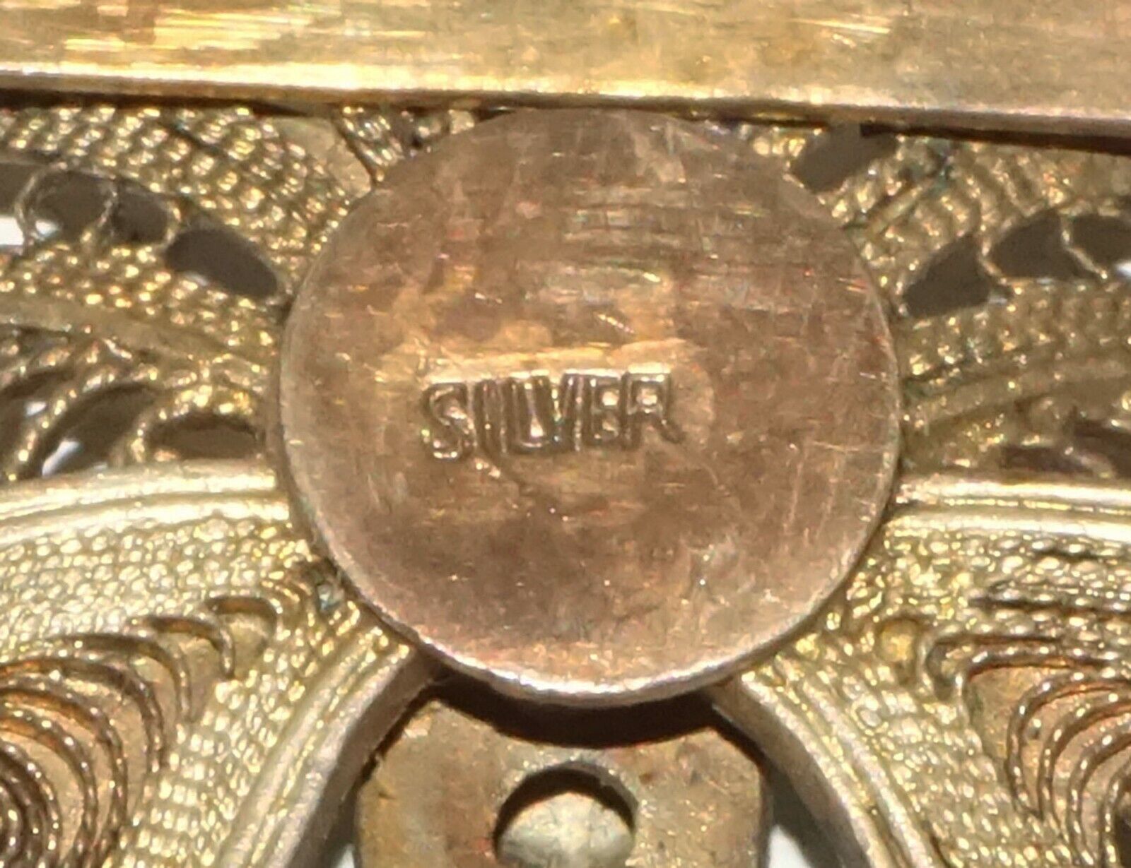 The item is overall in good pre-owned condition, it was stored in a safety deposit box and is tarnished and would benefit from a thorough cleaning, the back is marked silver, the enamel is overall in good shape