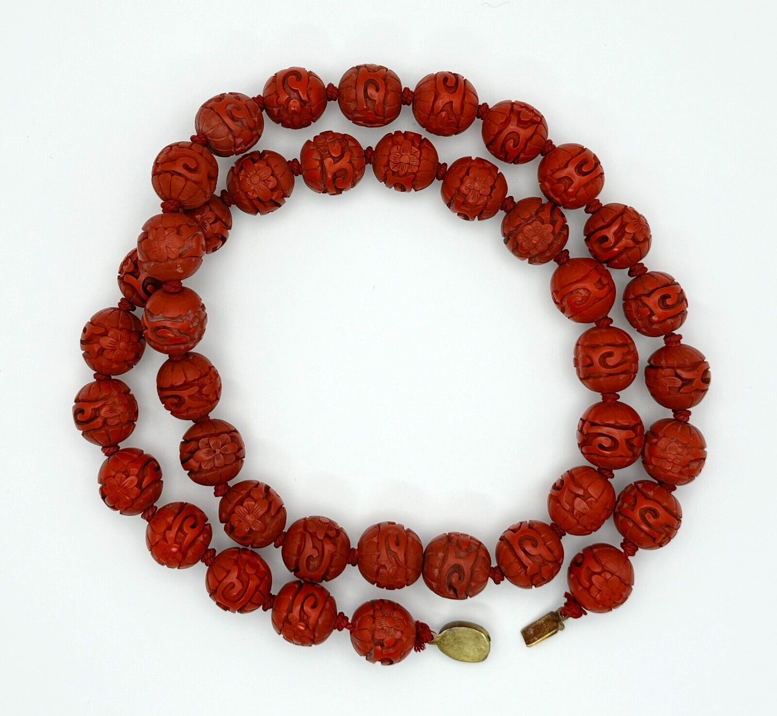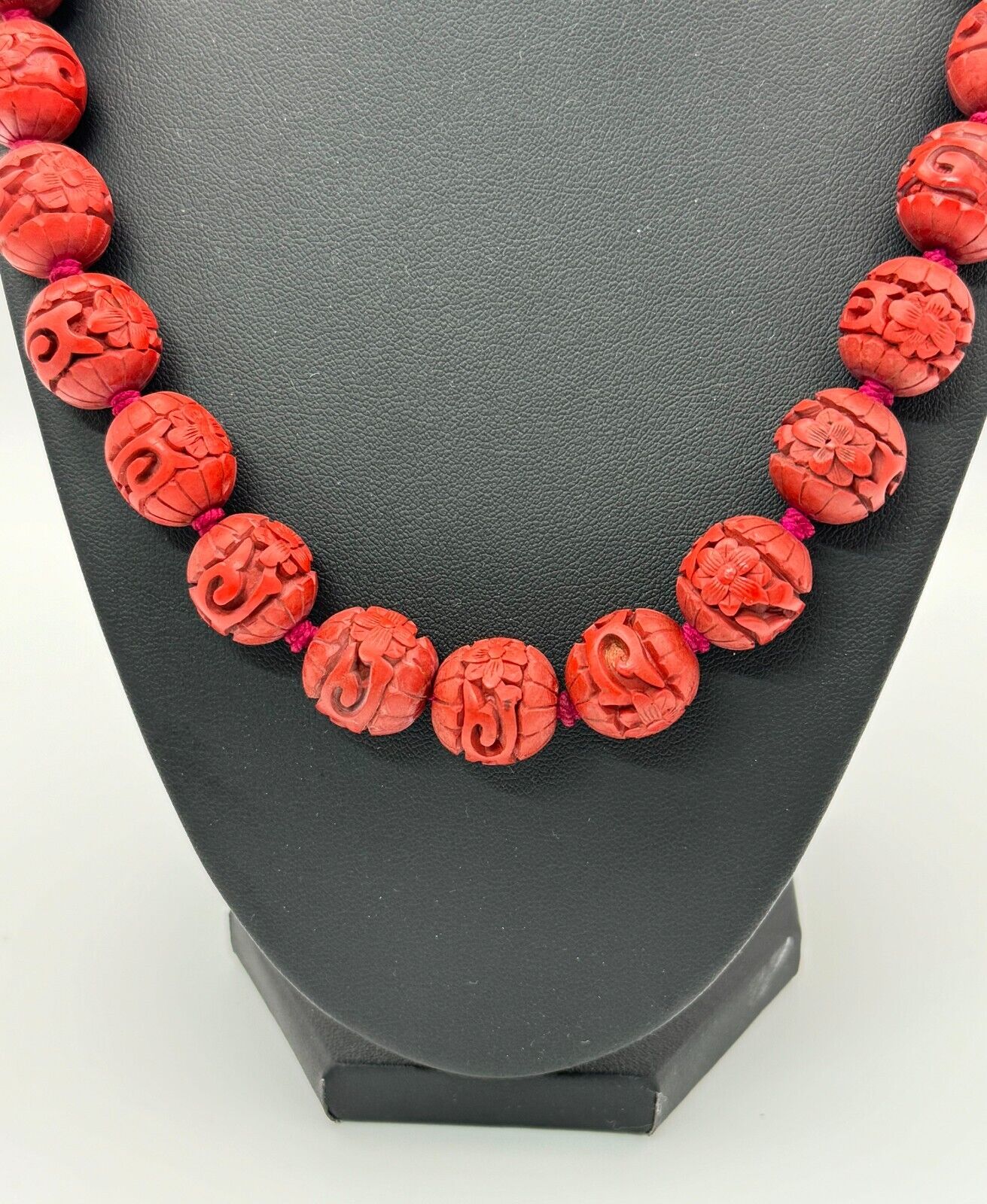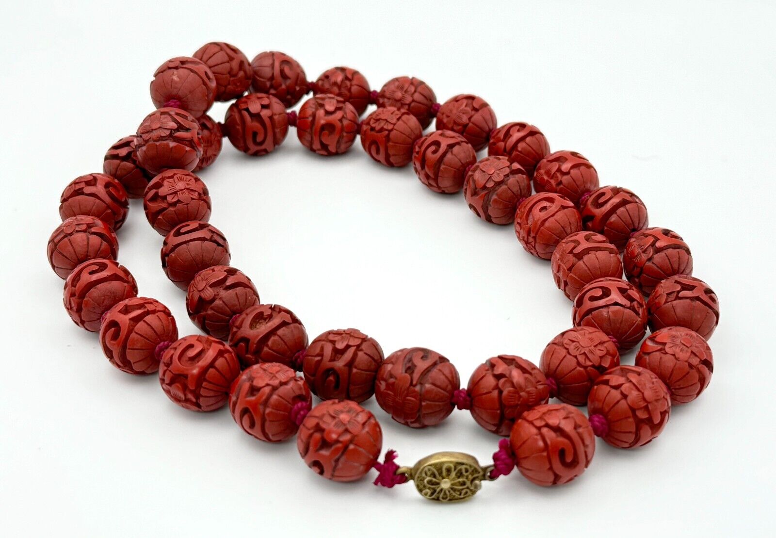 Vintage Chinese Hand-Carved Cinnabar Red Bead Necklace w Sterling Clasp (MiM)