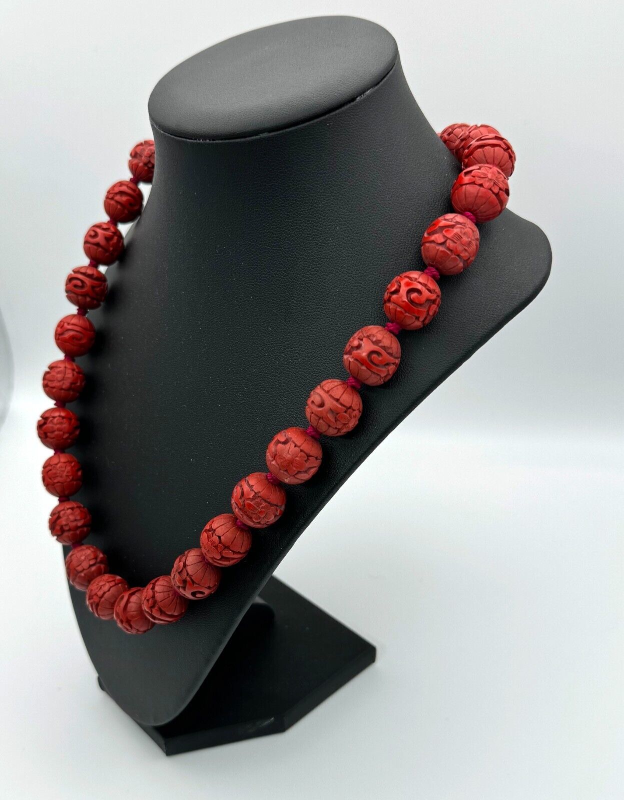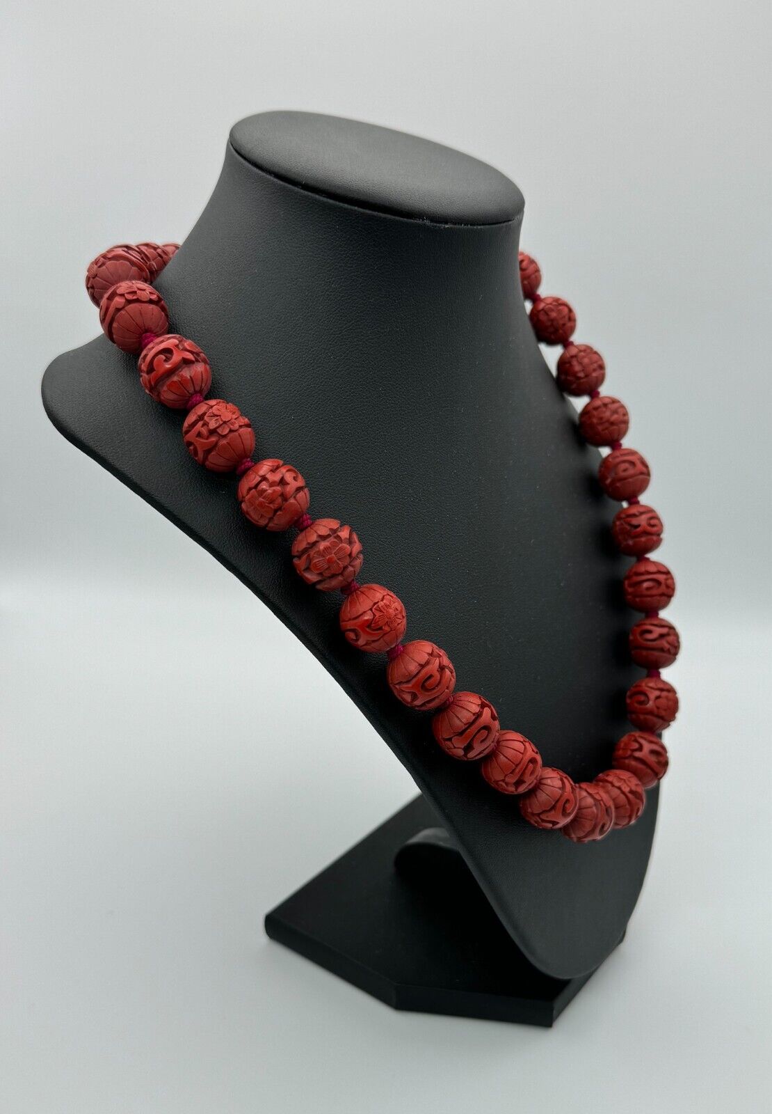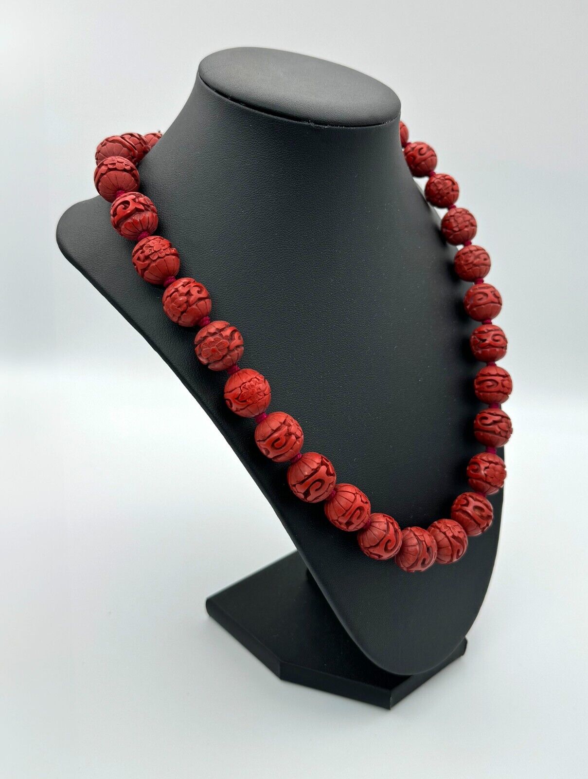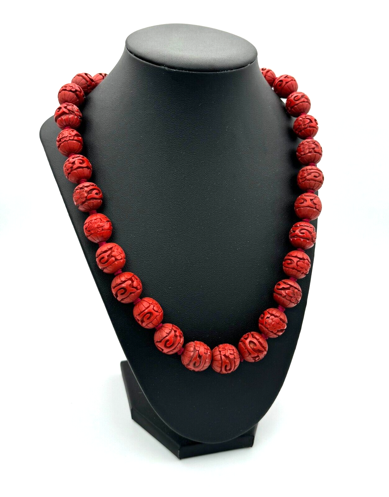 Vintage Chinese Hand-Carved Cinnabar Red Bead Necklace w Sterling Clasp (MiM)