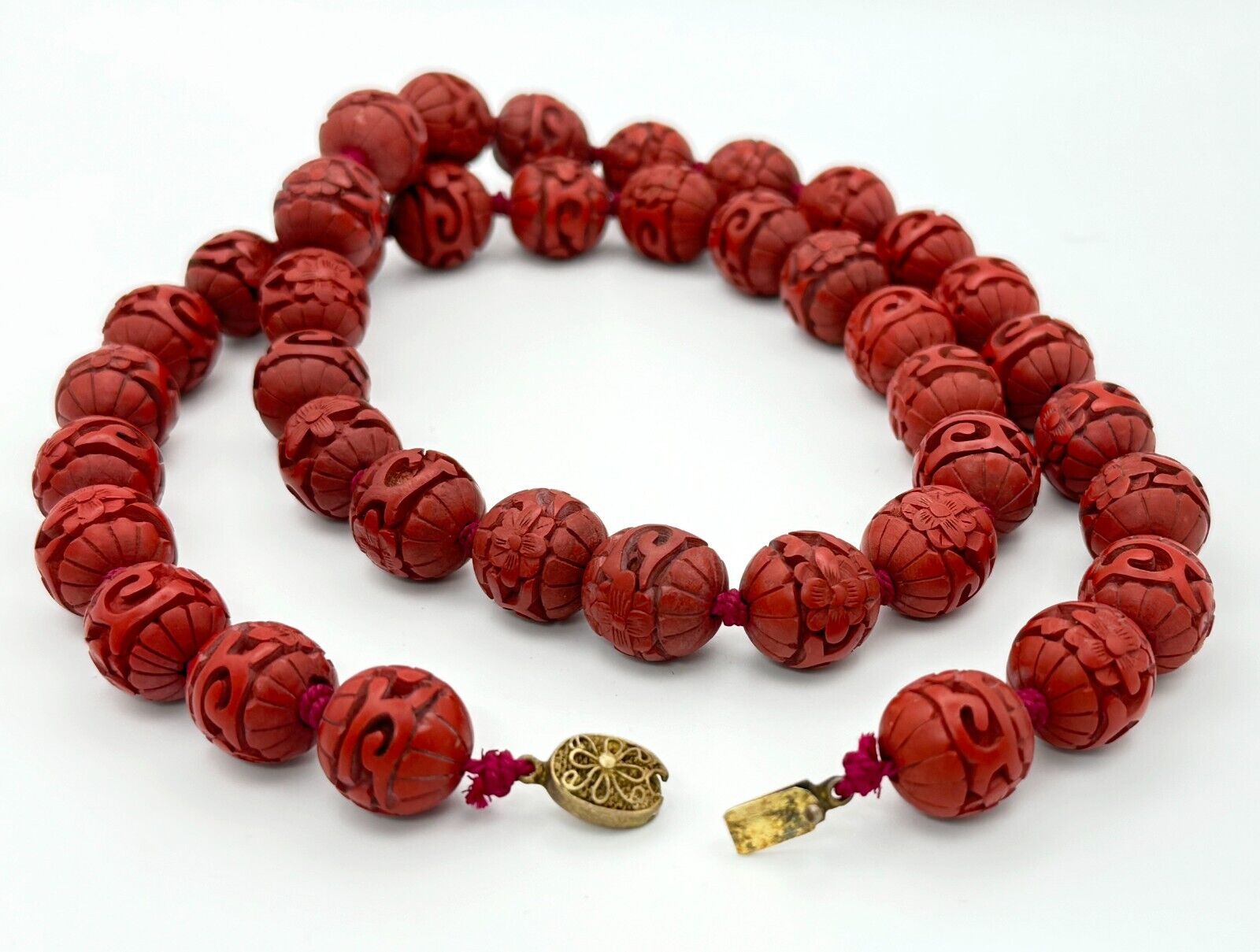 This was recently received from a Honolulu estate. Offered is a beautiful vintage Chinese hand-carved Lacquer Cinnabar red beaded necklace. This gorgeous cinnabar necklace features matching sized red cinnabar beads with gild filigree clasp. It measures approx. 26 inches long with clasp. The beads measure approx. 15.5 mm in diameter each. It weighs 72.8 grams. No markings. Overall in very good vintage condition. Please view all photos for details.