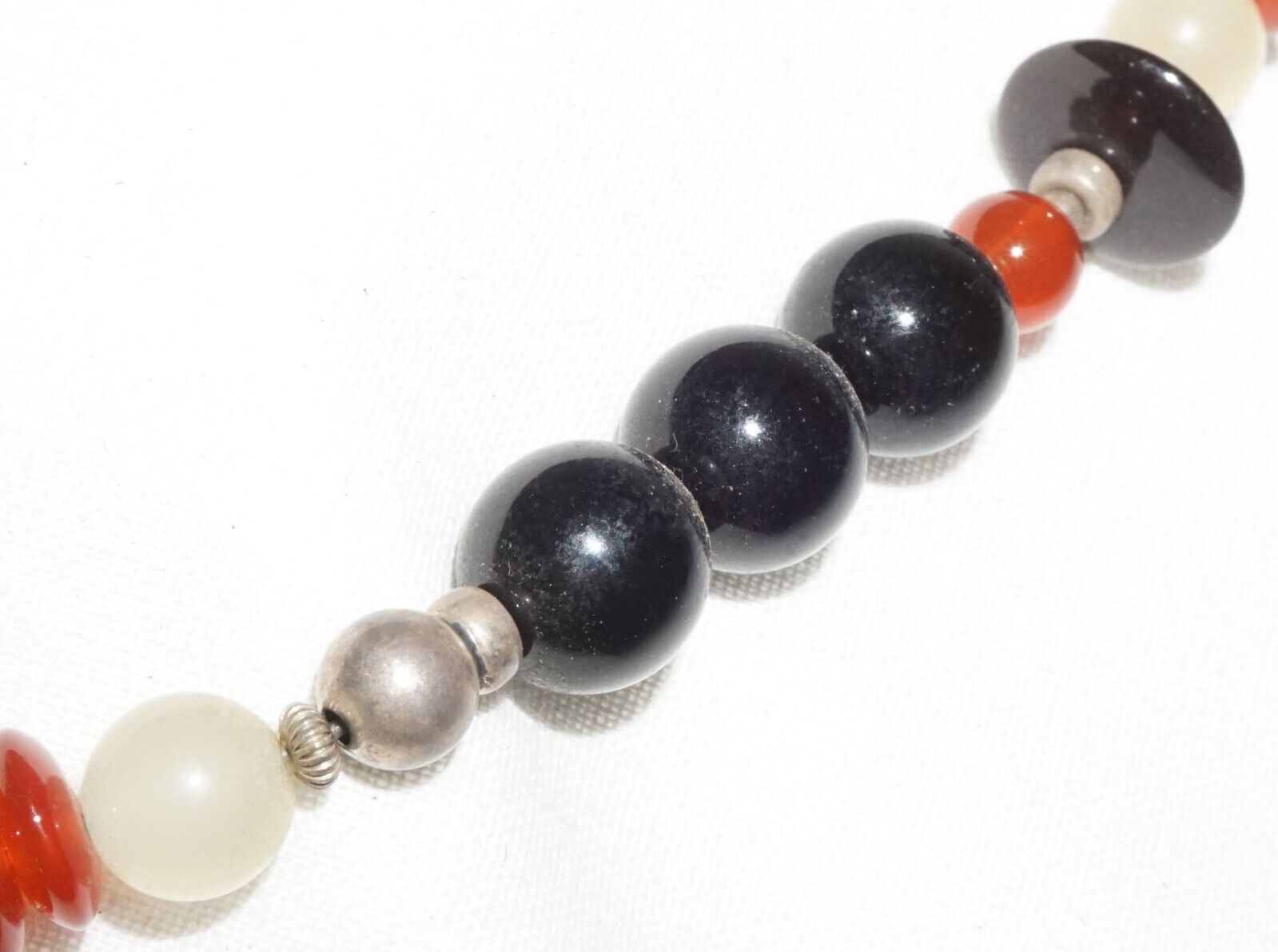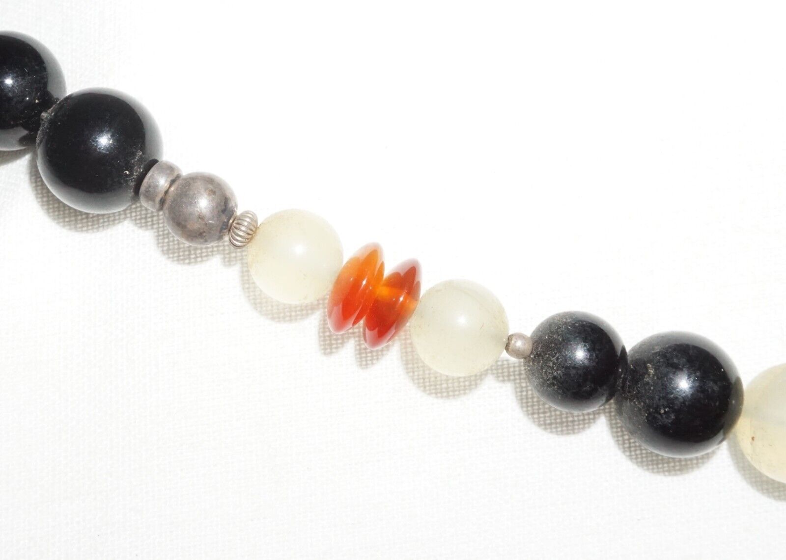 The item is overall in good pre-owned condition, the beads are gemstones, some jade some onyx and others, they appear natural in color, the unmarked silver pendant is older than the necklace