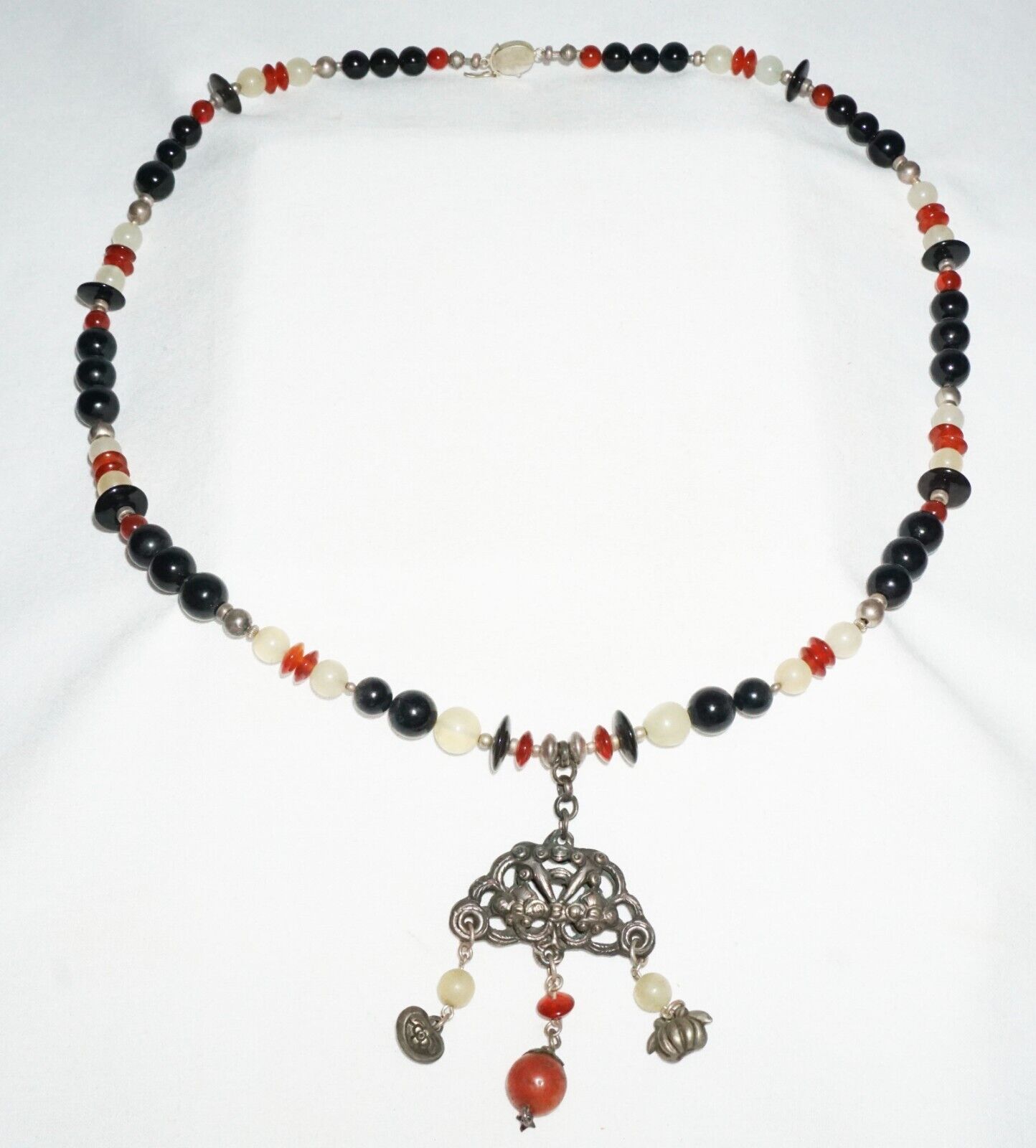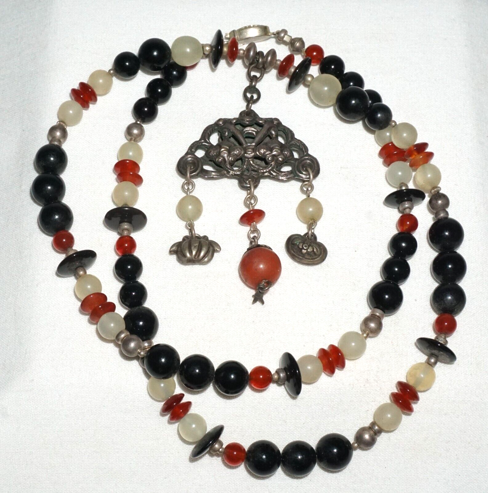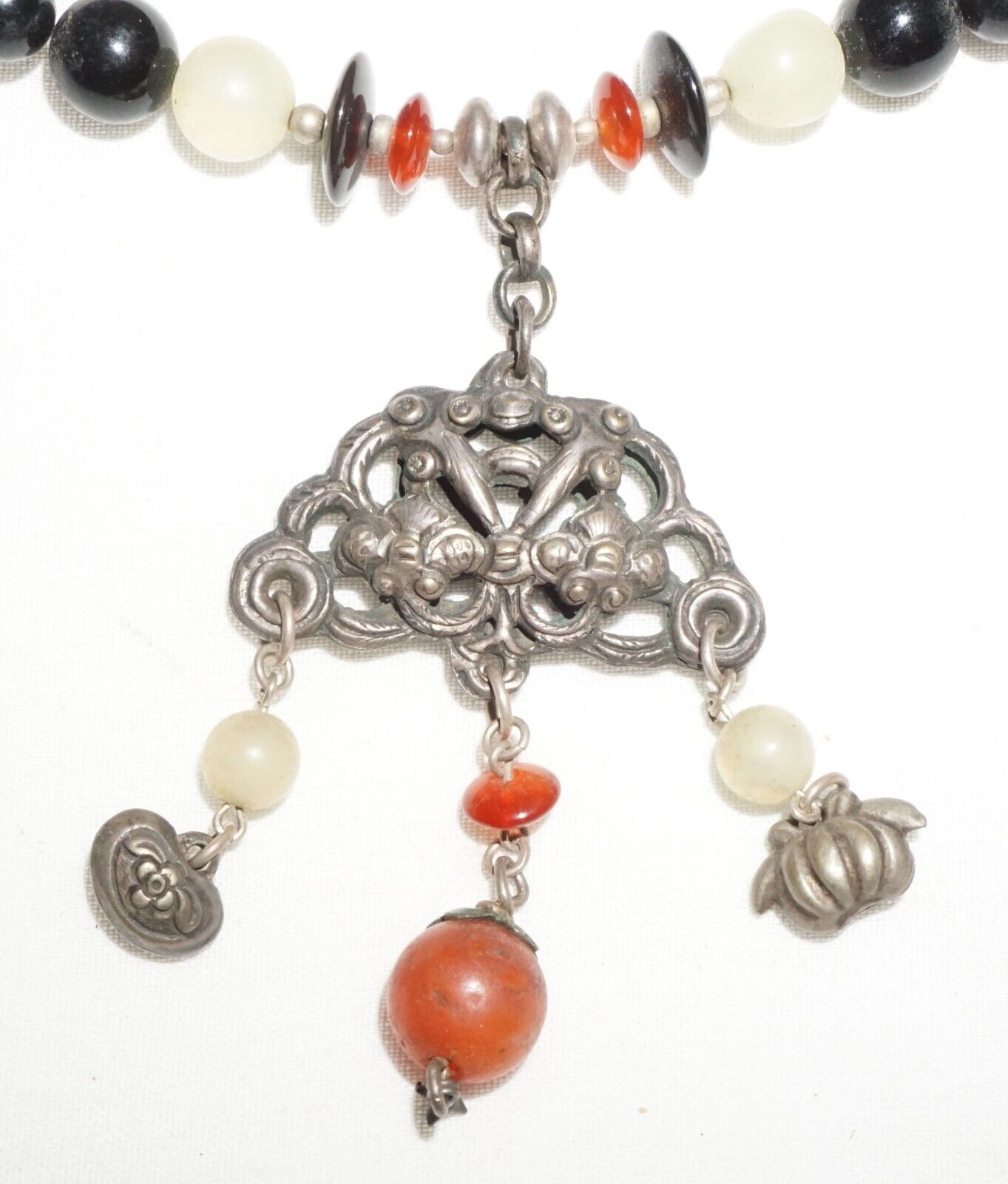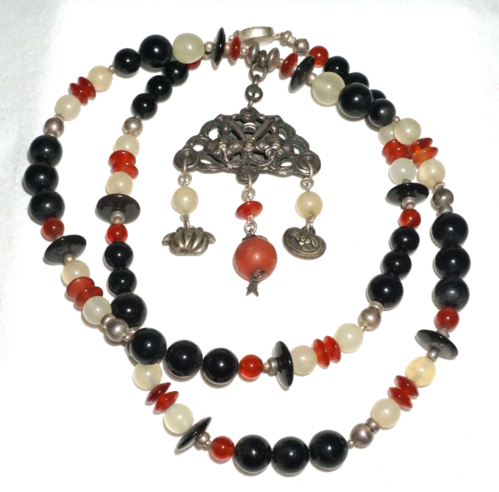 Vintage Chinese Hard-stone Bead Necklace w. Old Silver Dangle Pendant (---)