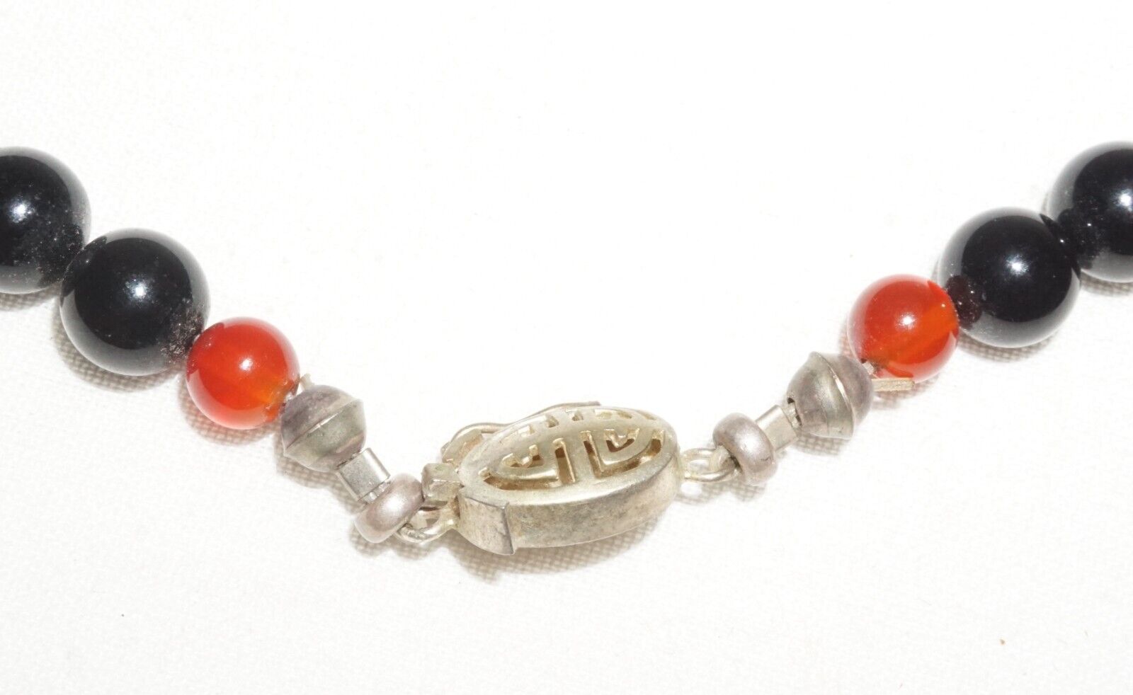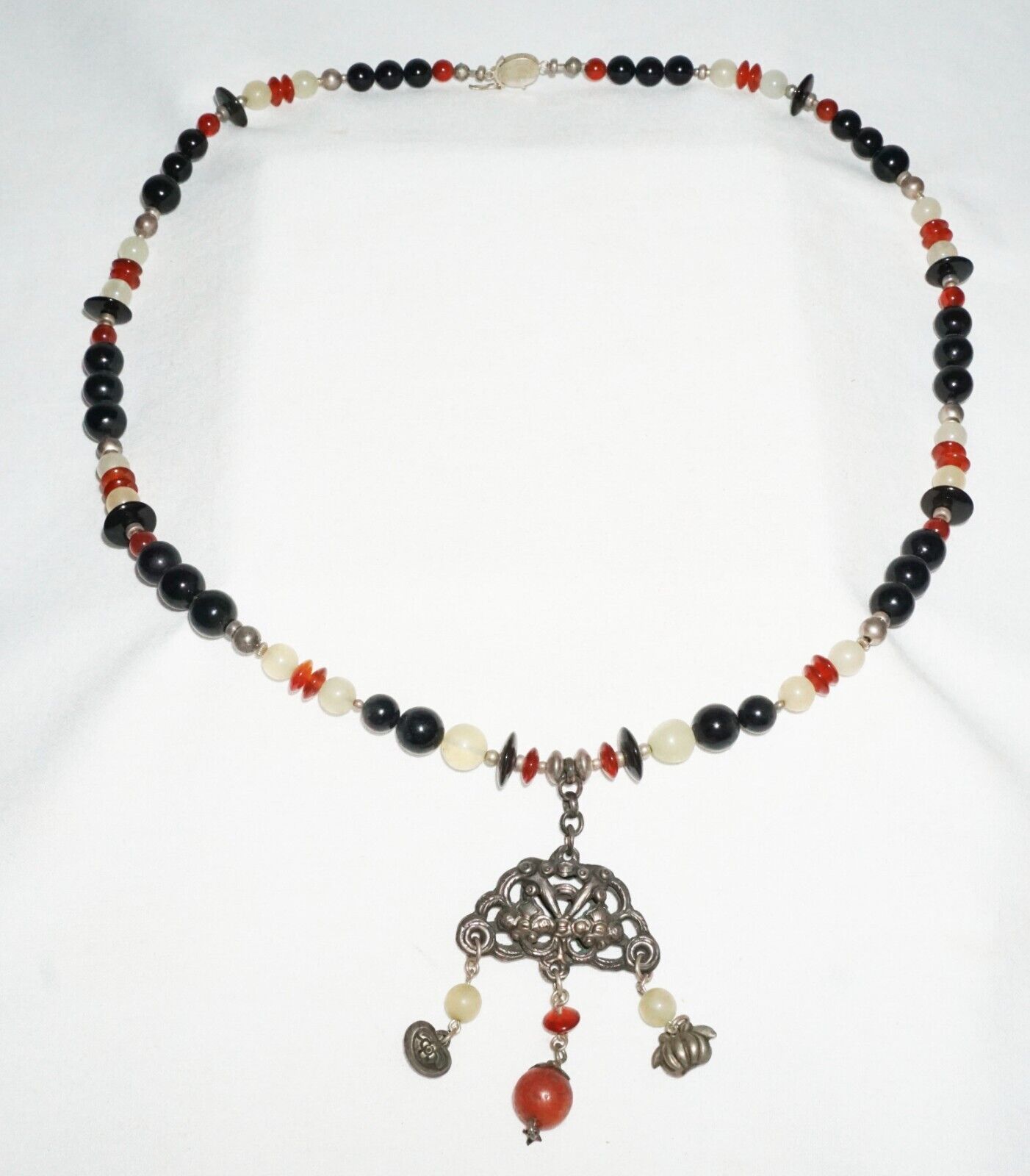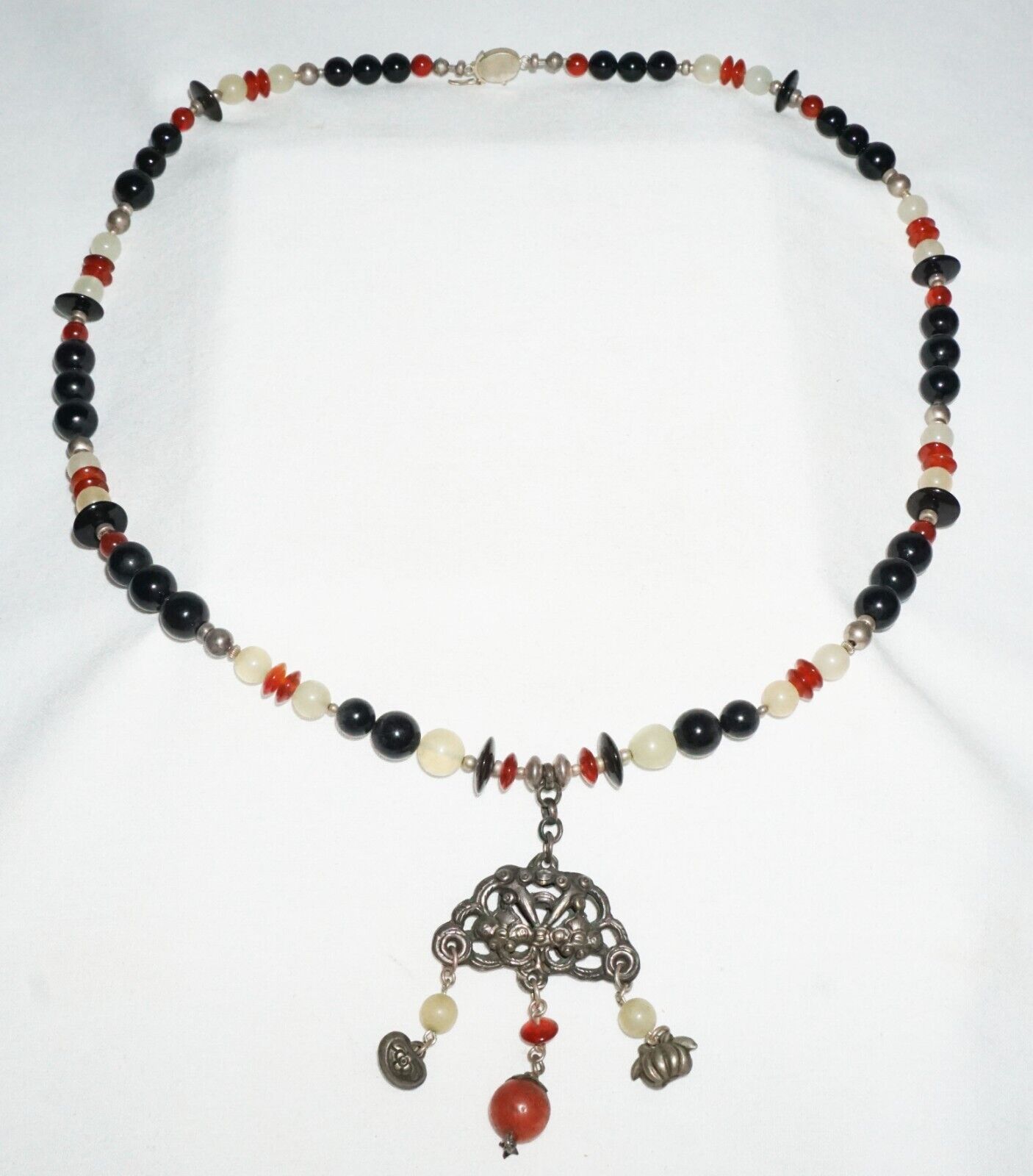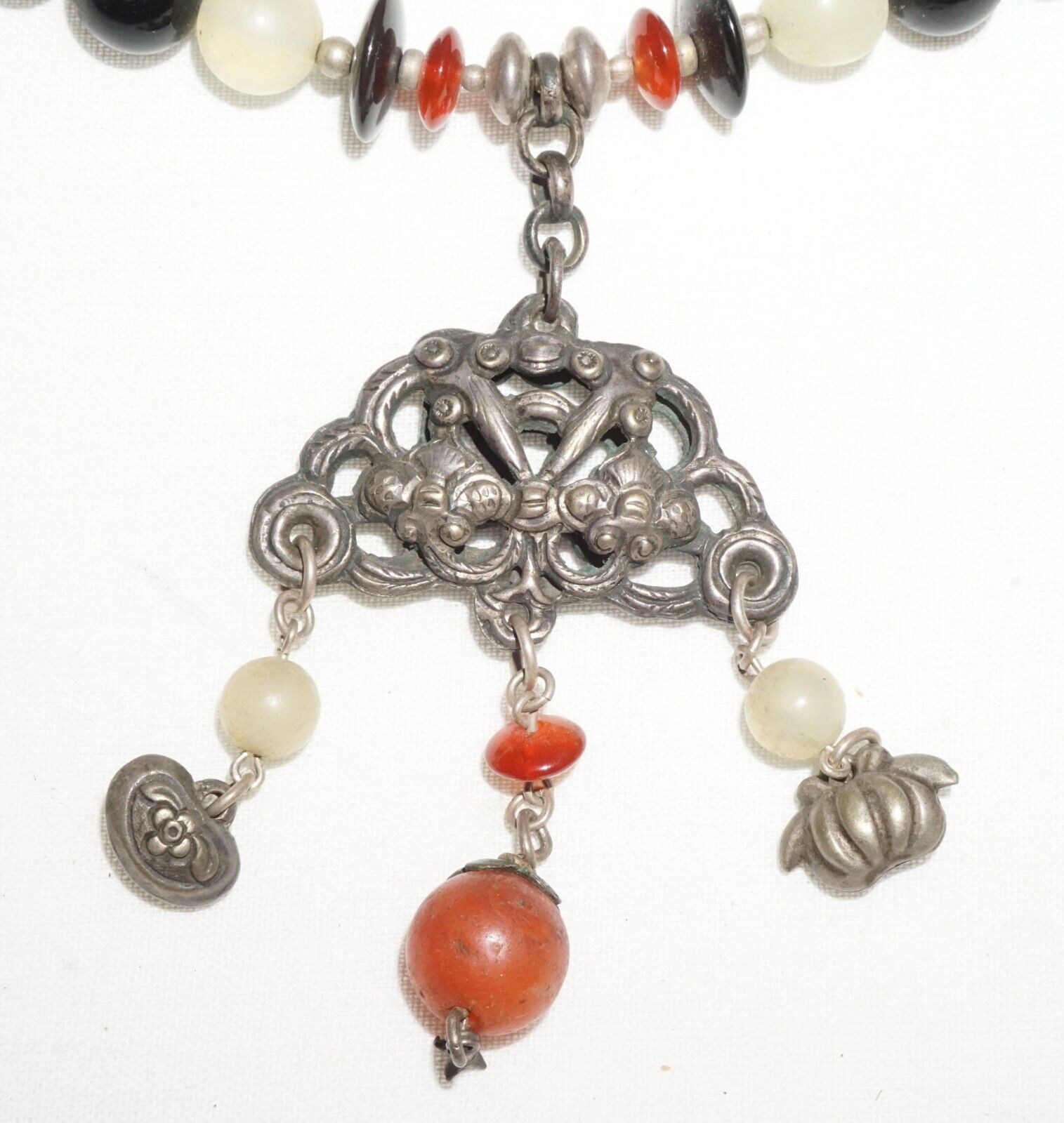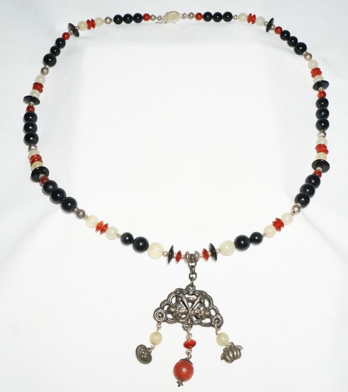 Vintage Chinese Hard-stone Bead Necklace w. Old Silver Dangle Pendant (---)