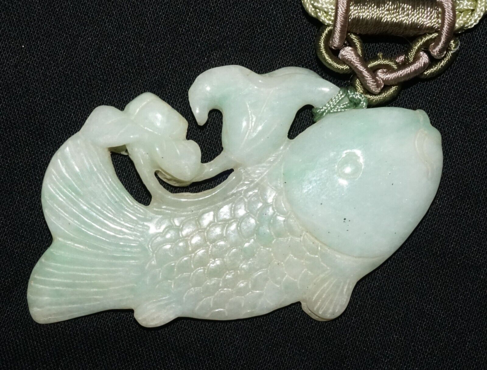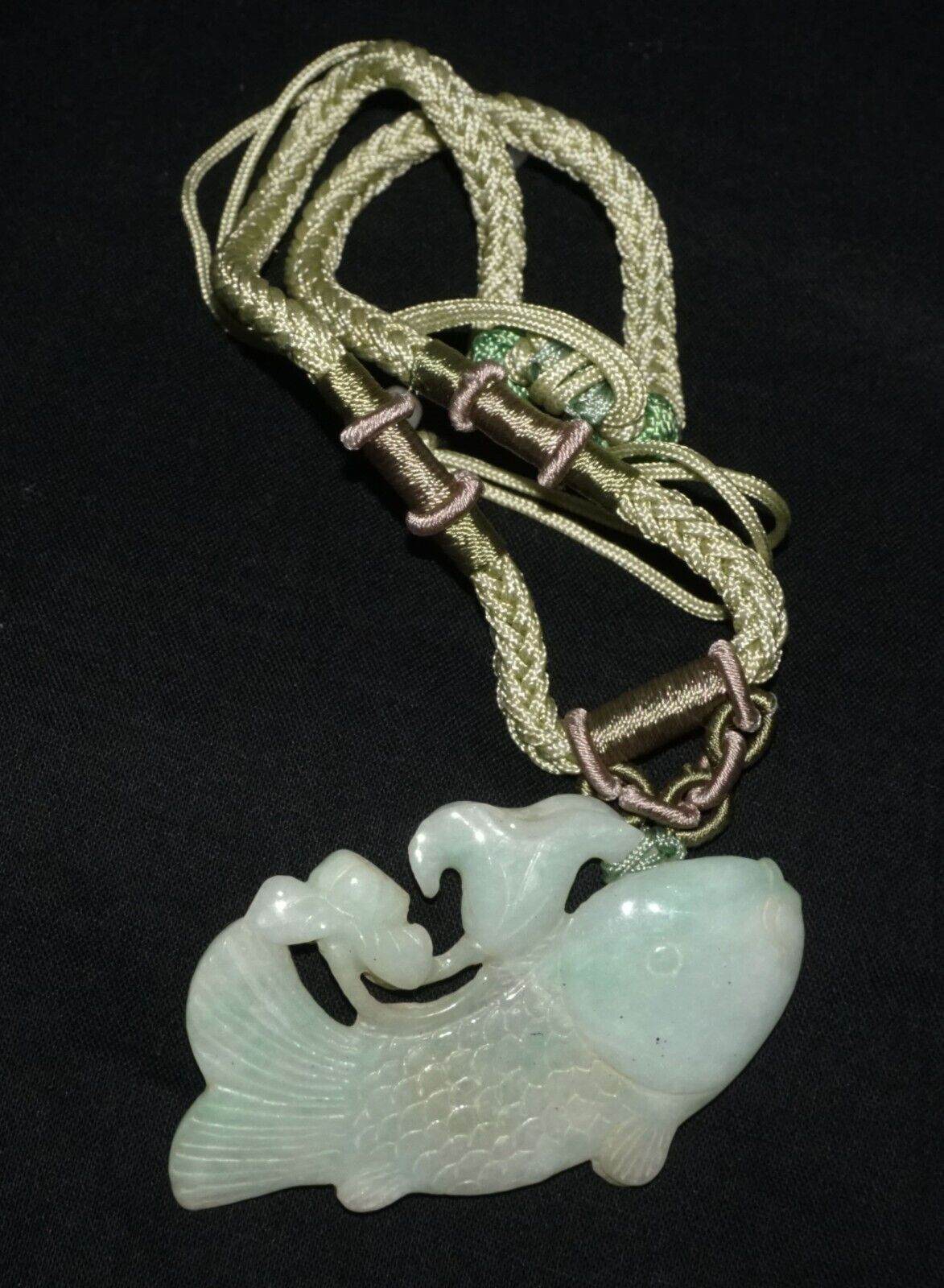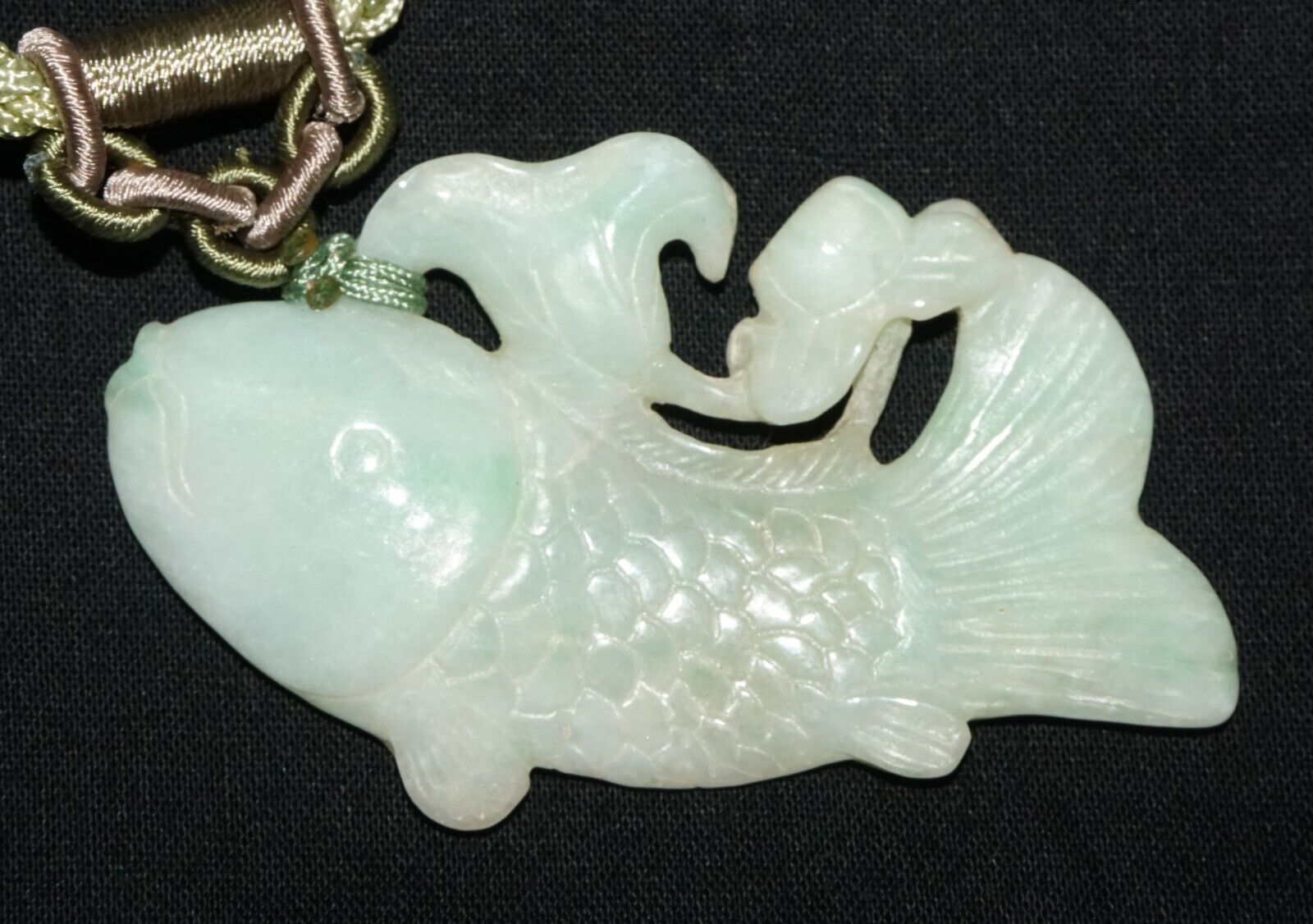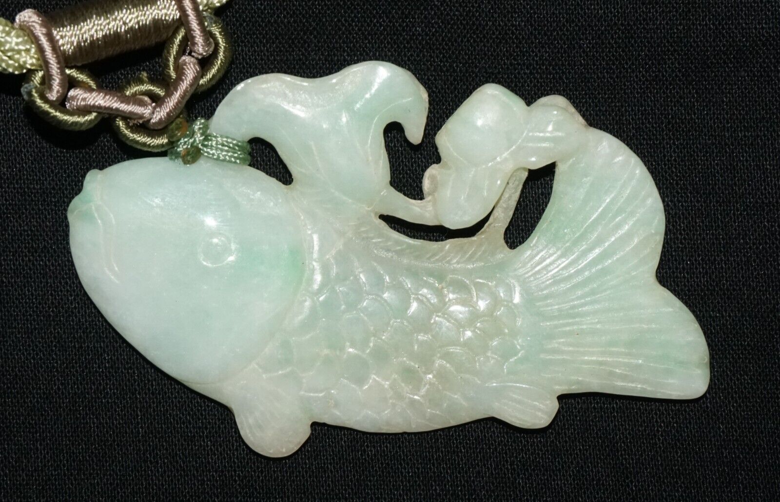 Vintage Chinese Jadeite Jade & Carp & Lotus Motif Carved Pendant (LeS)L23