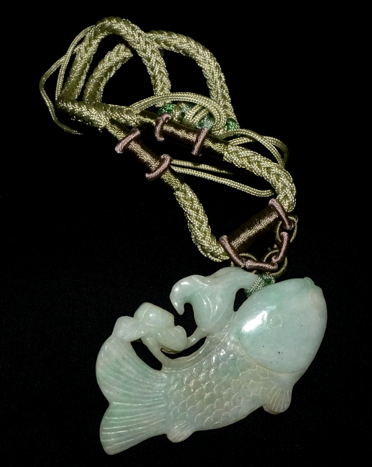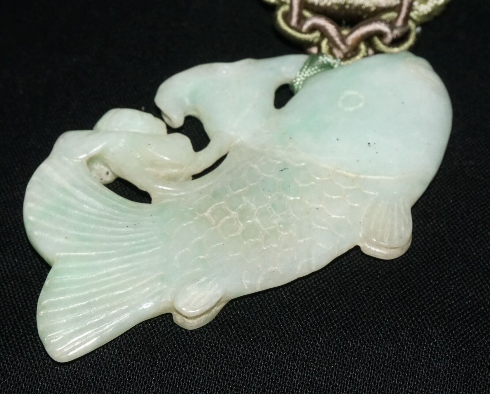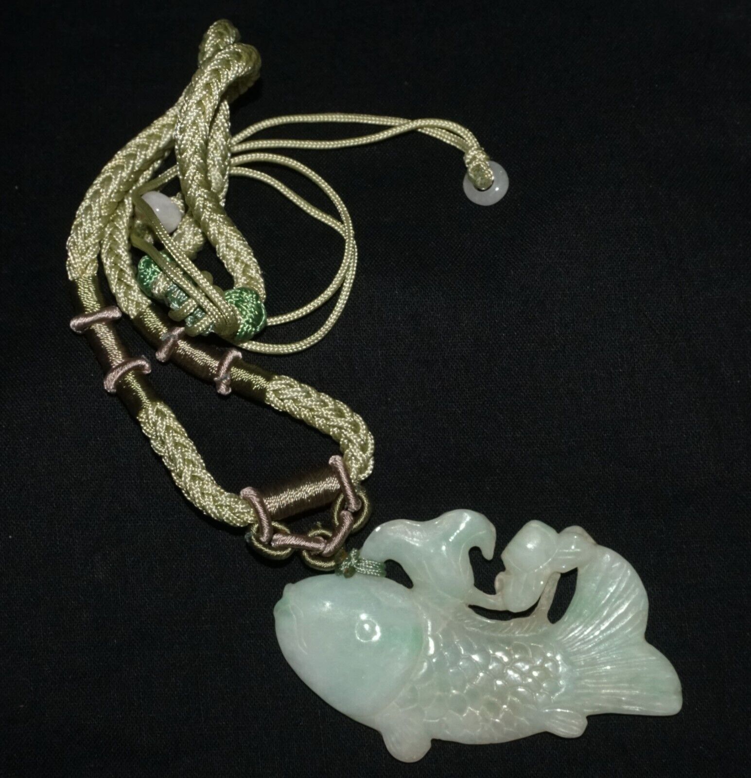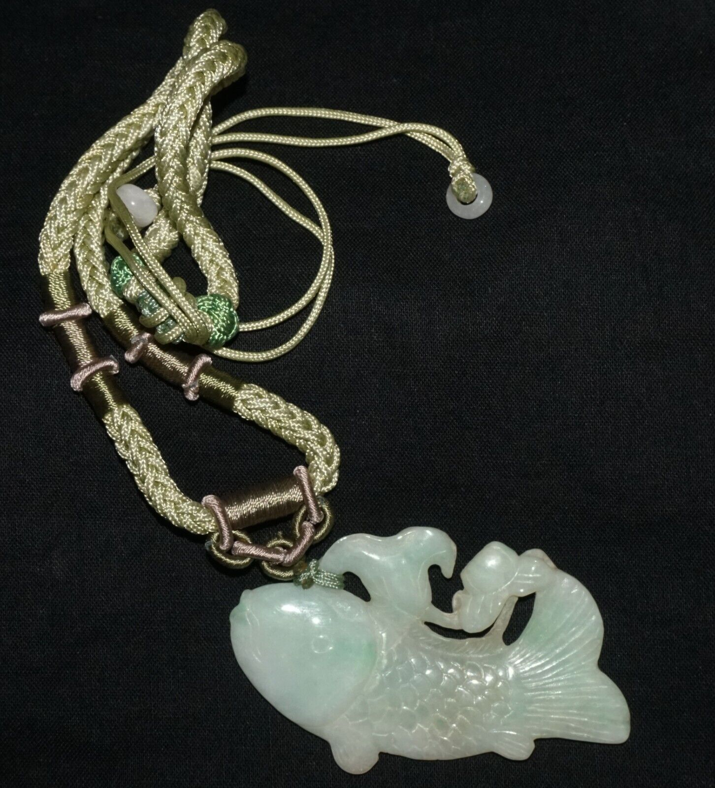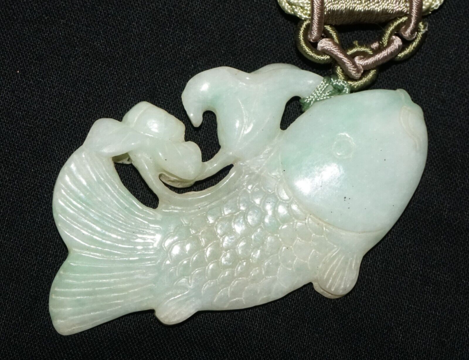 Vintage Chinese Jadeite Jade & Carp & Lotus Motif Carved Pendant (LeS)L23