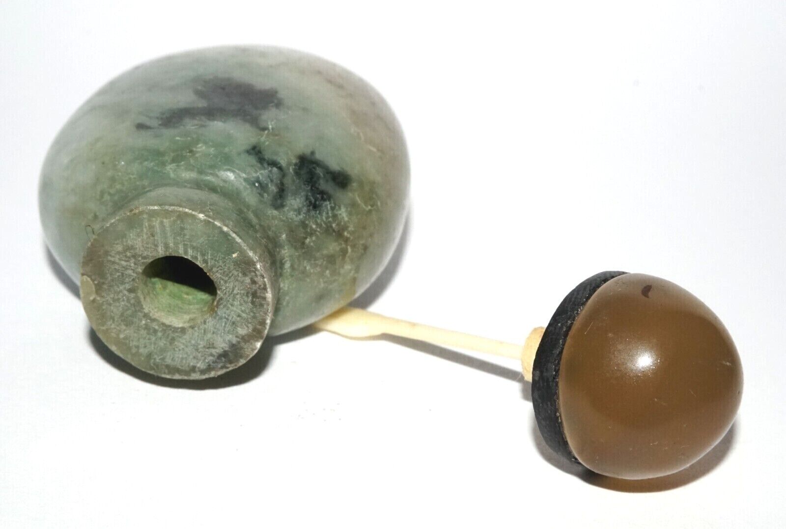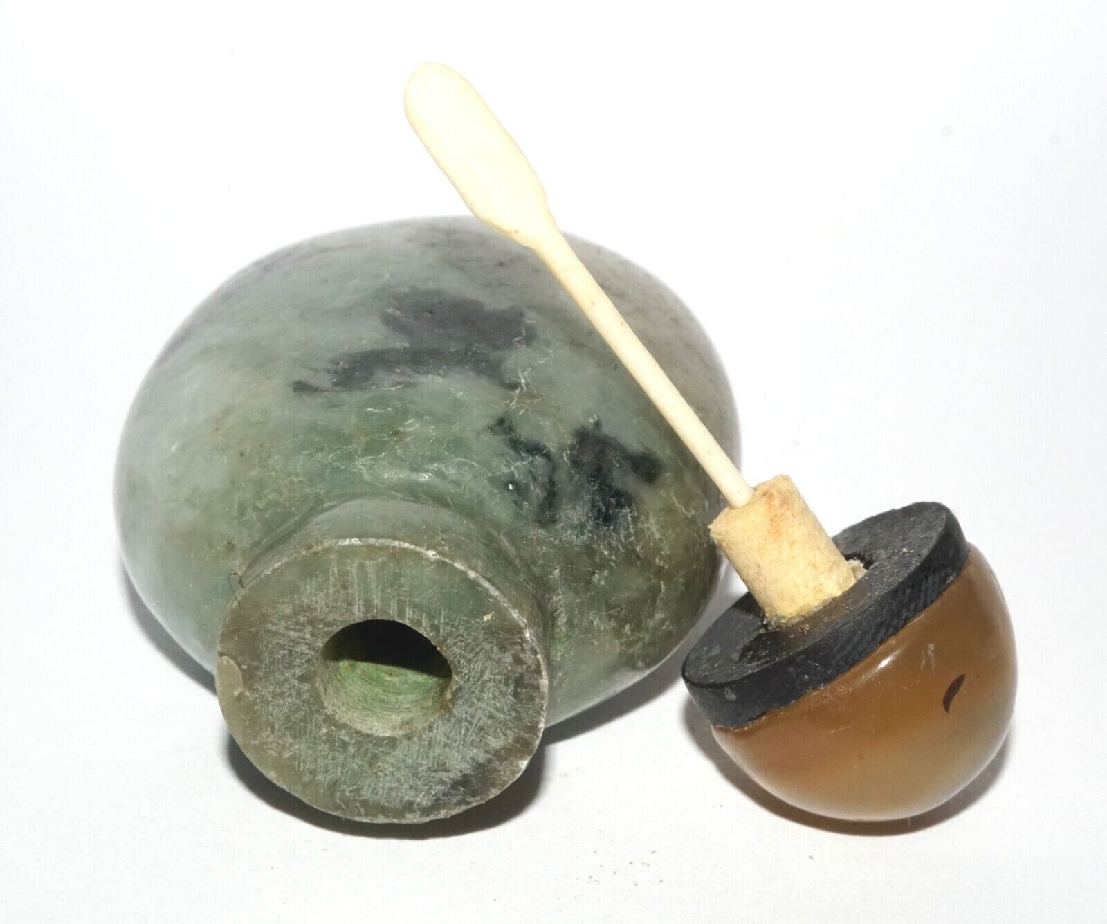 The item is good pre-owned condition, minor abrasions to the lip rim in places, would benefit from a thorough cleaning, the bottle tested jade, the bottle is well hollowed, the stopper top and spoon are in good condition