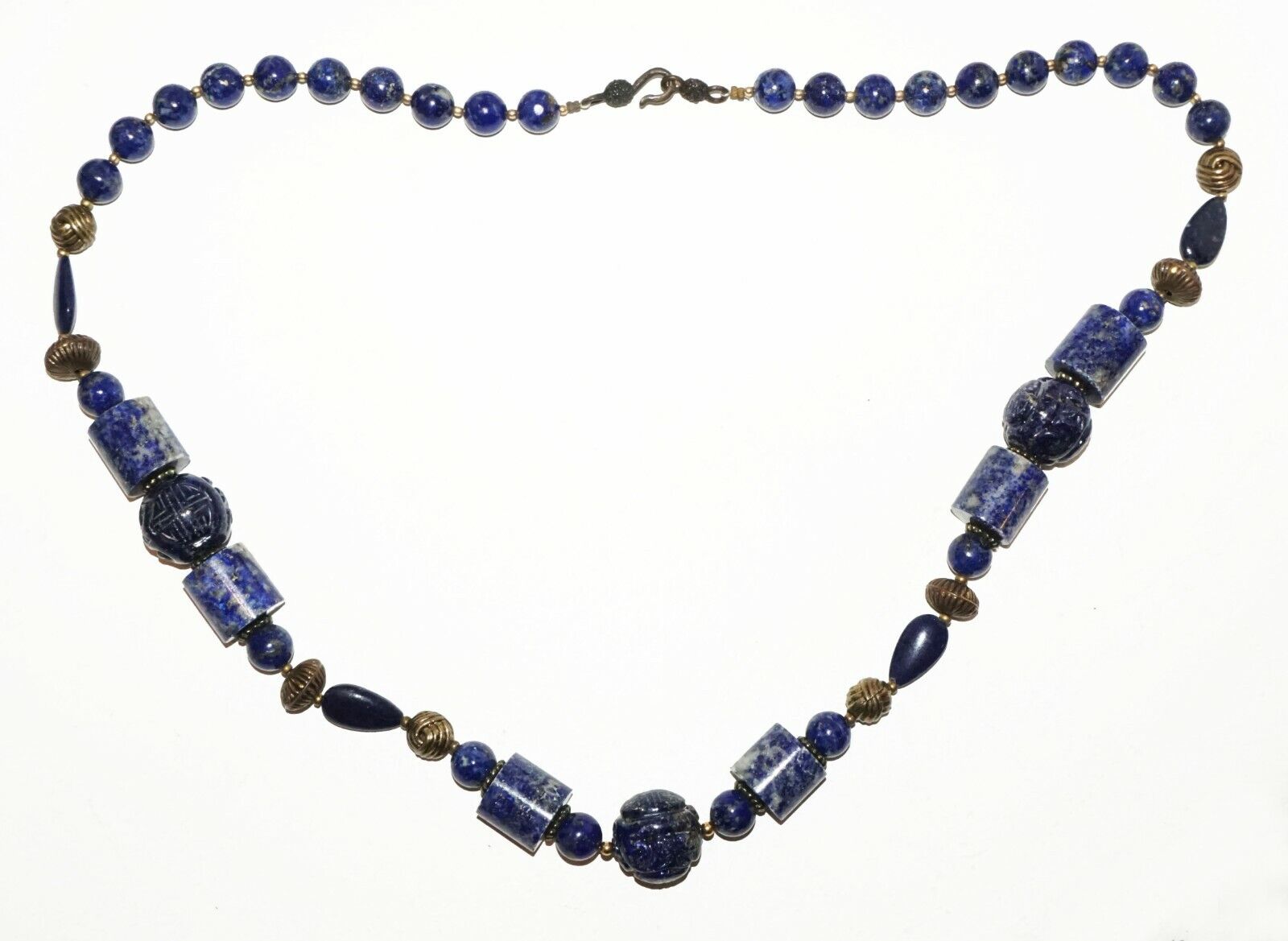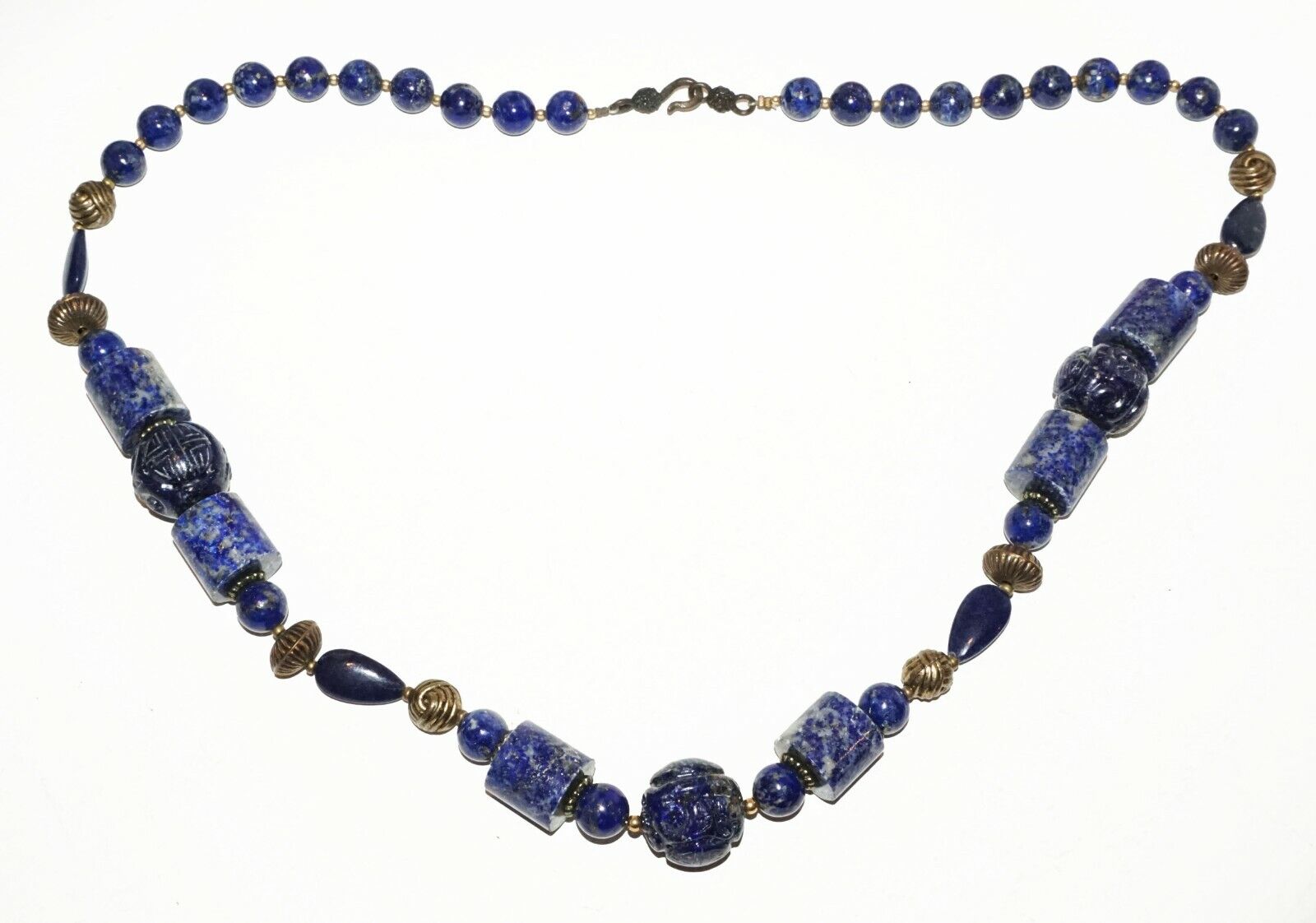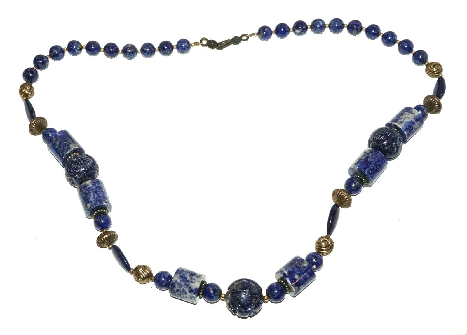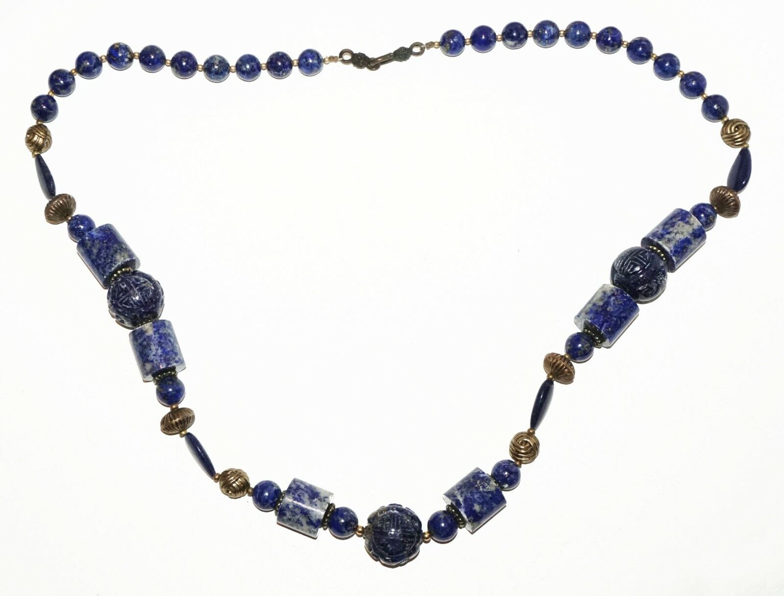 Up for sale from a recent estate in Honolulu Hawaii this Vintage Chinese style lapis lazuli plain and carved bead (beads range from 10mm to 20mm in diameter) necklace with some metal bead accents. The condition is described above for more information please check the photos.